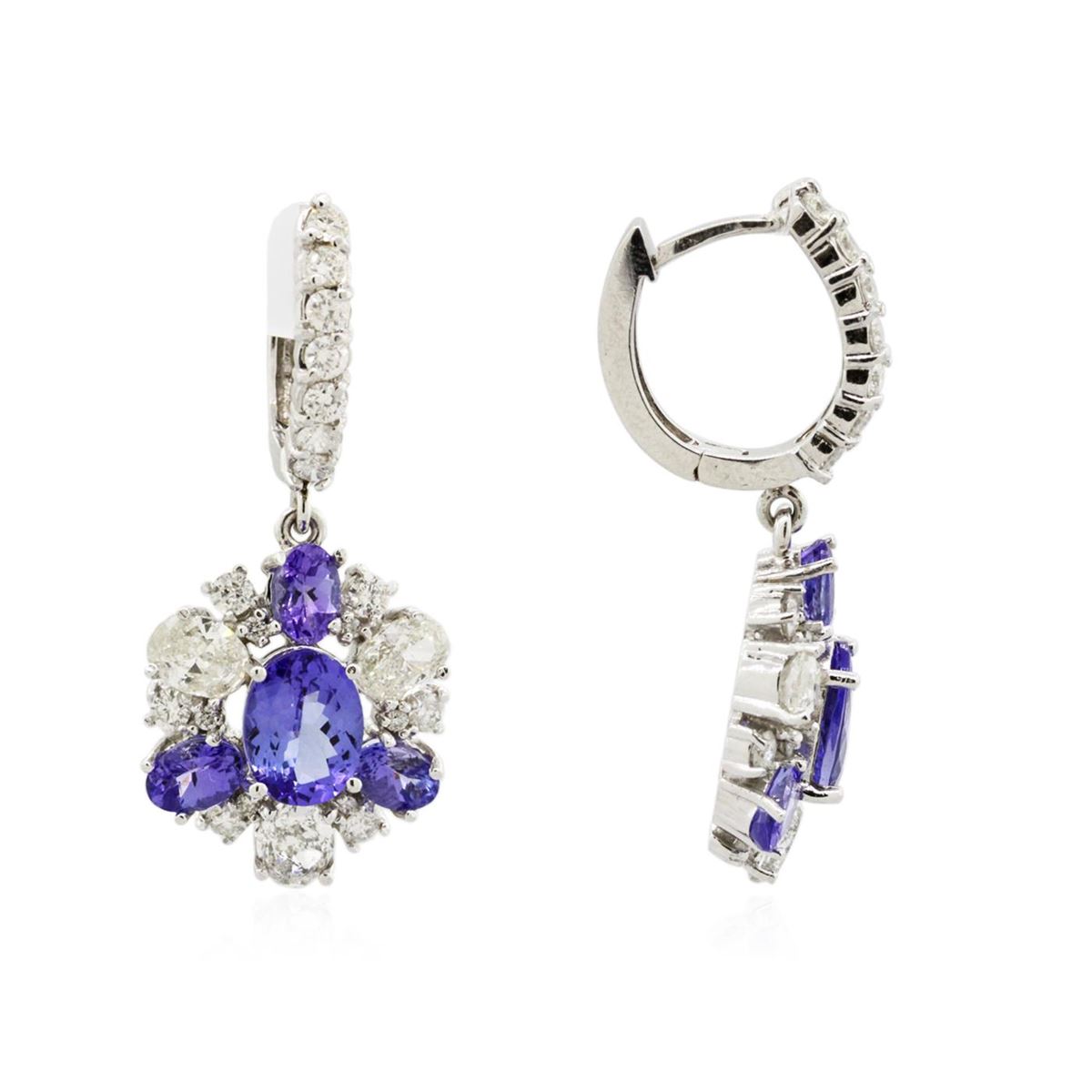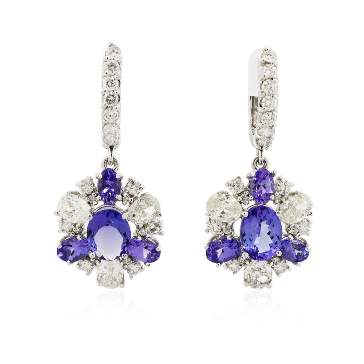 One pair electronically tested 14KT white gold ladies combination cast & assembled dangle earrings with hinged clip backs with a bright polish finish. Condition is new. Containing: Two prong set oval modified brilliant cut natural tanzanites, measuring 9.20 x 6.80 x 4.42mm, approximate. Total Weight of 3.80ct., clarity is eye clean, type I, medium, moderately strong, bluish violet color, (GIA bV 5/4), cut is good. Six prong set oval modified brilliant cut natural tanzanites, measuring 6.20 x 4.20 x 2.73mm, approximate. Total Weight of 2.94ct., clarity is eye clean, type I, medium, moderately strong, bluish violet color, (GIA bV 5/4), cut is good. Six prong set oval shaped cut diamonds, measuring 6.10 x 3.20 x 2.20mm (depth est.) approximate. Total Weight of 6 Stones = 1.77ct. Clarity: I-1 to I-2. Color: I - J, Cut is Good. Thirty-Eight prong set round brilliant cut diamonds, measuring 2.20 - 1.30 x 1.05mm (depth est.) approximate. Total Weight of 38 Stones = 0.75ct. Clarity: SI-2 to I-1. Color: I - J, Cut is Good. Colored gemstones are presumed to have been subjected to commonly used enhancement processes. All diamonds and colored gemstones are graded in the mounting, unless otherwise stated. Total Weight of Colored Stones 6.74ct. Total Weight of Diamonds 2.51ct. Total Weight of Earrings 13.00 grams. GGL Appraised at $17,830.00.