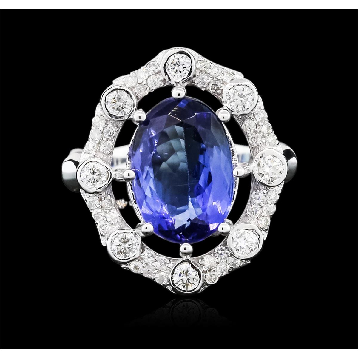 One electronically tested 14KT white gold ladies combination cast & assembled tanzanite and diamond ring with a bright polish finish. Identified with markings of "K14". Condition is new. Containing: One prong set oval oval modified brilliant cut natural tanzanite, measuring 12.35 x 10.00 x 6.50mm, approximate weight of 6.74ct., clarity is eye clean, type II, medium, moderately strong, violet color, (GIA V 5/4), cut is good. Eight prong set round brilliant cut diamonds, measuring 1.70 - 1.70 x 1.02mm (depth est.) approximate total weight of 8 Stones = 0.14ct. Clarity: SI-1 to SI-2. Color: I - J, Cut is Good. Forty-Five prong set round brilliant cut diamonds, measuring 1.00 - 1.00 x 0.60mm (depth est.) approximate total weight of 45 Stones = 0.16ct. Clarity: I-1. Color: I - J, Cut is Good. Colored gemstones are presumed to have been subjected to commonly used enhancement processes. All diamonds and colored gemstones are graded in the mounting, unless otherwise stated. Total Weight of Colored Stones 6.74ct. Total Weight of Diamonds 0.31ct. Total Weight of Ring 4.30 grams. GGL Appraised at $5,995.00.