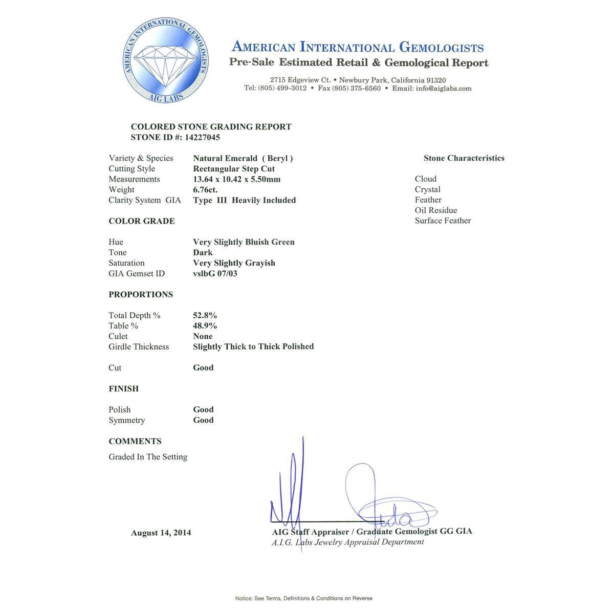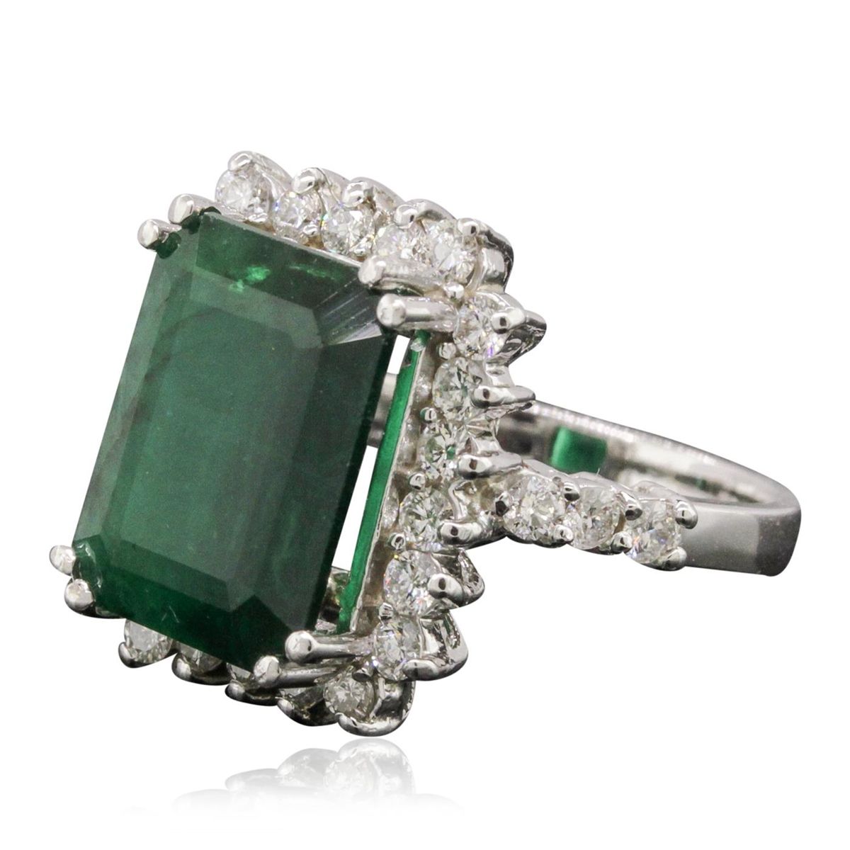 One electronically tested 14KT white gold ladies cast emerald and diamond ring with a bright polish finish. Condition is new, good workmanship. The featured emerald is set within a diamond bezel supported by diamond set shoulders, completed by a two and one-half millimeter wide band. Identified with markings of "K14". Containing: One prong set rectangular step cut natural emerald, measuring 13.64 x 10.42 x 5.50mm, 6%. bulge factor, approximate weight of 6.76ct., clarity is heavily included, type III, dark, very slightly grayish, very slightly bluish green color, (GIA vslbG 7/3), cut is good. Transmitting light somewhat diffusely, transparent to translucent. Naturally occurring internal & external characteristics are present. Indications of oil residue. Colored Stone Grading Report attached. Graded in the setting. Twenty-Eight prong set round brilliant cut diamonds, measuring 2.10 - 2.00 x 1.23mm (depth est.) approximate. Total Weight of 28 Stones = 0.98ct. Graded in the setting. Clarity: SI-1 to I-1. Color: G - I. Total Weight of Colored Stones 6.76ct. Total Weight of Diamonds 0.98ct. Total Weight of Ring 7.46gm. AIG Appraised at $11,790.00.