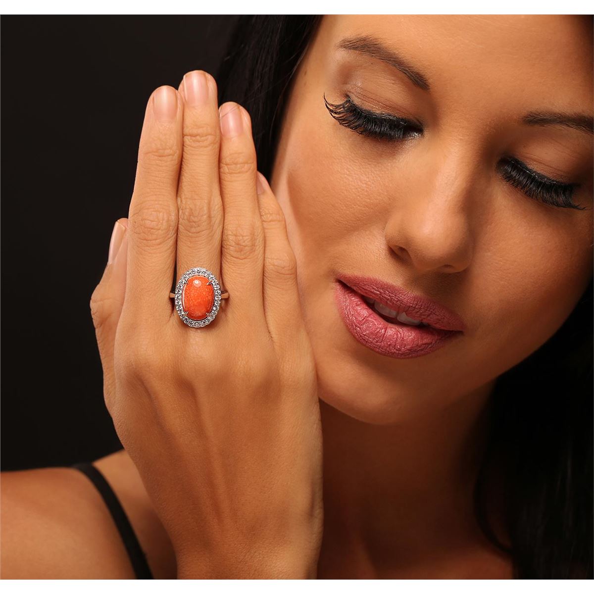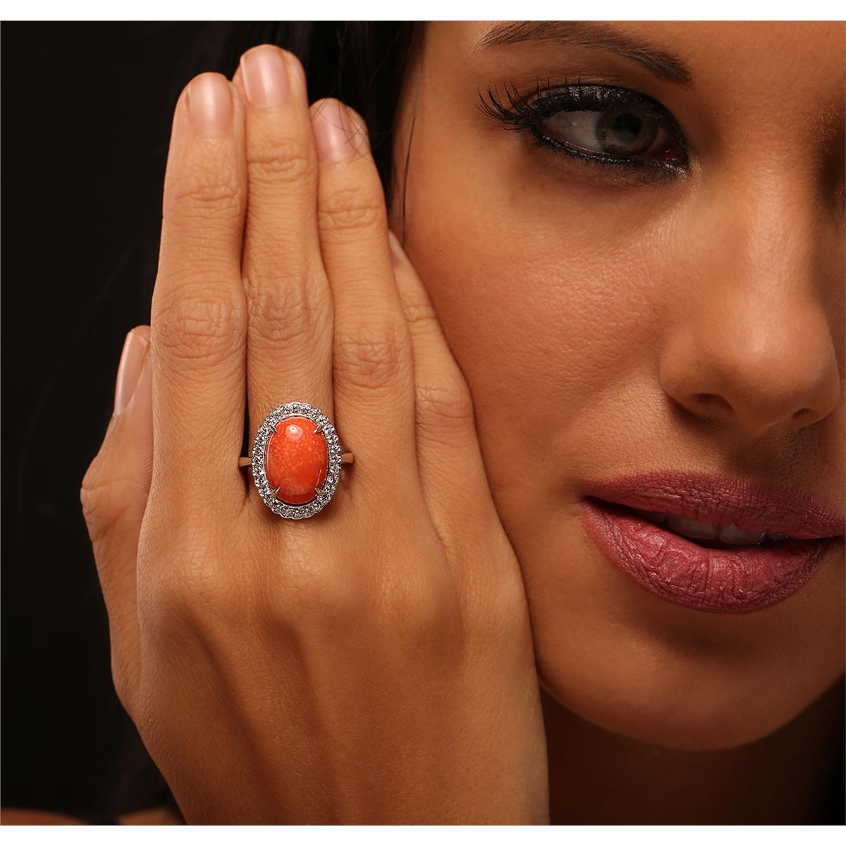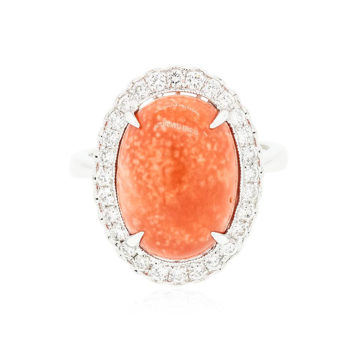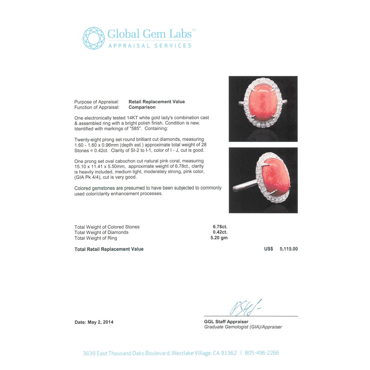 One electronically tested 14KT white gold Ladies combination cast & assembled ring with a bright polish finish. Condition is new. Identified with markings of "585". Containing: Twenty-Eight prong set round brilliant cut diamonds, measuring 1.60 - 1.60 x 0.96mm (depth est.) approximate. Total Weight of 28 Stones = 0.42ct. Clarity: SI-2 to I-1. Color: I - J, Cut is Good. One prong set oval cabochon cut natural pink coral, measuring 15.10 x 11.41 x 5.50mm, approximate weight of 6.78ct., clarity is heavily included, medium light, moderately strong, pink color, (GIA Pk 4/4), cut is very good. Colored gemstones are presumed to have been subjected to commonly used color/clarity enhancement processes. Total Weight of Colored Stones 6.78ct. Total Weight of Diamonds 0.42ct. Total Weight of Ring 5.20 grams. GGL Appraised at $5,115.00.