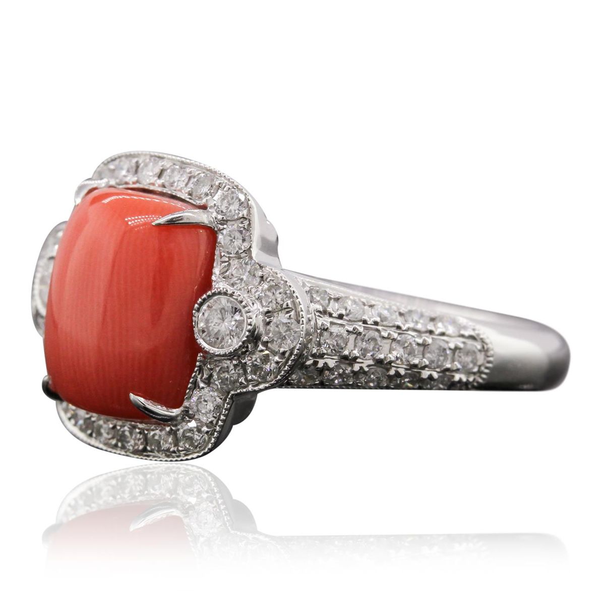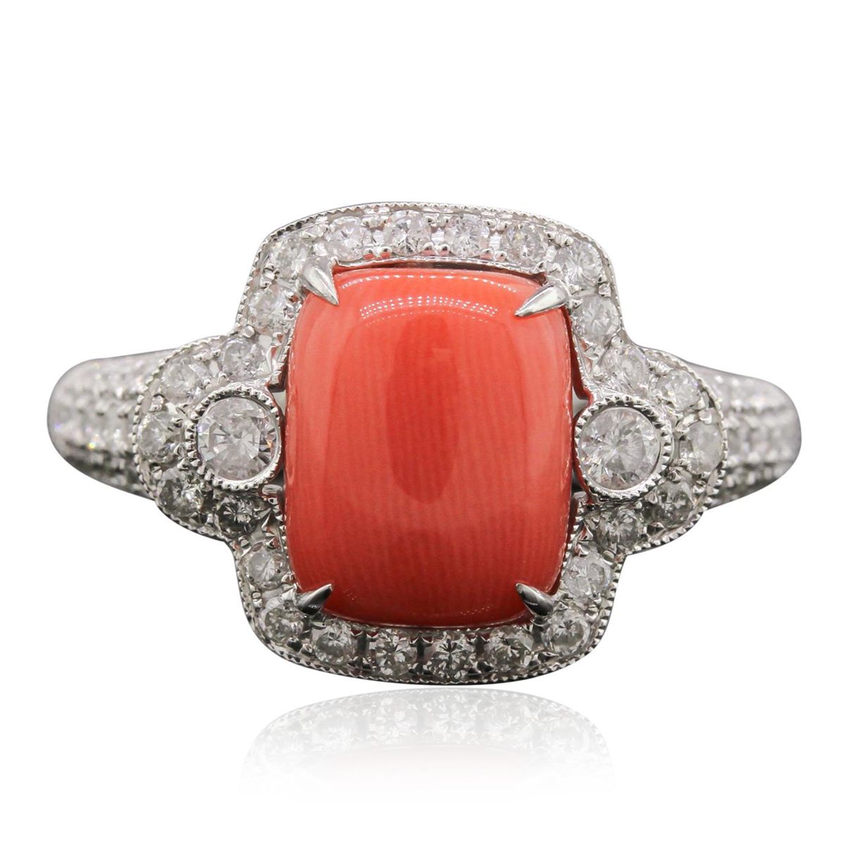 One electronically tested 14KT white gold Ladies combination cast & assembled ring with a bright polish finish. Condition is new. Identified with markings of "585". Containing: One prong set rectangular cushion cabochon cut natural pink coral, measuring 15.10 x 11.41 x 5.50mm, approximate weight of 6.78ct., clarity is heavily included, medium light, moderately strong, pink color, (GIA Pk 4/4), cut is very good. Colored gemstones are presumed to have been subjected to commonly used color/clarity enhancement processes. Two gypsy set round brilliant cut diamonds, measuring 2.50 - 2.50 x 1.50mm (depth est.) approximate. Total Weight of 2 Stones = 0.11ct. Clarity: I-1 to I-2. Color: H - I, Cut is Good. Fifty-Six prong set round brilliant cut diamonds, measuring 1.30 - 1.30 x 0.78mm (depth est.) approximate. Total Weight of 56 Stones = 0.45ct. Clarity: I-1 to I-2. Color: H - I, Cut is Good. Total Weight of Colored Stones 6.78ct. Total Weight of Diamonds 0.56ct. Total Weight of Ring 5.70 grams. GGL Appraised at $5,655.00.