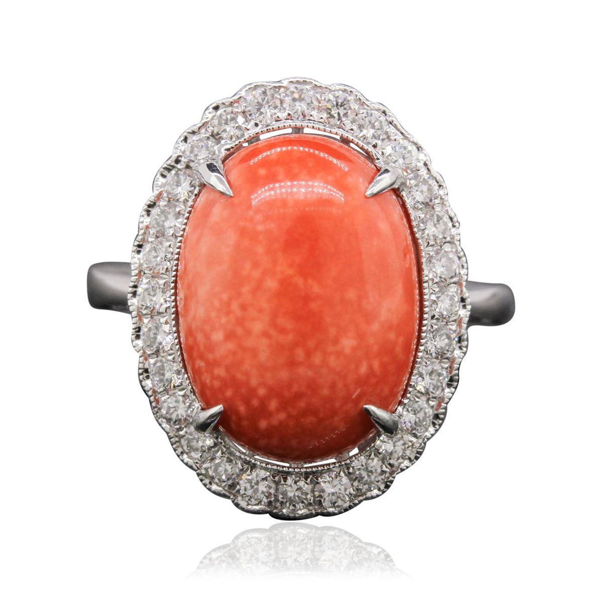 One electronically tested 14KT white gold Ladies combination cast & assembled ring with a bright polish finish. Condition is new. Identified with markings of "585". Containing: Twenty-Eight prong set round brilliant cut diamonds, measuring 1.60 - 1.60 x 0.96mm (depth est.) approximate. Total Weight of 28 Stones = 0.42ct. Clarity: SI-2 to I-1. Color: I - J, Cut is Good. One prong set oval cabochon cut natural pink coral, measuring 15.10 x 11.41 x 5.50mm, approximate weight of 6.78ct., clarity is heavily included, medium light, moderately strong, pink color, (GIA Pk 4/4), cut is very good. Colored gemstones are presumed to have been subjected to commonly used color/clarity enhancement processes. Total Weight of Colored Stones 6.78ct. Total Weight of Diamonds 0.42ct. Total Weight of Ring 5.20 grams. GGL Appraised at $5,115.00.