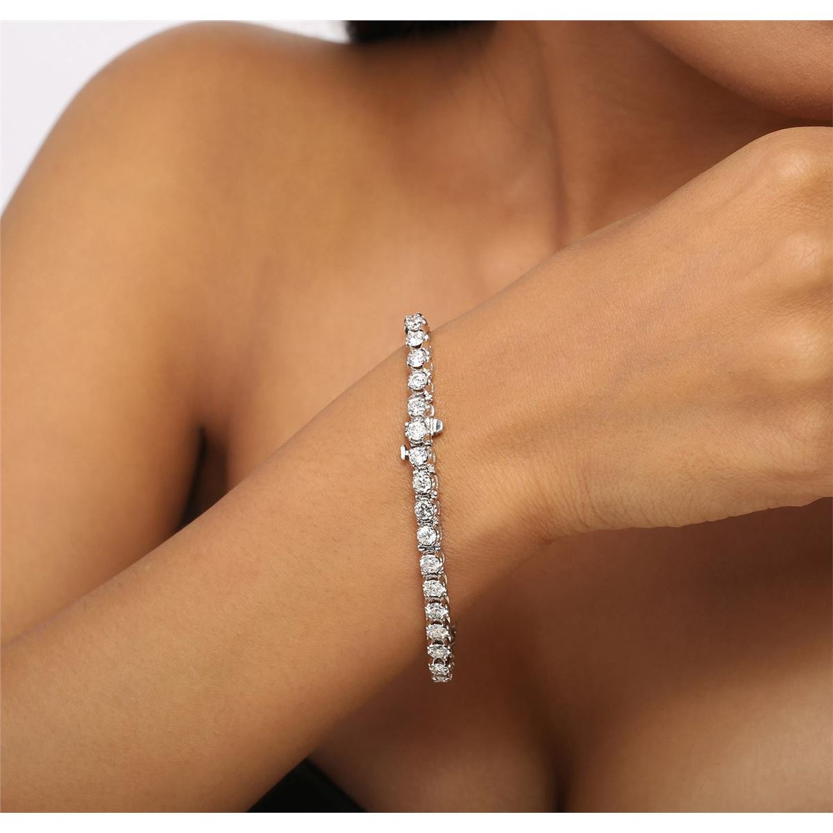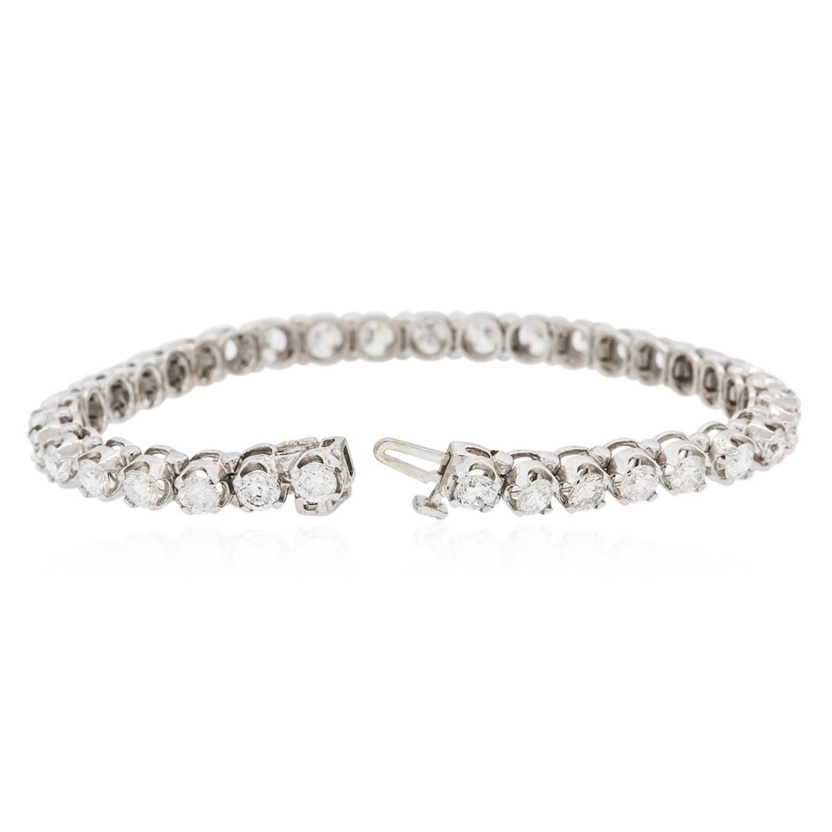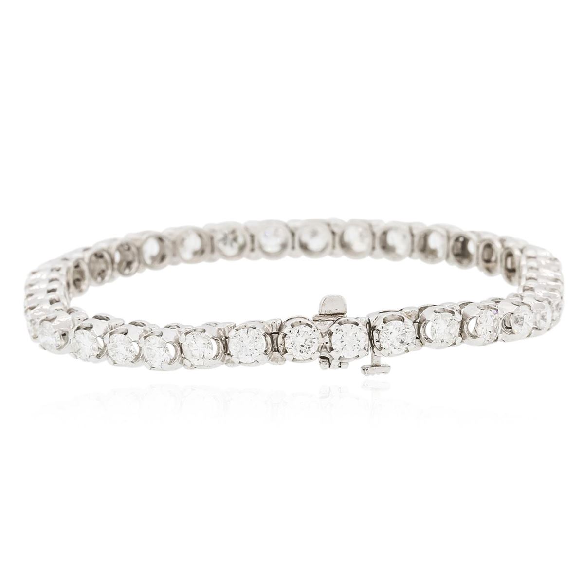 One electronically tested 14KT white gold ladies combination cast & assembled tennis bracelet with a hidden box clasp with a bright polish finish. Condition is new. Measurements: 6.85" in length. Identified with markings of "14K". Containing: Thirty-Five prong set round brilliant cut diamonds, measuring 3.50 - 3.50 x 2.10mm (depth est.) approximate total weight of 35 Stones = 6.80ct. Clarity: SI-2 to I-1. Color: H - J, Cut is Good. All diamonds are graded in the mounting, unless otherwise stated. Total Weight of Diamonds 6.80ct. Total Weight of Bracelet 16.10 grams. GGL Appraised at $29,615.00.