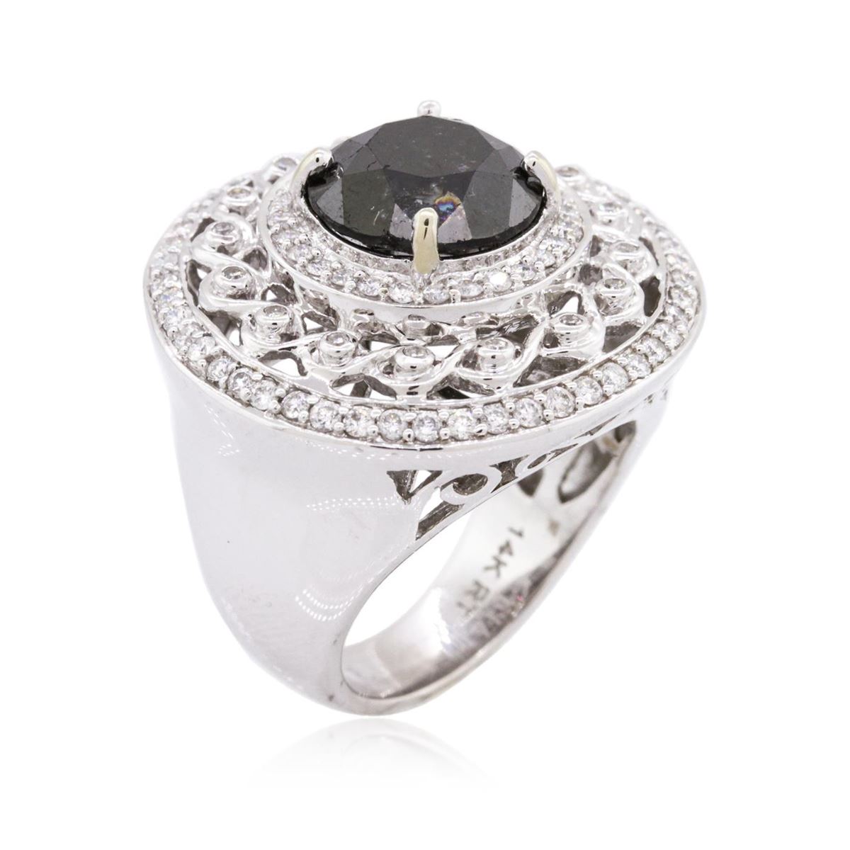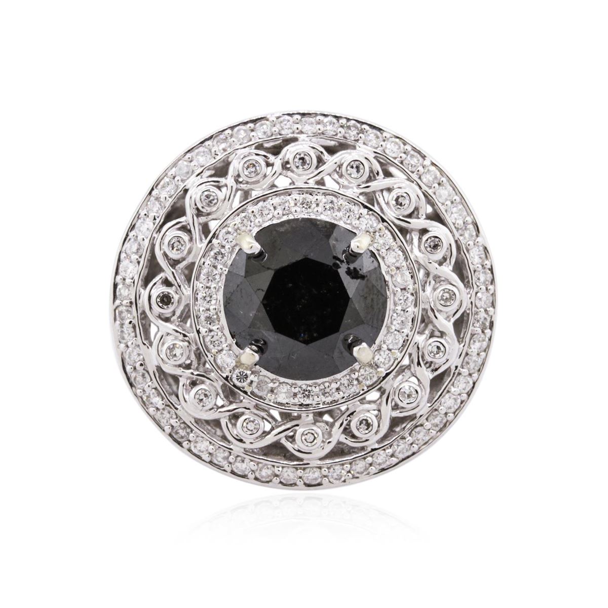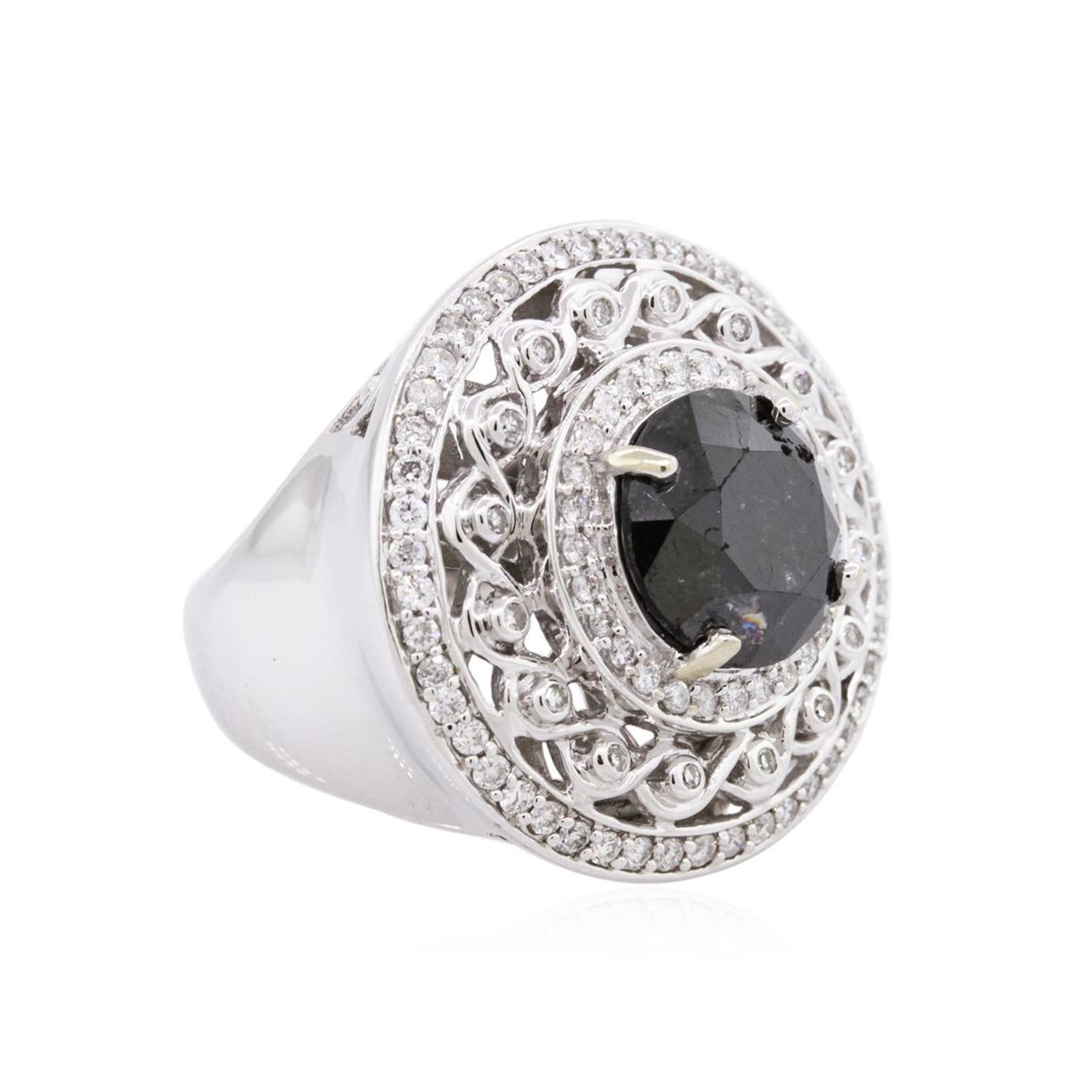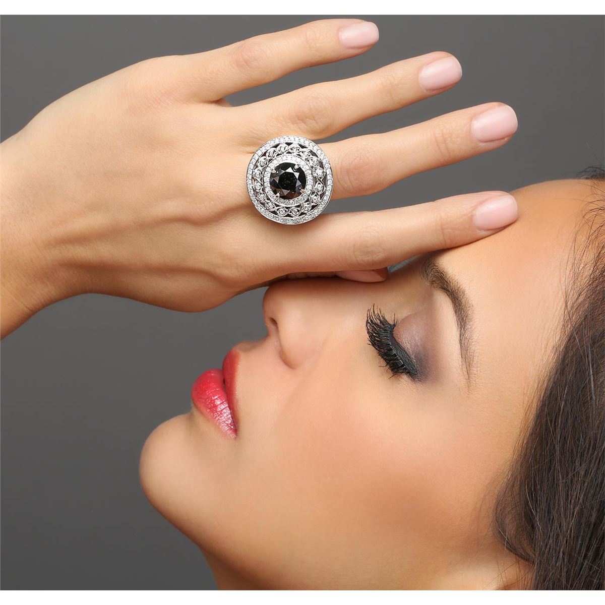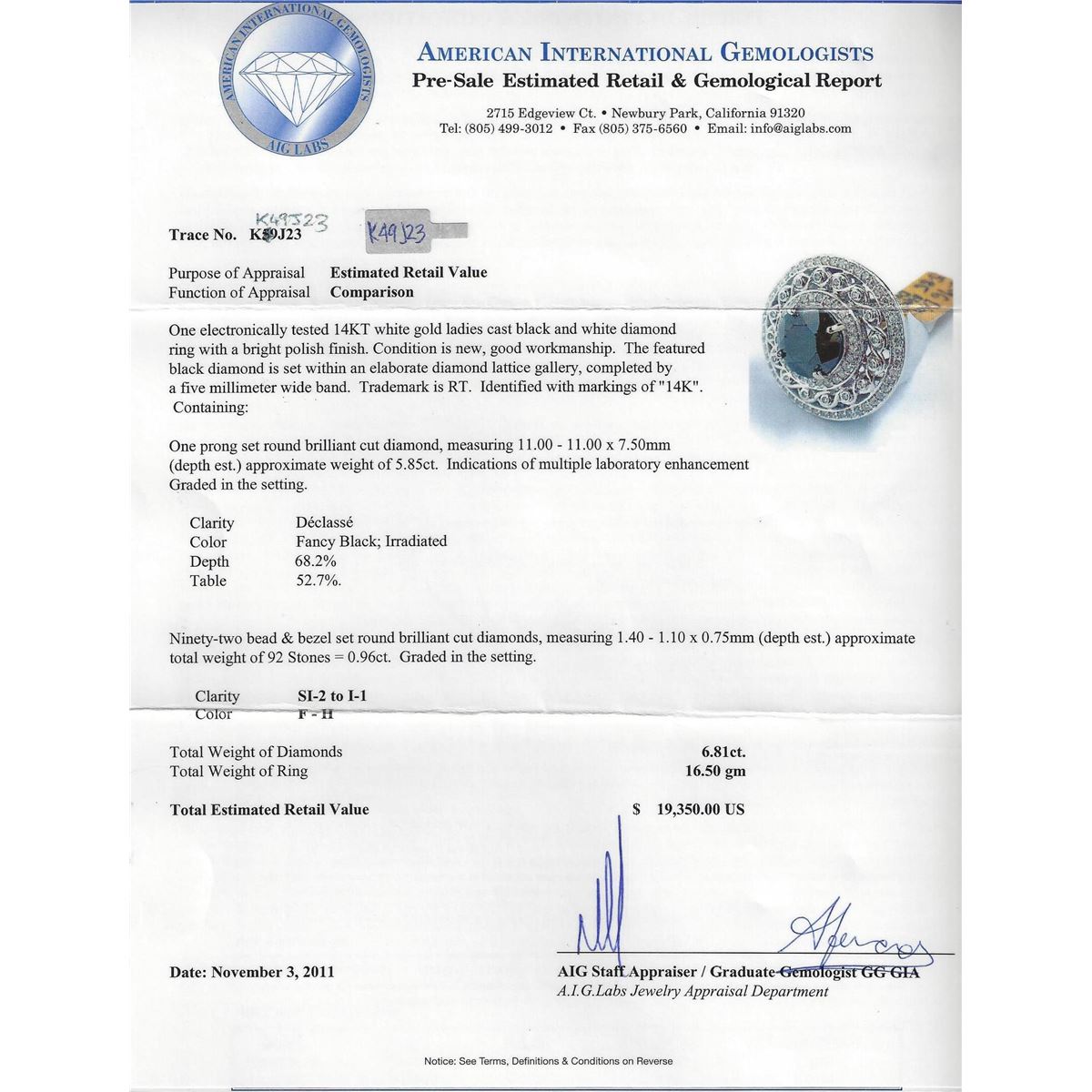 One electronically tested 14KT white gold ladies cast black and white diamond ring with a bright polish finish. Condition is new, good workmanship. The featured black diamond is set within an elaborate diamond lattice gallery, completed by a five millimeter wide band. Trademark is RT. Identified with markings of 14K. Containing: One prong set round brilliant cut diamond, measuring 11.00 - 11.00 x 7.50mm (depth est.) approximate weight of 5.85ct. Indications of multiple laboratory enhancement. Graded in the setting. Clarity: Declasse. Color: Fancy Black; Irradiated. Depth: 68.2%. Table: 52.7%. Ninety-two bead & bezel set round brilliant cut diamonds, measuring 1.40 - 1.10 x 0.75mm (depth est.) approximate total weight of 92 stones = 0.96ct. Graded in the setting. Clarity: SI-2 to I-1. Color: F-H. Total Weight of Diamonds 6.81ct. Total Weight of Ring: 16.50 grams. AIG Appraised at $19,350.00.
