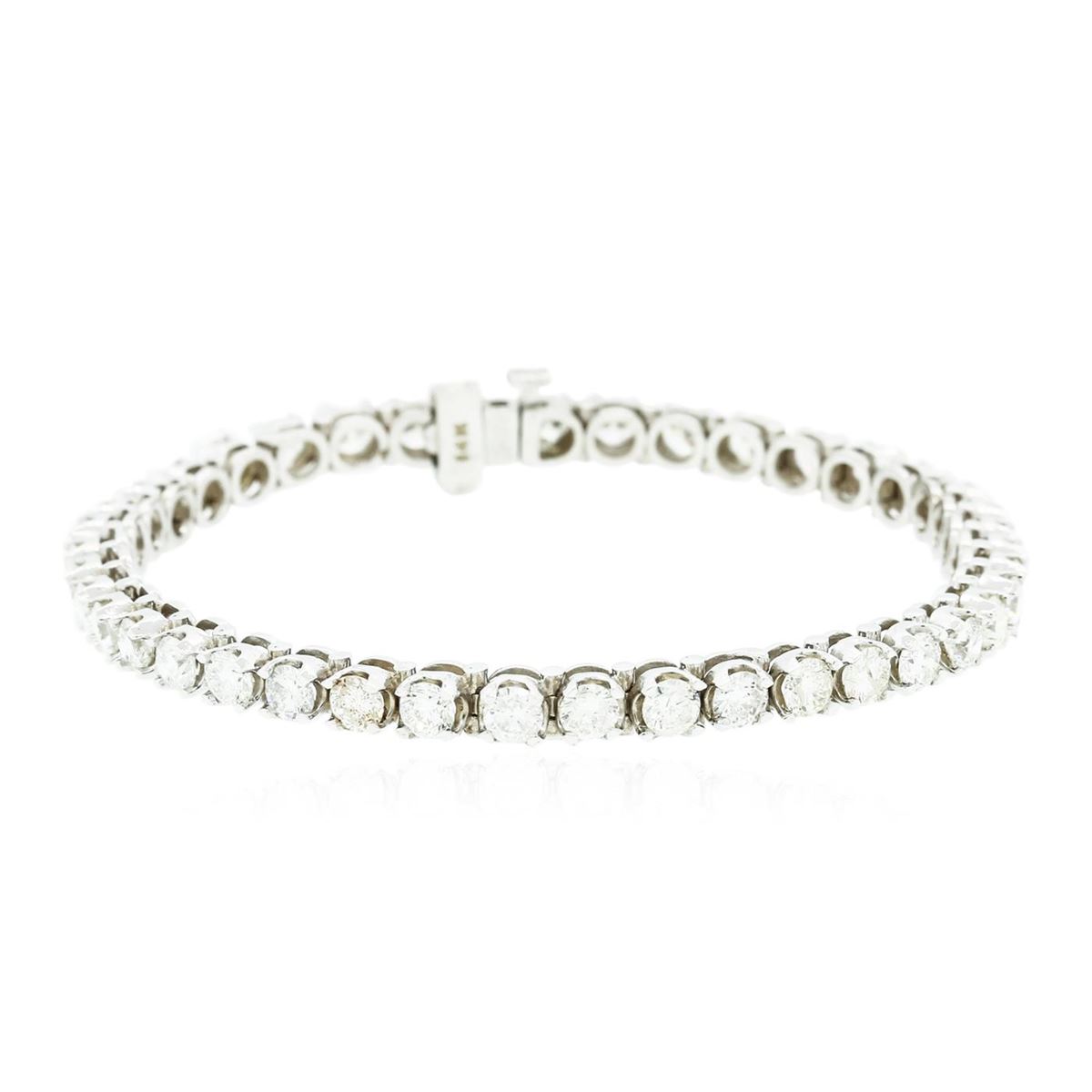 One electronically tested 14KT white gold ladies cast & assembled diamond tennis bracelet with a bright polish finish. Condition is new, good workmanship. Seven inch length bracelet composed of a flexible ribbon of diamonds, terminating in a concealed clasp with safety bar. Identified with markings of "14K". Tennis bracelets & necklaces got their unusual name from an incident involving the U.S. professional tennis player Chris Evert during a tennis match in the 1980's. Evert had been wearing an expensive diamond bracelet, an inline string of individually-set diamonds. Previously these bracelets were known as eternity bracelets. When the clasp snapped during play, she asked the officials to stop the tennis match until the bracelet could be found. Since that day, bracelets and necklaces featuring an inline string of diamonds have been called tennis bracelets and tennis necklaces. Containing: Forty-One prong set round brilliant cut diamonds, measuring 3.60 - 3.50 x 2.13mm (depth est.) approximate total weight of 41 Stones = 6.85ct. Graded in the setting. Clarity: I-1 to I-2. Color: G - J. Total Weight of Diamonds 6.85ct. Total Weight of Tennis Bracelet 14.30 grams. AIG Appraised at $17,785.00.