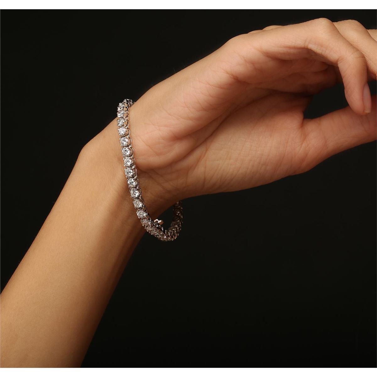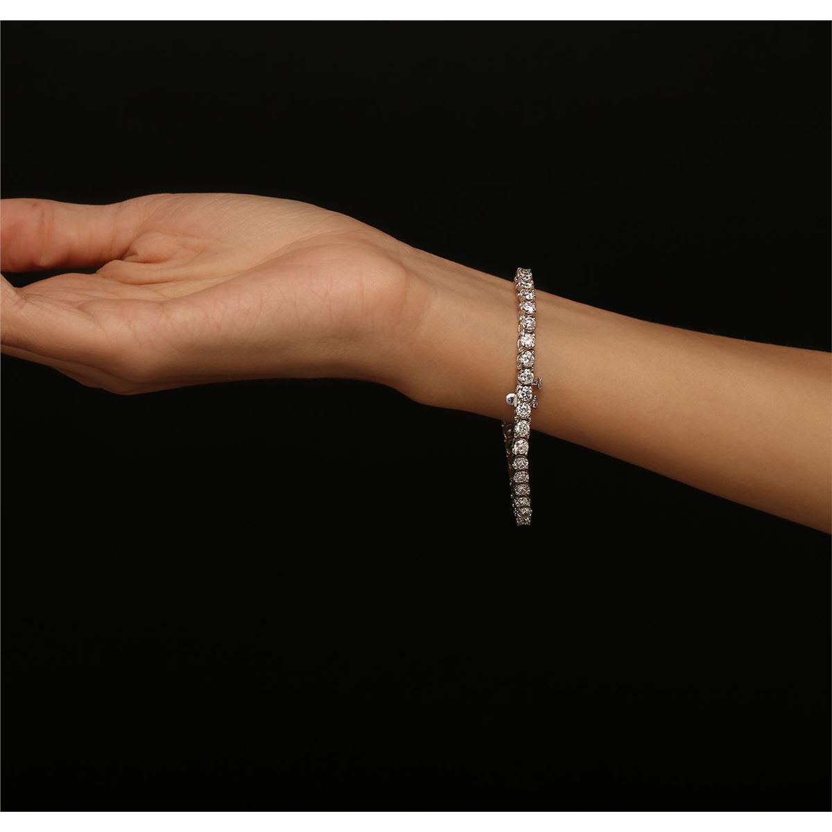 One electronically tested 14KT white gold ladies cast & assembled diamond tennis bracelet with a bright polish finish. Condition is new, good workmanship. Seven inch length bracelet composed of a flexible ribbon of diamonds, terminating in a concealed clasp with safety bar. Identified with markings of "14K". Tennis bracelets & necklaces got their unusual name from an incident involving the U.S. professional tennis player Chris Evert during a tennis match in the 1980's. Evert had been wearing an expensive diamond bracelet, an inline string of individually-set diamonds. Previously these bracelets were known as eternity bracelets. When the clasp snapped during play, she asked the officials to stop the tennis match until the bracelet could be found. Since that day, bracelets and necklaces featuring an inline string of diamonds have been called tennis bracelets and tennis necklaces. Containing: Forty-One prong set round brilliant cut diamonds, measuring 3.60 - 3.50 x 2.13mm (depth est.) approximate total weight of 41 Stones = 6.85ct. Graded in the setting. Clarity: I-1 to I-2. Color: G - J. Total Weight of Diamonds 6.85ct. Total Weight of Tennis Bracelet 14.30 grams. AIG Appraised at $17,785.00.