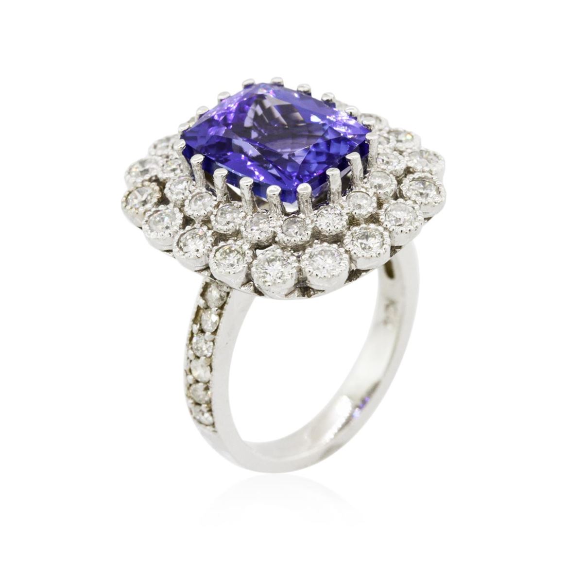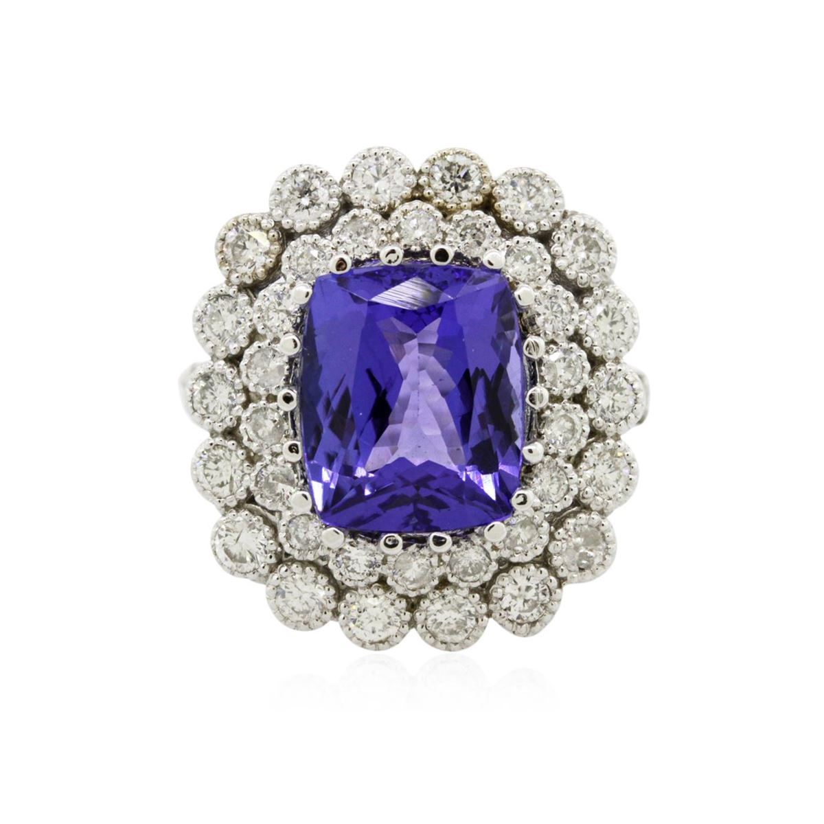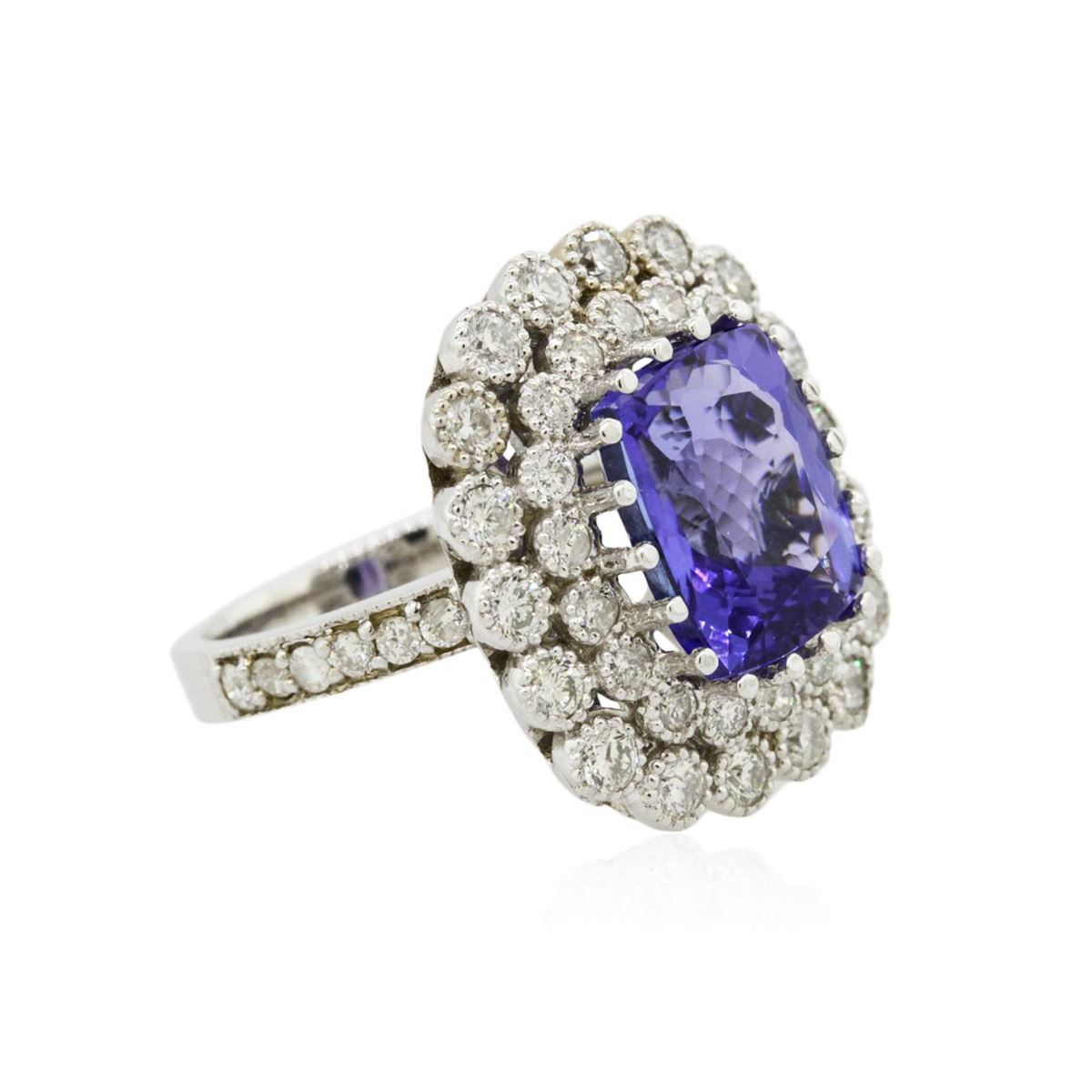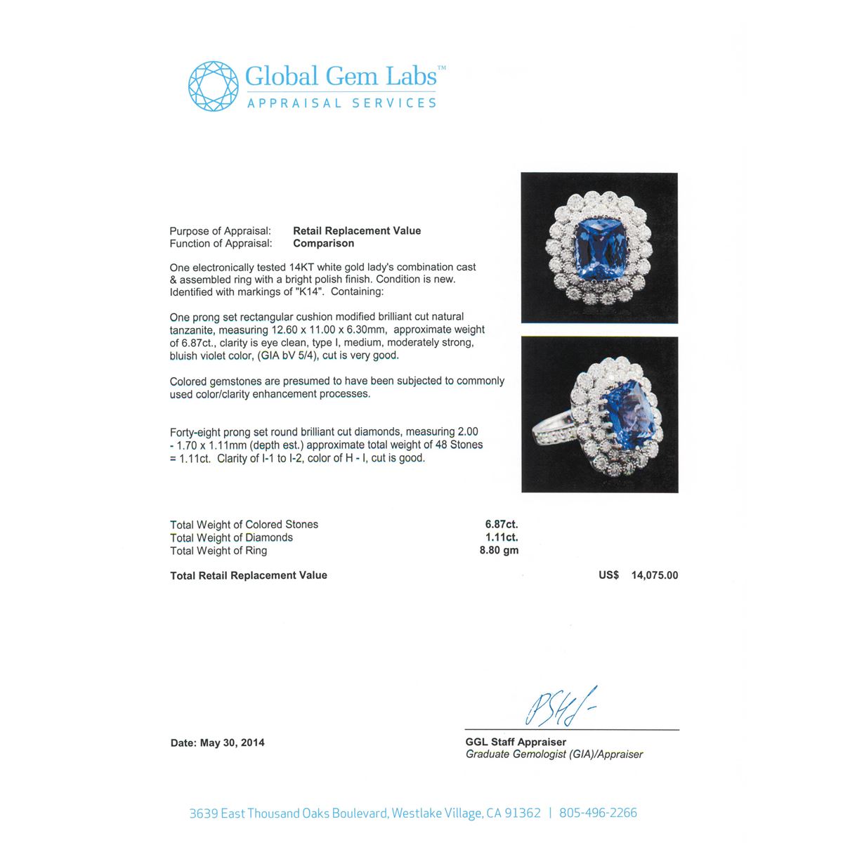 One electronically tested 14KT white gold Ladies combination cast & assembled ring with a bright polish finish. Condition is new. Identified with markings of "K14". Containing: One prong set rectangular cushion modified brilliant cut natural tanzanite, measuring 12.60 x 11.00 x 6.30mm, approximate weight of 6.87ct., clarity is eye clean, type I, medium, moderately strong, bluish violet color, (GIA bV 5/4), cut is very good. Colored gemstones are presumed to have been subjected to commonly used color/clarity enhancement processes. Forty-Eight prong set round brilliant cut diamonds, measuring 2.00 - 1.70 x 1.11mm (depth est.) approximate. Total Weight of 48 Stones = 1.11ct. Clarity: I-1 to I-2. Color: H - I, Cut is Good. Total Weight of Colored Stones 6.87ct. Total Weight of Diamonds 1.11ct. Total Weight of Ring 8.80 grams. GGL Appraised at $14,075.00.