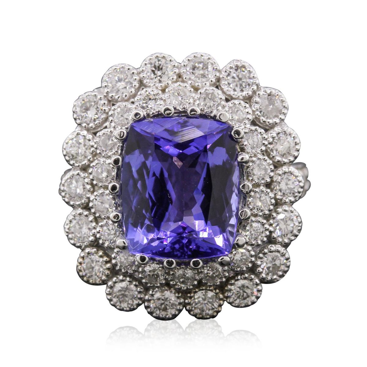 One electronically tested 14KT white gold Ladies combination cast & assembled ring with a bright polish finish. Condition is new. Identified with markings of "K14". Containing: One prong set rectangular cushion modified brilliant cut natural tanzanite, measuring 12.60 x 11.00 x 6.30mm, approximate weight of 6.87ct., clarity is eye clean, type I, medium, moderately strong, bluish violet color, (GIA bV 5/4), cut is very good. Colored gemstones are presumed to have been subjected to commonly used color/clarity enhancement processes. Forty-Eight prong set round brilliant cut diamonds, measuring 2.00 - 1.70 x 1.11mm (depth est.) approximate. Total Weight of 48 Stones = 1.11ct. Clarity: I-1 to I-2. Color: H - I, Cut is Good. Total Weight of Colored Stones 6.87ct. Total Weight of Diamonds 1.11ct. Total Weight of Ring 8.80 grams. GGL Appraised at $14,075.00.