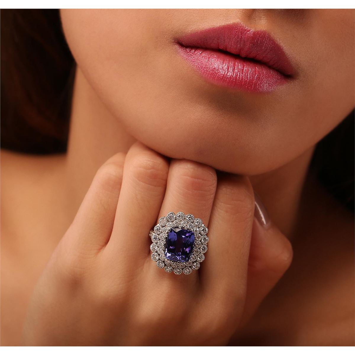 One electronically tested 14KT white gold Ladies combination cast & assembled ring with a bright polish finish. Condition is new. Identified with markings of "K14". Containing: One prong set rectangular cushion modified brilliant cut natural tanzanite, measuring 12.60 x 11.00 x 6.30mm, approximate weight of 6.87ct., clarity is eye clean, type I, medium, moderately strong, bluish violet color, (GIA bV 5/4), cut is very good. Colored gemstones are presumed to have been subjected to commonly used color/clarity enhancement processes. Forty-Eight prong set round brilliant cut diamonds, measuring 2.00 - 1.70 x 1.11mm (depth est.) approximate. Total Weight of 48 Stones = 1.11ct. Clarity: I-1 to I-2. Color: H - I, Cut is Good. Total Weight of Colored Stones 6.87ct. Total Weight of Diamonds 1.11ct. Total Weight of Ring 8.80 grams. GGL Appraised at $14,075.00.