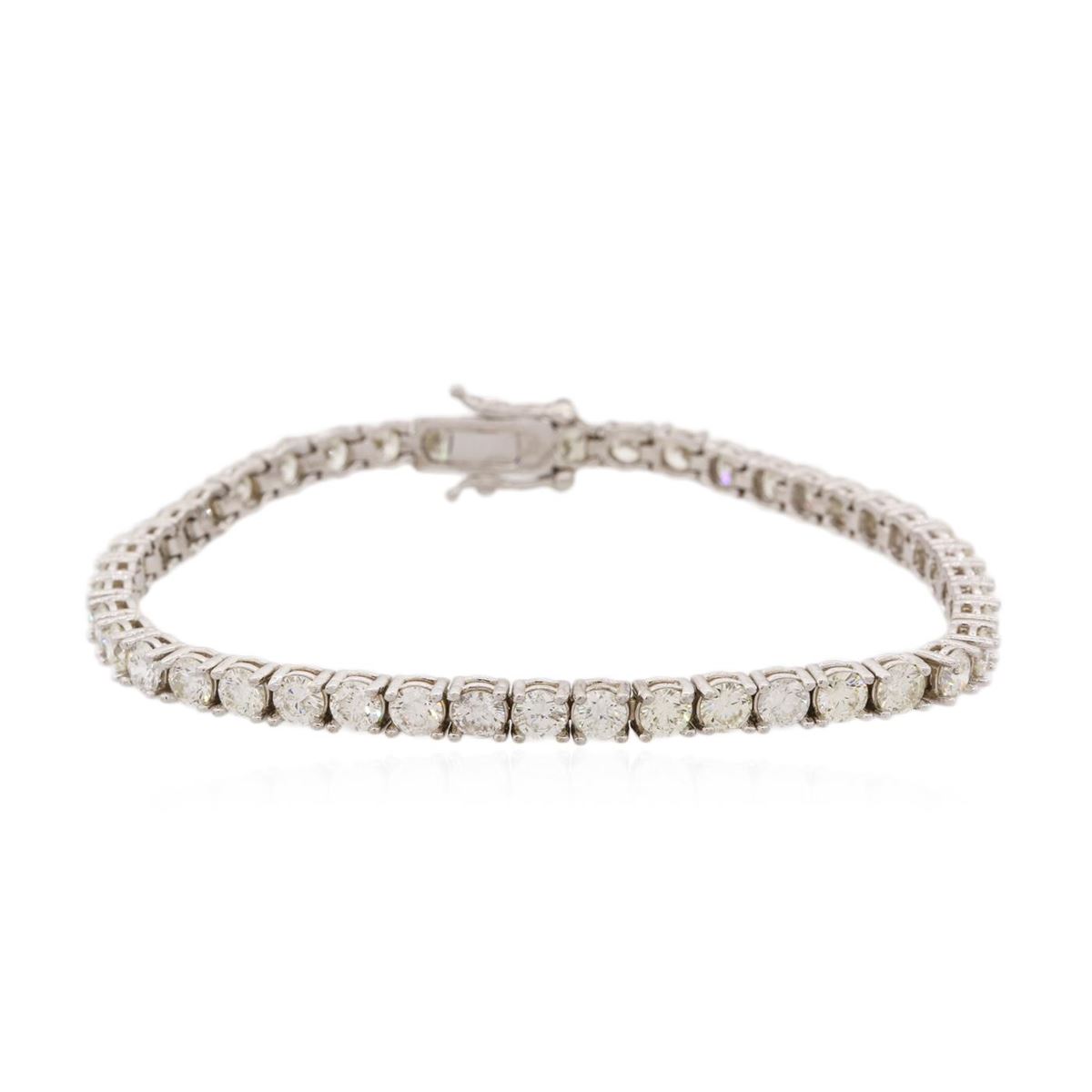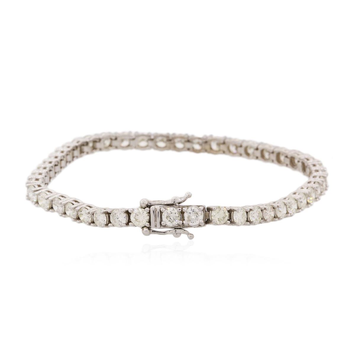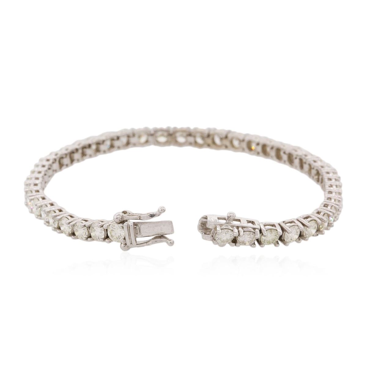 One electronically tested 14KT white gold ladies cast diamond tennis bracelet with a hidden box clasp with a bright and brushed finish. Measurements: 7." in length. Identified with markings of "14K". Condition is new. Containing: Forty-Four prong set round brilliant cut diamonds, measuring 3.50 - 3.50 x 2.10mm (depth est.) approximate total weight of 44 Stones = 6.90ct. Clarity: SI-2 to I-2. Color: K - L. All diamonds are graded in the mounting, unless otherwise stated. Total Weight of Diamonds 6.90ct. Total Weight of Tennis Bracelet 11.30 grams. GGL Appraised at $13,335.00.