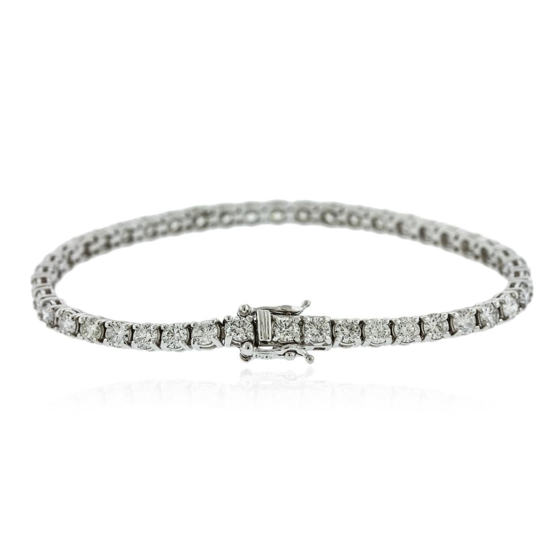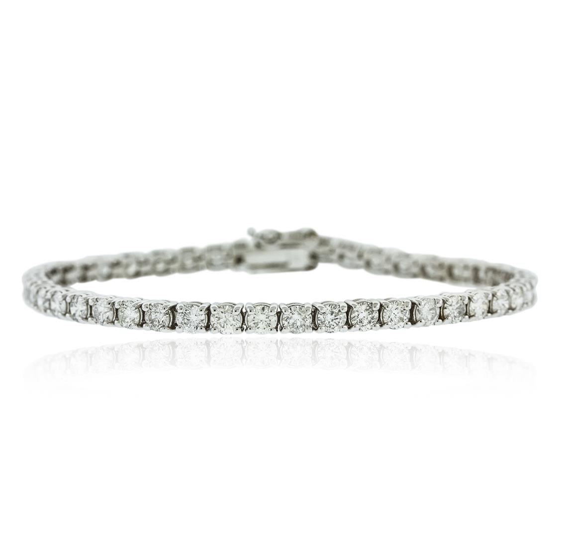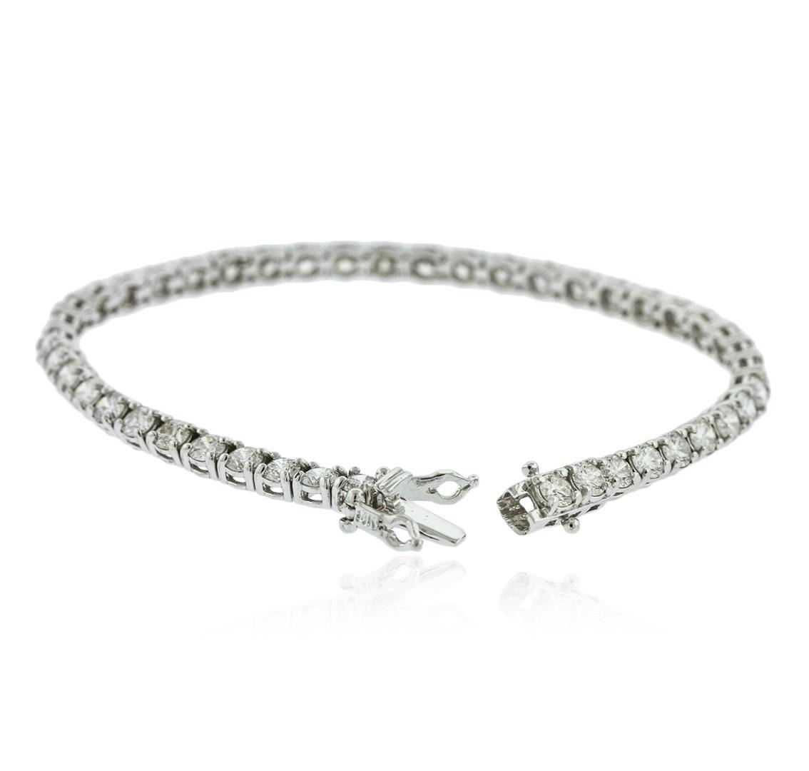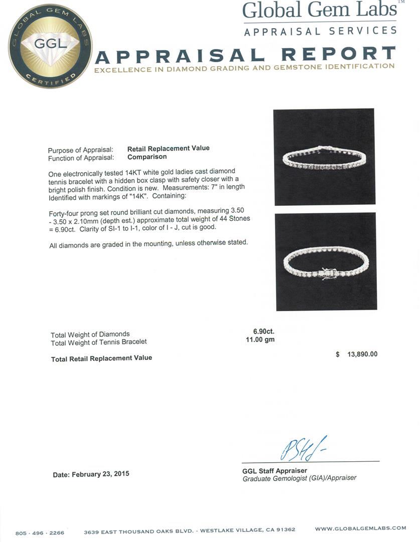 One electronically tested 14KT white gold ladies cast diamond tennis bracelet with a hidden box clasp with safety closer with a bright polish finish. Measurements: 7" in length Identified with markings of "14K". Condition is new. Containing: Forty-Four prong set round brilliant cut diamonds, measuring 3.50 - 3.50 x 2.10mm (depth est.) approximate total weight of 44 Stones = 6.90ct. Clarity: SI-1 to I-1. Color: I - J, Cut is Good. All diamonds are graded in the mounting, unless otherwise stated. Total Weight of Diamonds 6.90ct. Total Weight of Tennis Bracelet 11.00 grams. GGL Appraised at $13,890.00.