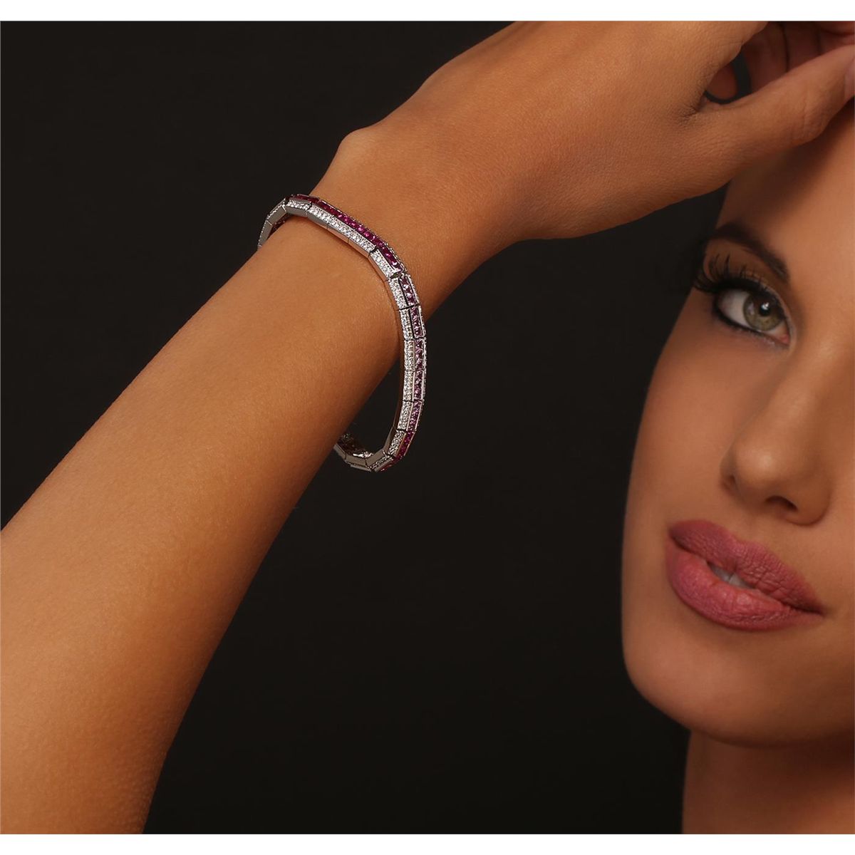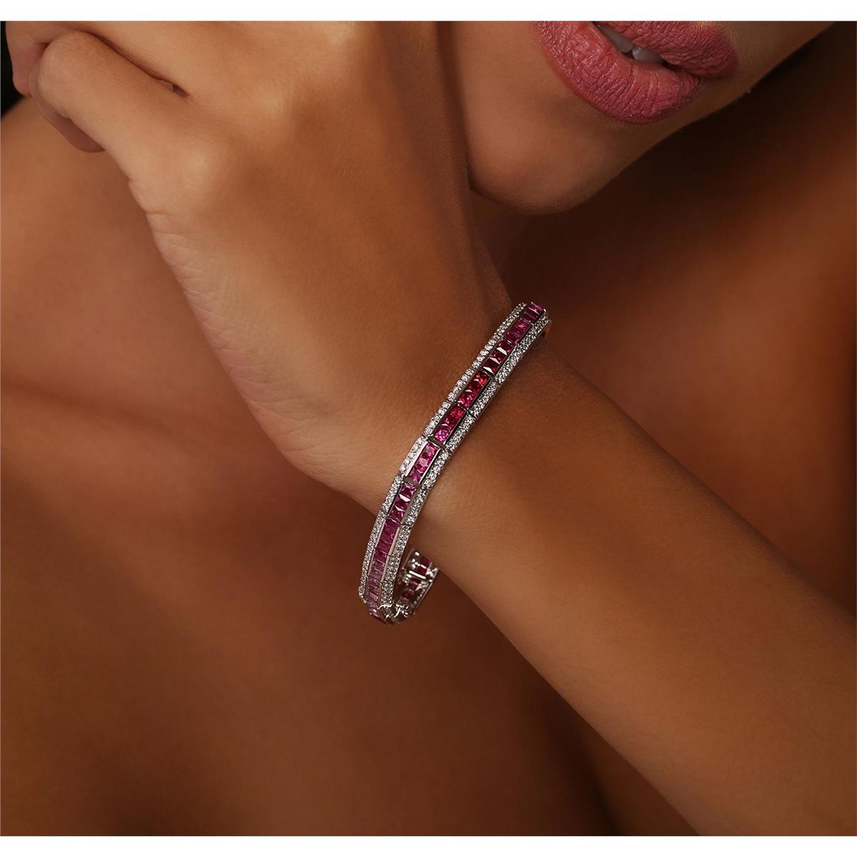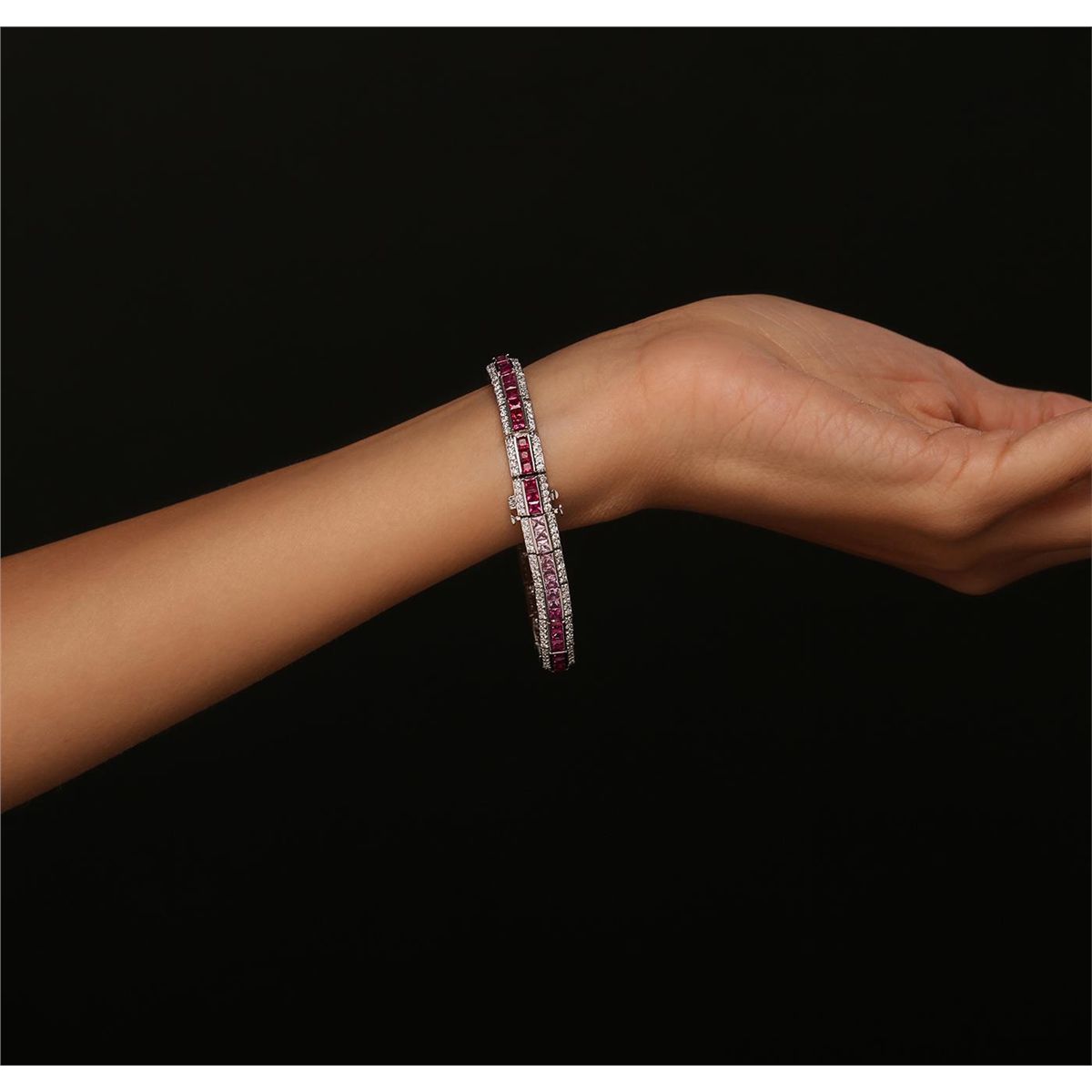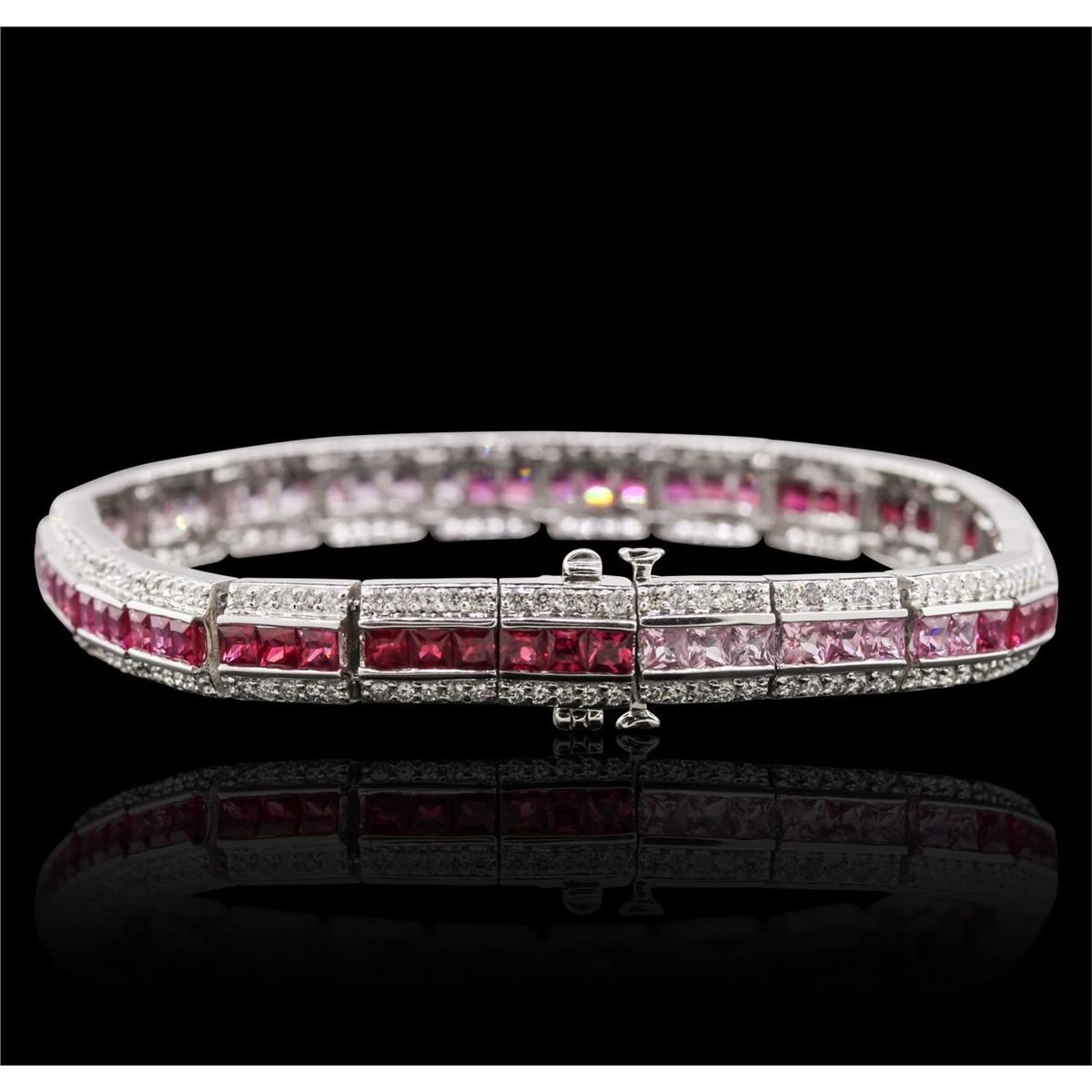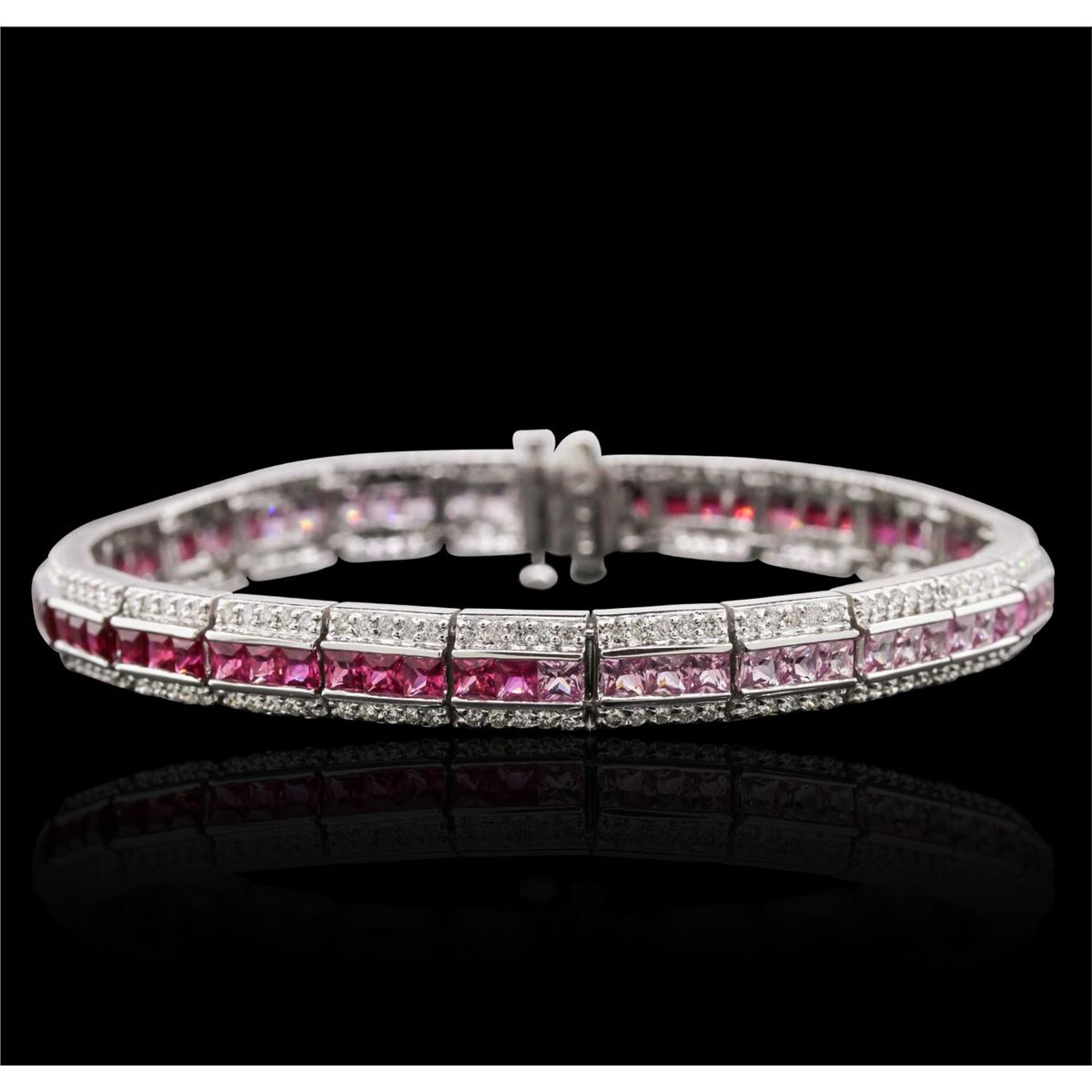 One electronically tested 14KT white gold Ladies combination cast & assembled bracelet with a hidden box clasp with a bright polish finish. Condition is new. Measurements: 6.75" in length. Identified with markings of "14K". Containing: Sixty-nine channel set princess modified brilliant cut natural pink sapphires, measuring 2.50 x 2.50 x 1.63mm, approximate total weight of 6.90ct., clarity is eye clean, type II, light, moderately strong, pink color, (GIA PR 3/4), cut is very good. Colored gemstones are presumed to have been subjected to commonly used enhancement processes. All diamonds and colored gemstones are graded in the mounting, unless otherwise stated. Two Hundred Thirty prong set round brilliant cut diamonds, measuring 1.30 - 1.30 x 0.78mm (depth est.) approximate total weight of 230 Stones = 1.84ct. Clarity: SI-2. Color: I - J, Cut is Good. Total Weight of Colored Stones 6.90ct. Total Weight of Diamonds 1.84ct. Total Weight of Bracelet 22.70 grams. GGL Appraised at $14,315.00.
