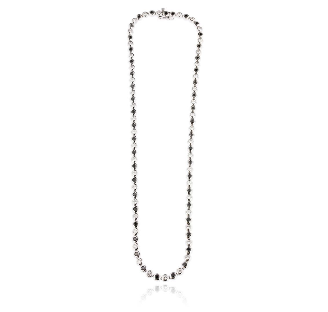 One electronically tested 14KT white gold ladies cast diamond necklace with a hidden box clasp with safety closer with a bright polish finish. Measurements: 18" in length. Identified with markings of "14K". Condition is new. Containing: Forty-Five prong set round brilliant cut diamonds, measuring 2.50 - 2.50 x 1.50mm (depth est.) approximate total weight of 45 Stones = 2.57ct., Color is Fancy Black, Cut is Good. Forty-Four bezel set round brilliant cut diamonds, measuring 3.00 - 3.00 x 1.80mm (depth est.) approximate total weight of 44 Stones = 4.35ct. Clarity: SI-1 to SI-2. Color: I - J, Cut is Good. All diamonds are graded in the mounting, unless otherwise stated. Total Weight of Diamonds 6.92ct. Total Weight of Necklace 30.10 grams. GGL Appraised at $13,435.00.