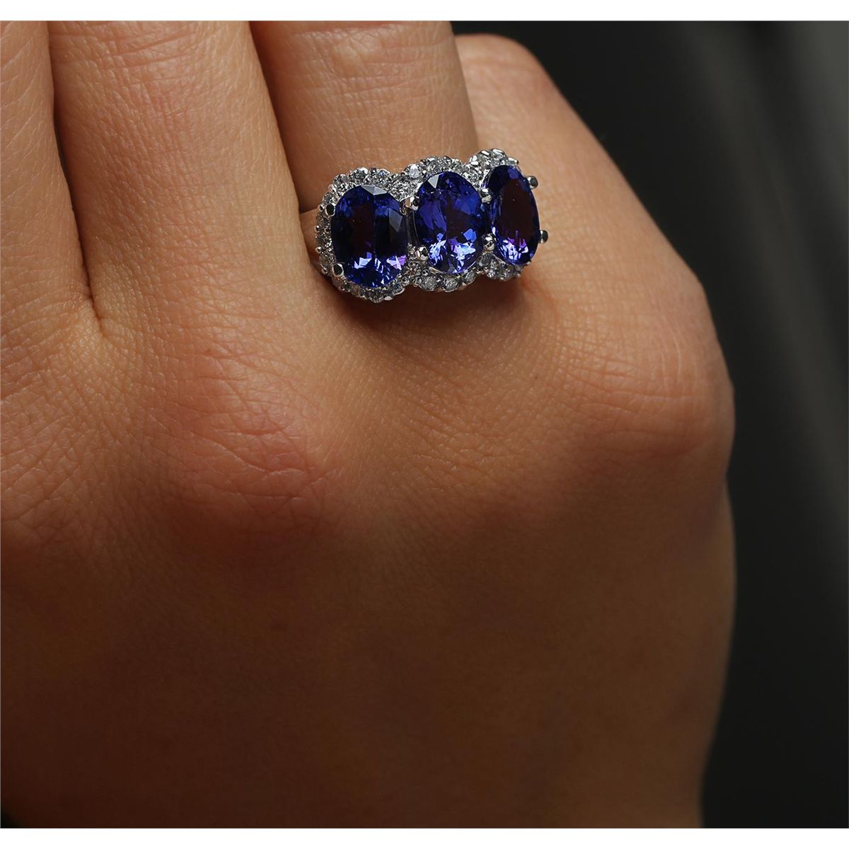 One electronically tested 14KT white gold Ladies combination cast & assembled ring with a bright polish finish. Condition is new. Identified with markings of "K14". Containing: Three prong set oval modified brilliant cut natural tanzanites, measuring 9.30 x 7.00 x 5.20mm, approximate. Total Weight of 6.93ct., clarity is eye clean, type I, medium, moderately strong, violetish blue color, (GIA vB 5/4), cut is good. Colored gemstones are presumed to have been subjected to commonly used color/clarity enhancement processes. Thirty-Two prong set round brilliant cut diamonds, measuring 1.50 - 1.50 x 0.90mm (depth est.) approximate. Total Weight of 32 Stones = 0.39ct. Clarity: SI-2 to I-2. Color: J - K, Cut is Good. Total Weight of Colored Stones 6.93ct. Total Weight of Diamonds 0.39ct. Total Weight of Ring 8.80 grams. GGL Appraised at $13,980.00.
