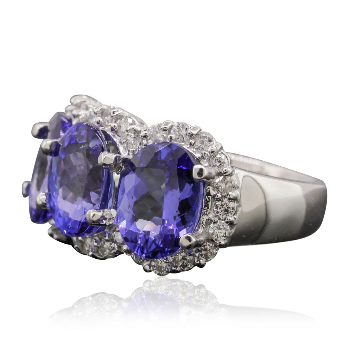 One electronically tested 14KT white gold Ladies combination cast & assembled ring with a bright polish finish. Condition is new. Identified with markings of "K14". Containing: Three prong set oval modified brilliant cut natural tanzanites, measuring 9.30 x 7.00 x 5.20mm, approximate. Total Weight of 6.93ct., clarity is eye clean, type I, medium, moderately strong, violetish blue color, (GIA vB 5/4), cut is good. Colored gemstones are presumed to have been subjected to commonly used color/clarity enhancement processes. Thirty-Two prong set round brilliant cut diamonds, measuring 1.50 - 1.50 x 0.90mm (depth est.) approximate. Total Weight of 32 Stones = 0.39ct. Clarity: SI-2 to I-2. Color: J - K, Cut is Good. Total Weight of Colored Stones 6.93ct. Total Weight of Diamonds 0.39ct. Total Weight of Ring 8.80 grams. GGL Appraised at $13,980.00.