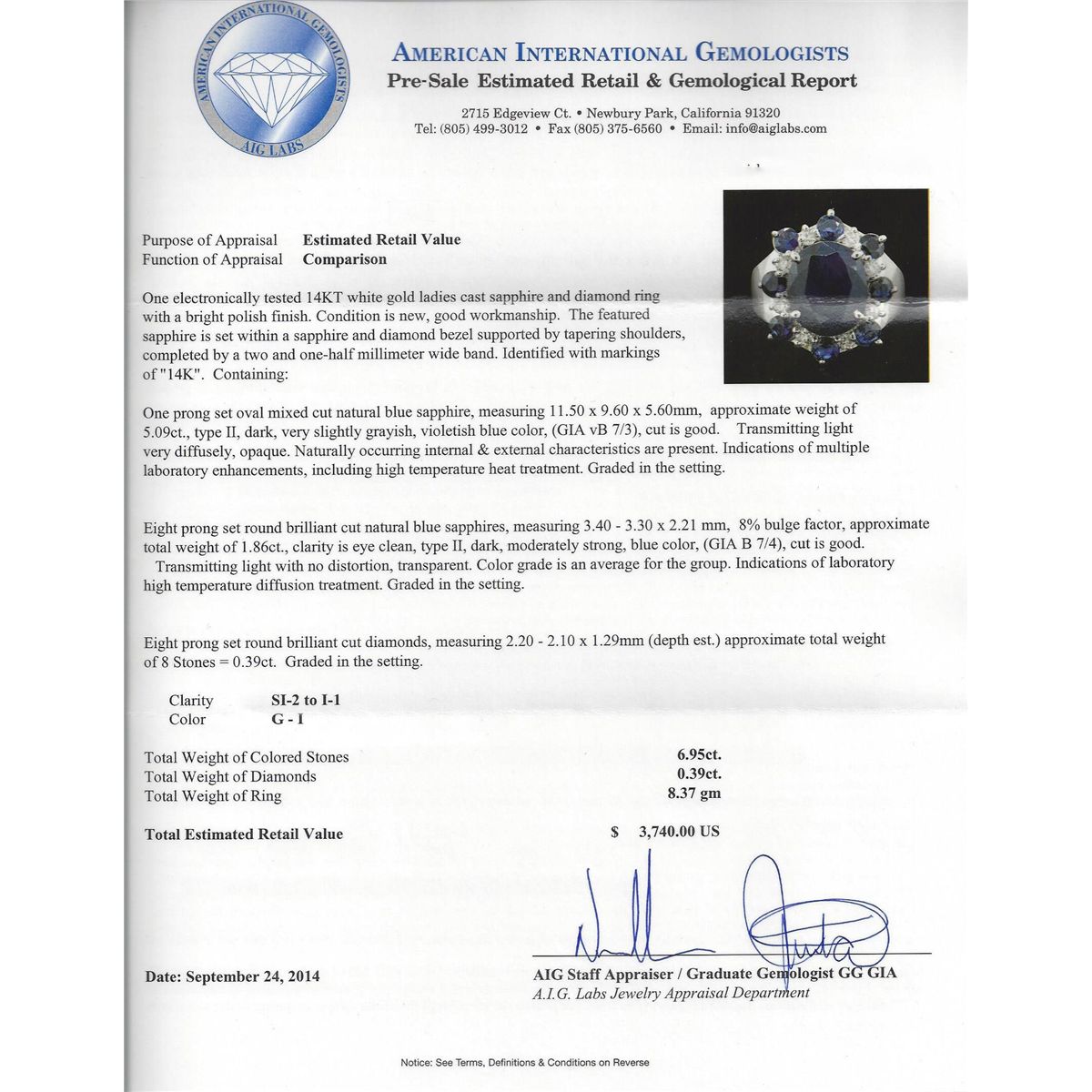 One electronically tested 14KT white gold ladies cast sapphire and diamond ring with a bright polish finish. Condition is new, good workmanship. The featured sapphire is set within a sapphire and a diamond bezel supported by tapering shoulders, completed by a two and one-half millimeter wide band. Identified with markings of "14KT". Containing: One prong set oval mixed cut natural blue sapphire, measuring 11.50 x 9.60 x 5.60mm, approximate weight of 5.09ct., type II, dark, very slightly grayish, violetish blue color, (GIA vB 7/3), cut is good. Transmitting light very diffusely, opaque. Naturally occurring internal & external characteristics are present. Indications of multiple laboratory enhancements, including high temperature heat treatment. Graded in the setting. Eight prong set round brilliant cut natural blue sapphires, measuring 3.40-3.30x2.21mm, 8% bulge factor, approximate total weight of 1.86ct., clarity is eye clean, type II, dark, moderately strong, blue color, (GIA B 7/4), cut is good. Transmitting light with no distortion, transparent. Color grade is average for the group. Indications of laboratory high temperature diffusion treatment. Graded in the setting. Clarity SI-I-1. Color G-1. Total Weight of Colored Stones 6.95ct. Total Weight of Diamonds 0.39ct. Total Weight of Ring 8.37 grams. AIG appraised at $3,740.00