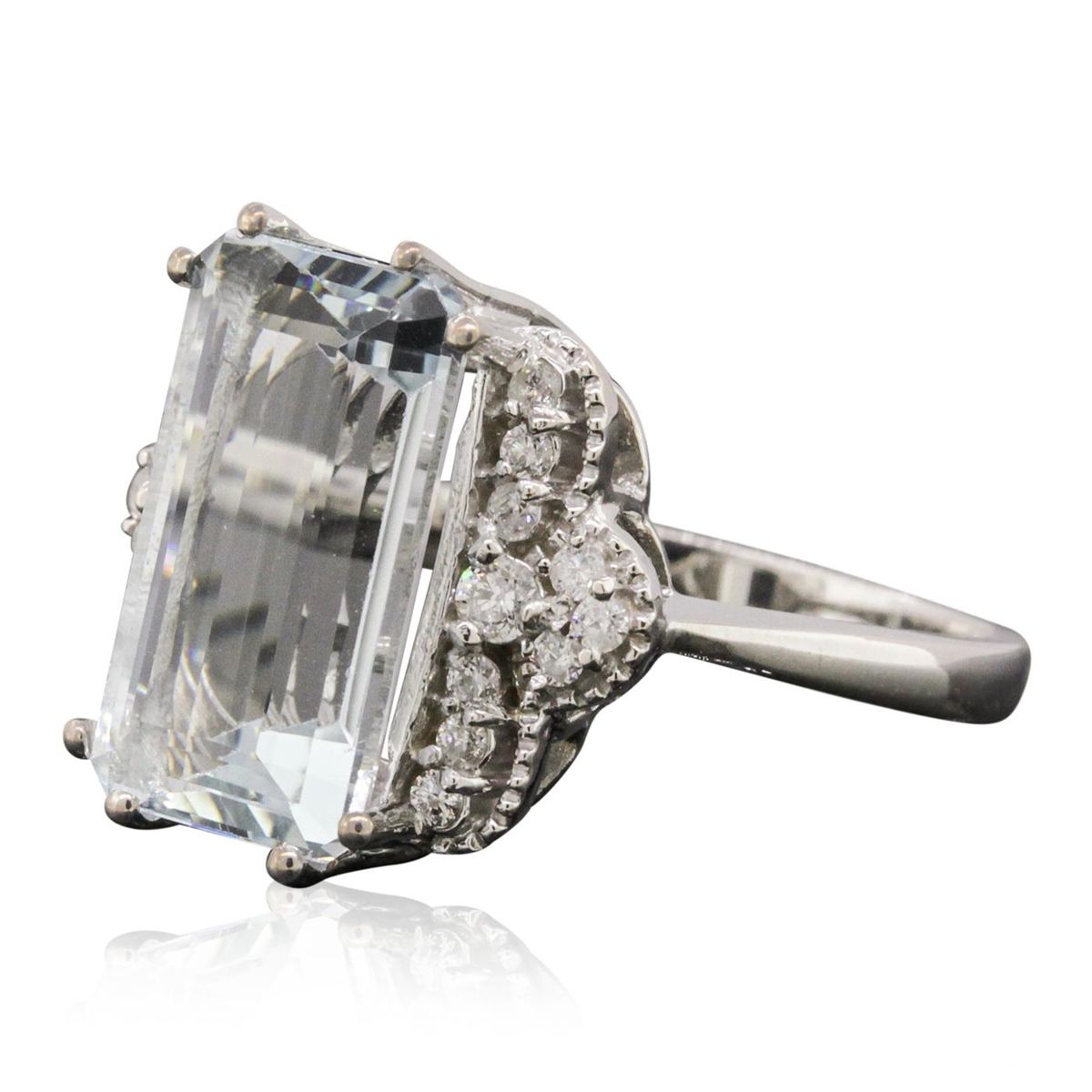 One electronically tested 14KT white gold ladies cast aquamarine and diamond ring with a bright polish finish. Condition is new, good workmanship. The featured aquamarine is supported by diamond set shoulders, completed by a two and one-half millimeter wide band. Identified with markings of "K14". Containing: One prong set rectangular step cut natural aquamarine, measuring 15.50 x 8.50 x 6.00mm, 8%. bulge factor, approximate weight of 6.97ct., clarity is slightly included, type I, medium light, very slightly grayish, very slightly greenish blue color, (GIA vslgB 4/3), cut is good. Transmitting light with a minimum of distortion, transparent. Naturally occurring internal & external characteristics are present. Colored Stone Grading Report attached. Graded in the setting. Twenty prong set round brilliant cut diamonds, measuring 1.50 - 1.40 x 0.87mm (depth est.) approximate. Total Weight of 20 Stones = 0.32ct. Graded in the setting. Clarity: SI-2 to I-2. Color: G - I. Total Weight of Colored Stones 6.97ct. Total Weight of Diamonds 0.32ct. Total Weight of Ring 6.63gm. AIG Appraised at $4,645.00.