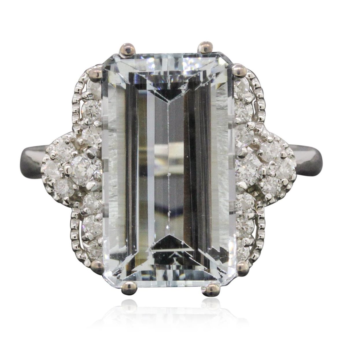 One electronically tested 14KT white gold ladies cast aquamarine and diamond ring with a bright polish finish. Condition is new, good workmanship. The featured aquamarine is supported by diamond set shoulders, completed by a two and one-half millimeter wide band. Identified with markings of "K14". Containing: One prong set rectangular step cut natural aquamarine, measuring 15.50 x 8.50 x 6.00mm, 8%. bulge factor, approximate weight of 6.97ct., clarity is slightly included, type I, medium light, very slightly grayish, very slightly greenish blue color, (GIA vslgB 4/3), cut is good. Transmitting light with a minimum of distortion, transparent. Naturally occurring internal & external characteristics are present. Colored Stone Grading Report attached. Graded in the setting. Twenty prong set round brilliant cut diamonds, measuring 1.50 - 1.40 x 0.87mm (depth est.) approximate. Total Weight of 20 Stones = 0.32ct. Graded in the setting. Clarity: SI-2 to I-2. Color: G - I. Total Weight of Colored Stones 6.97ct. Total Weight of Diamonds 0.32ct. Total Weight of Ring 6.63gm. AIG Appraised at $4,645.00.