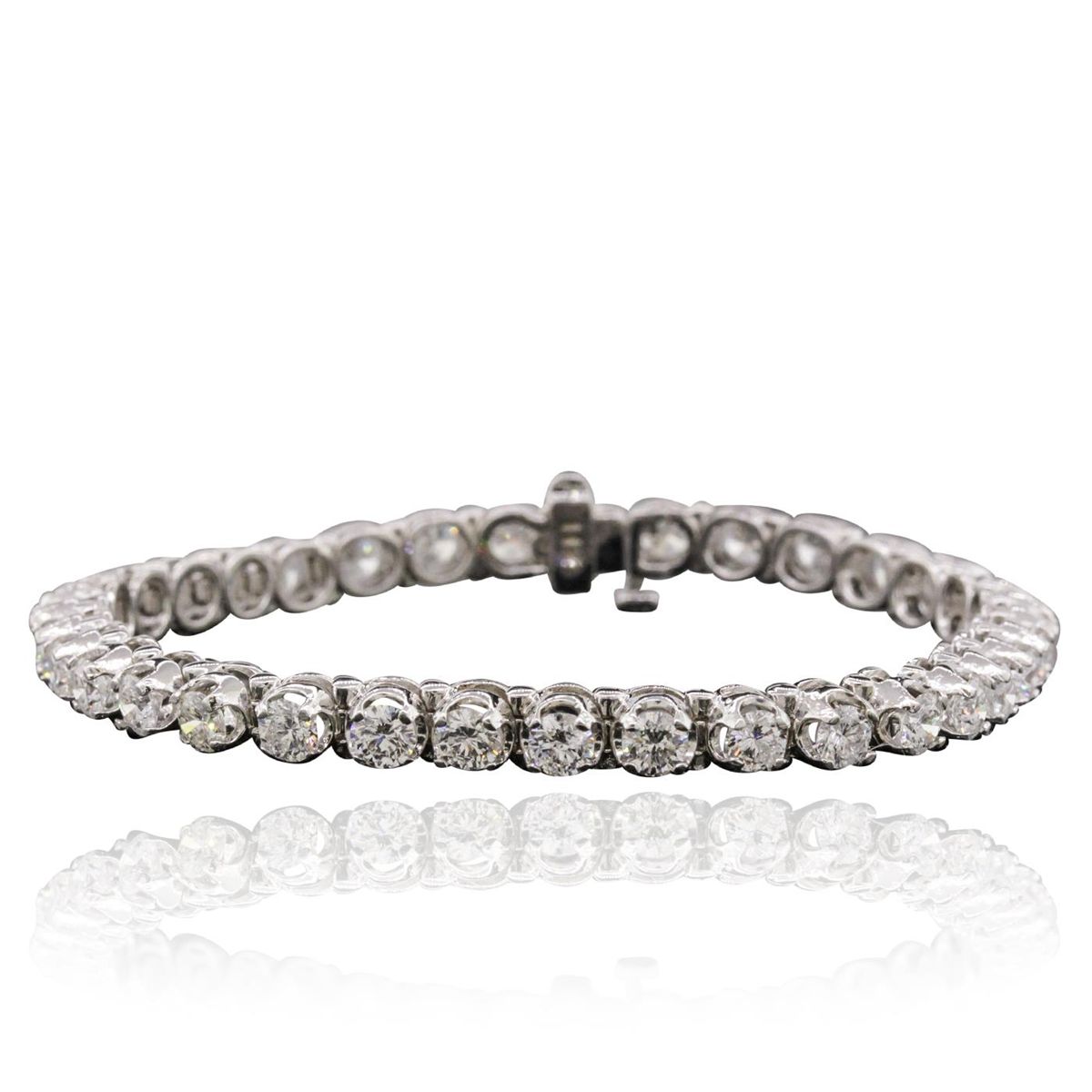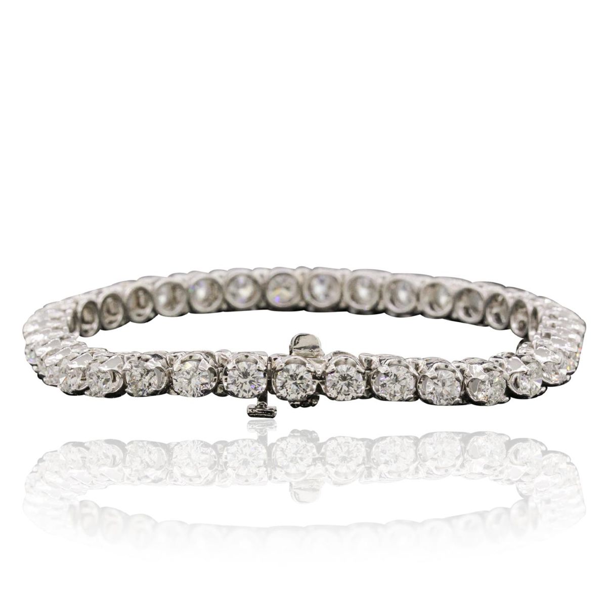 One electronically tested 14KT white gold ladies combination cast & assembled tennis bracelet with a hidden box clasp with a bright polish finish. Condition is new. Measurements: 6.85" in length. Identified with markings of "14K". Containing: Thirty-Five prong set round brilliant cut diamonds, measuring 3.70 - 3.70 x 2.22mm (depth est.) approximate total weight of 35 Stones = 6.98ct. Clarity: SI-1 to I-1. Color: I - J, Cut is Good. All diamonds are graded in the mounting, unless otherwise stated. Total Weight of Diamonds 6.98ct. Total Weight of Bracelet 16.10 grams. GGL Appraised at $28,775.00.