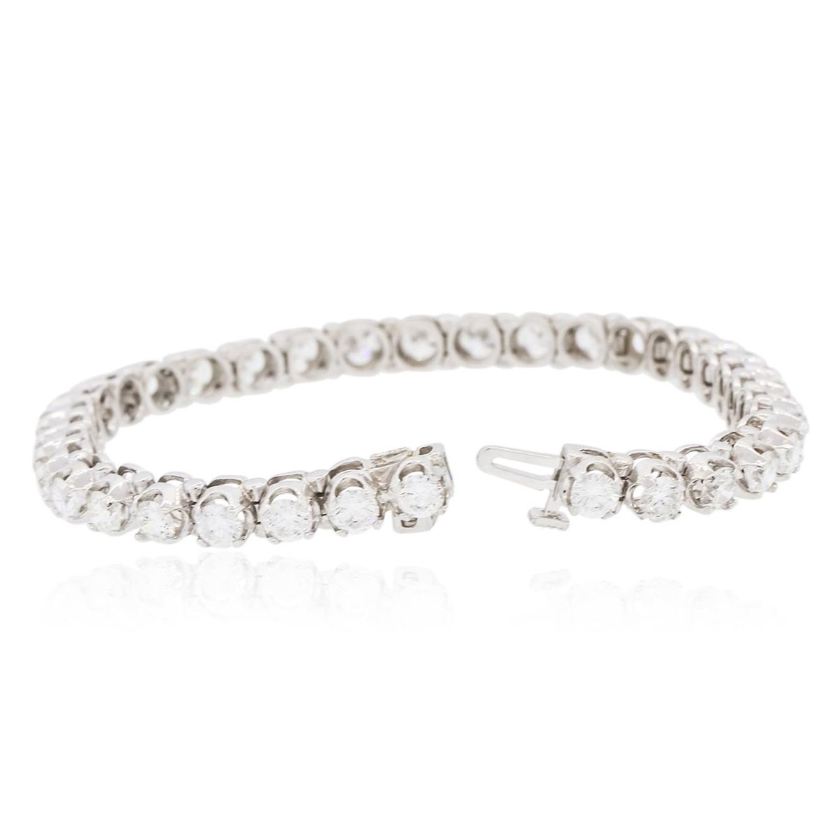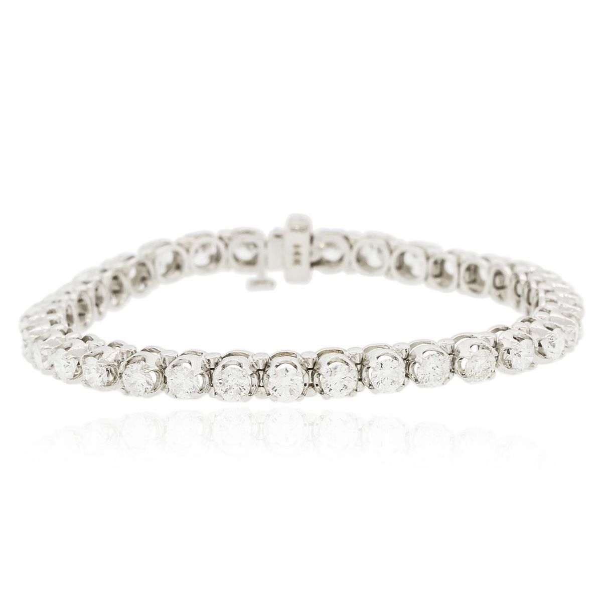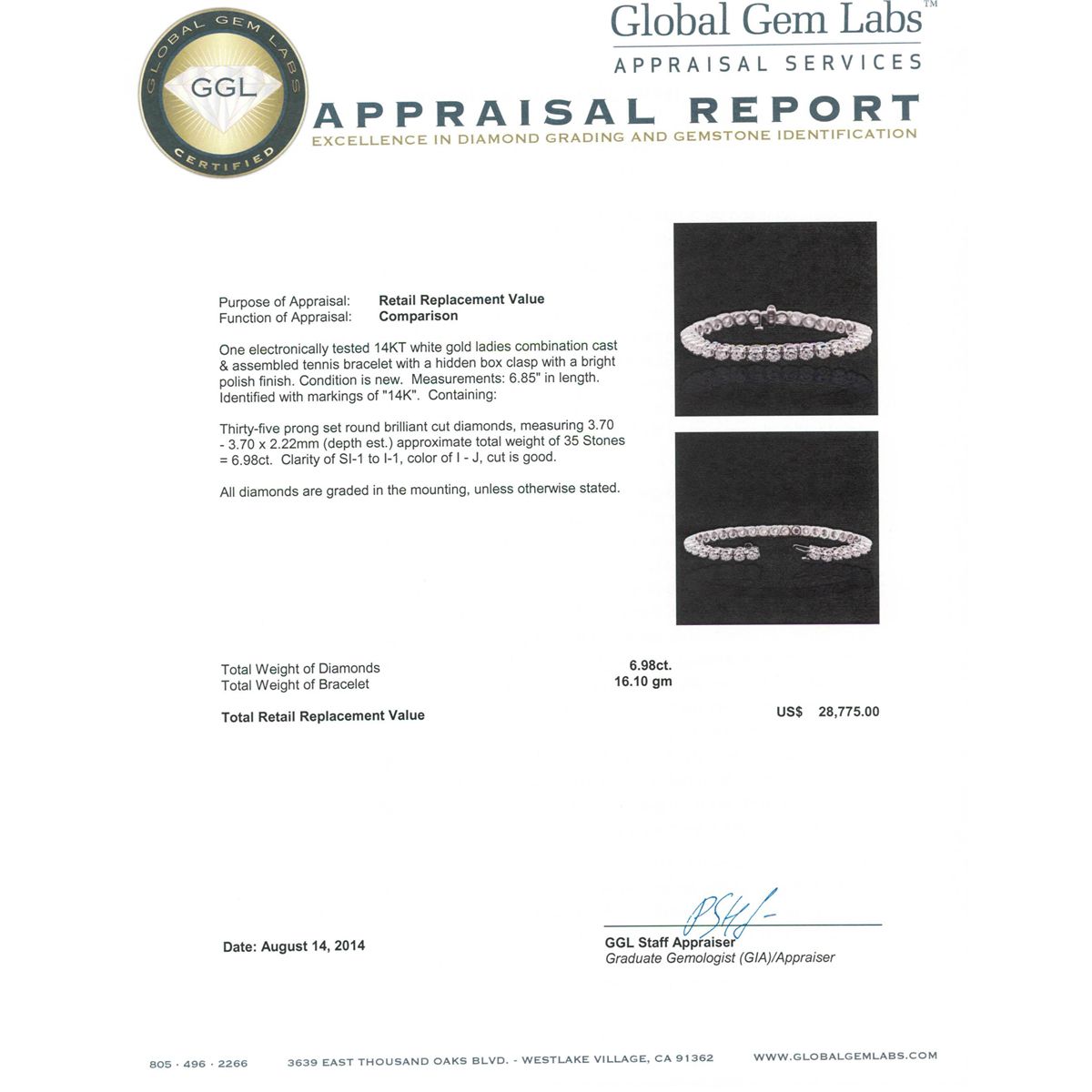 One electronically tested 14KT white gold ladies combination cast & assembled tennis bracelet with a hidden box clasp with a bright polish finish. Condition is new. Measurements: 6.85" in length. Identified with markings of "14K". Containing: Thirty-Five prong set round brilliant cut diamonds, measuring 3.70 - 3.70 x 2.22mm (depth est.) approximate total weight of 35 Stones = 6.98ct. Clarity: SI-1 to I-1. Color: I - J, Cut is Good. All diamonds are graded in the mounting, unless otherwise stated. Total Weight of Diamonds 6.98ct. Total Weight of Bracelet 16.10 grams. GGL Appraised at $28,775.00.