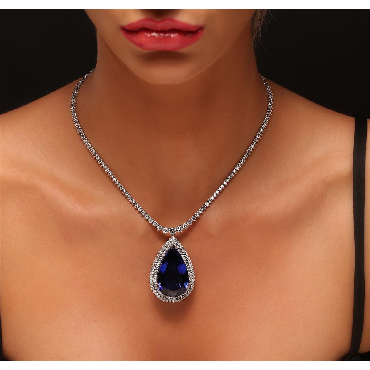 One electronically tested 14KT white gold Ladies combination cast & assembled diamond necklaceand pendant with a hidden box clasp with a bright polish finish. Condition is new. Identified with markings of "14K". Containing: One prong set pear modified brilliant cut natural tanzanite, measuring 33.65 x 21.14 x 13.58mm, exact weight 69.66ct., clarity is eye clean, type I, medium, very slightly grayish, bluish violet color, (GIA bV 5/3), cut is very good. GIA Report: 6167000255.One prong set round brilliant cut diamond, measuring 5.00 - 5.00 x 3.00mm (depth est.) approximate weight of 0.46ct. . Clarity: SI-1. Color: I, Cut is Good. Four prong set round brilliant cut diamonds, measuring 4.10 - 3.60 x 2.31mm (depth est.) approximate. Total Weight of 4 Stones = 0.72ct. . Clarity: SI-2 to I-1. Color: I - J, Cut is Good. One Hundred Sixty prong set round brilliant cut diamonds, measuring 3.00 - 1.80 x 1.44mm (depth est.) approximate. Total Weight of 160 Stones = 3.80ct. . Clarity: SI-2 to I-2. Color: J - K, Cut is Good. One Hundred Nine prong set round brilliant cut diamonds, measuring 1.90 - 1.50 x 1.02mm (depth est.) approximate. Total Weight of 109 Stones = 1.95ct. . Clarity: I-1 to I-2. Color: I - J, Cut is Good. Total Weight of Colored Stones 69.66ct. Total Weight of Diamonds 6.93ct. Total Weight of Pendant & Chain 43.20 grams. GGL Appraised at $109,045.00.