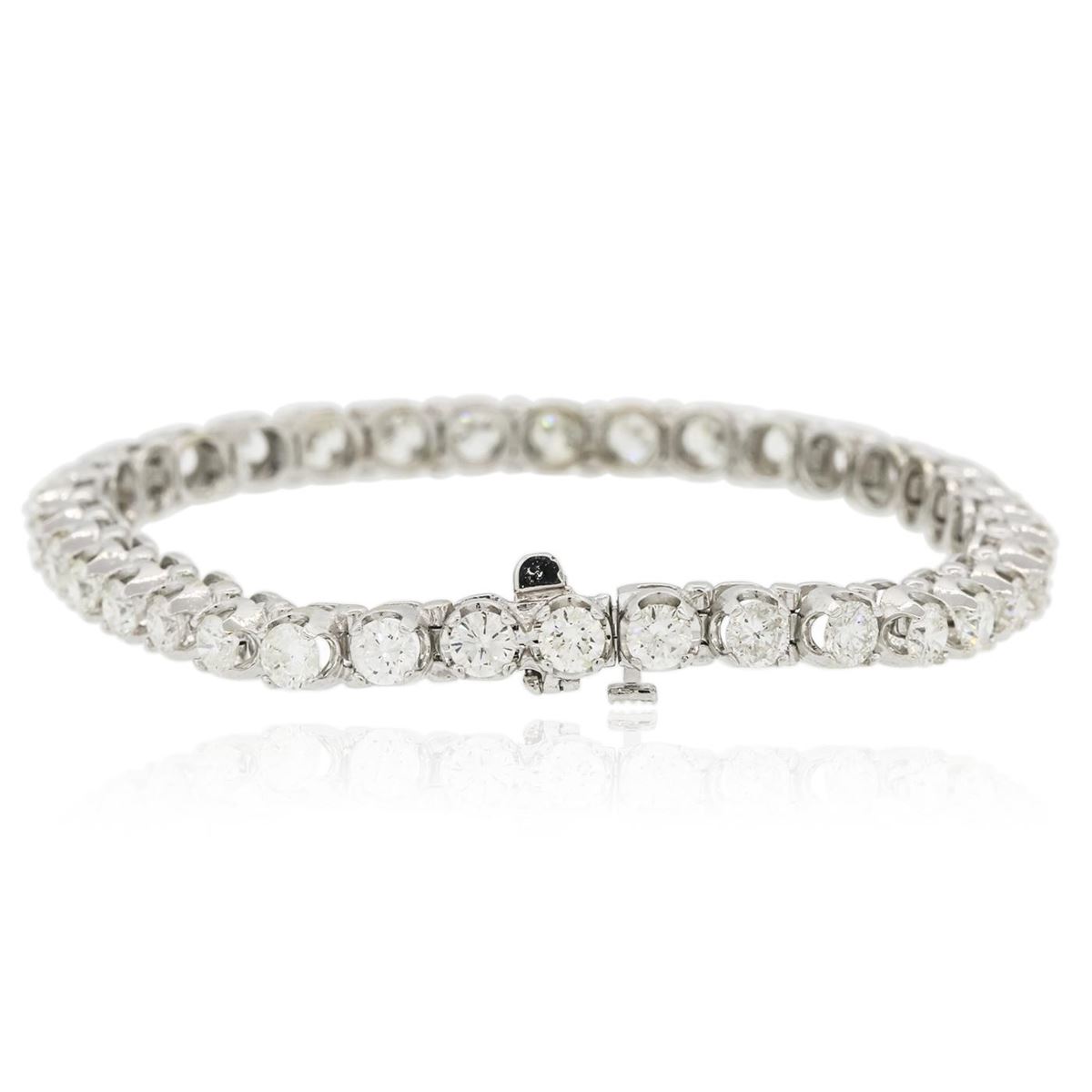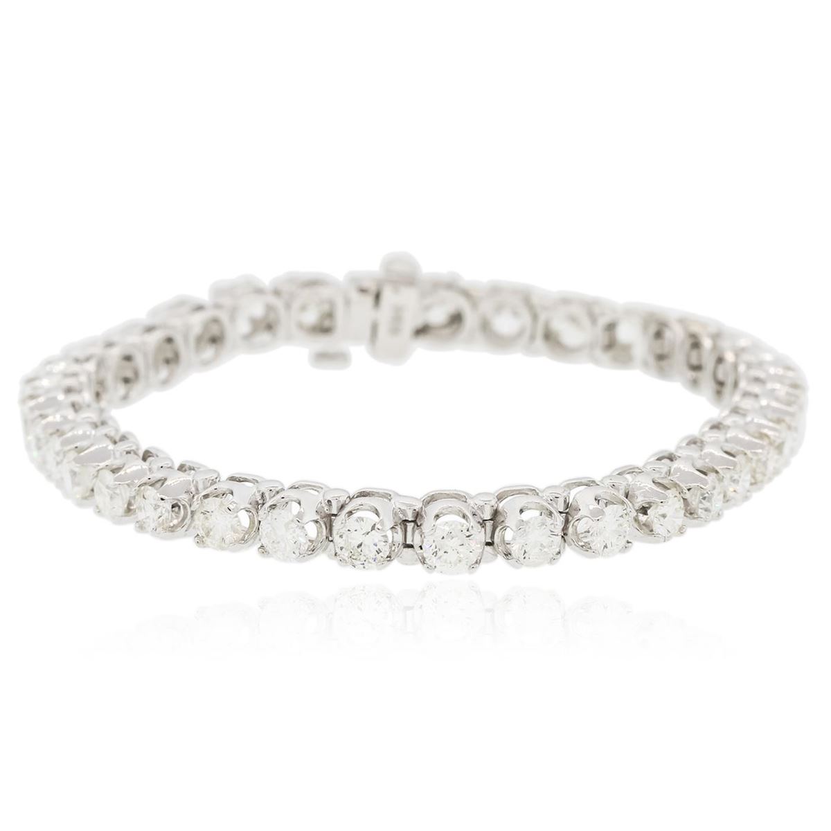 One electronically tested 14KT white gold ladies combination cast & assembled tennis bracelet with a hidden box clasp with a bright polish finish. Condition is new. Measurements: 7" in length. Identified with markings of "14K". Containing: Thirty-Five prong set round brilliant cut diamonds, measuring 3.80 - 3.80 x 2.28mm (depth est.) approximate total weight of 35 Stones = 7.03ct. Clarity: SI-1 to I-1. Color: H - J, Cut is Good. All diamonds are graded in the mounting, unless otherwise stated. Total Weight of Diamonds 7.03ct. Total Weight of Bracelet 16.10 grams. GGL Appraised at $29,815.00.