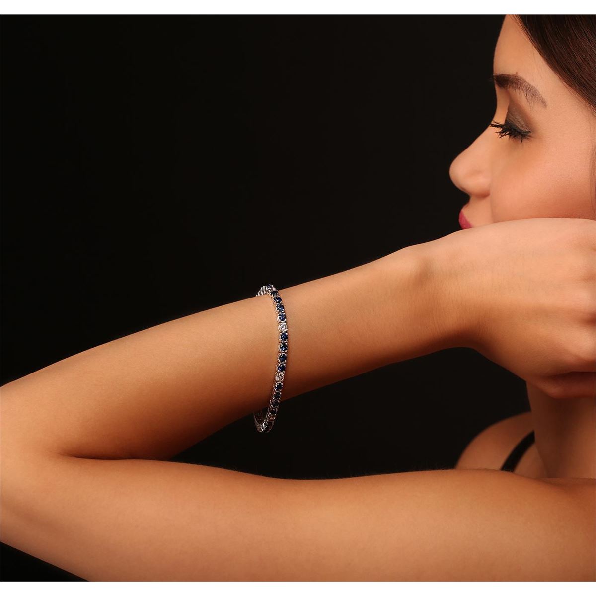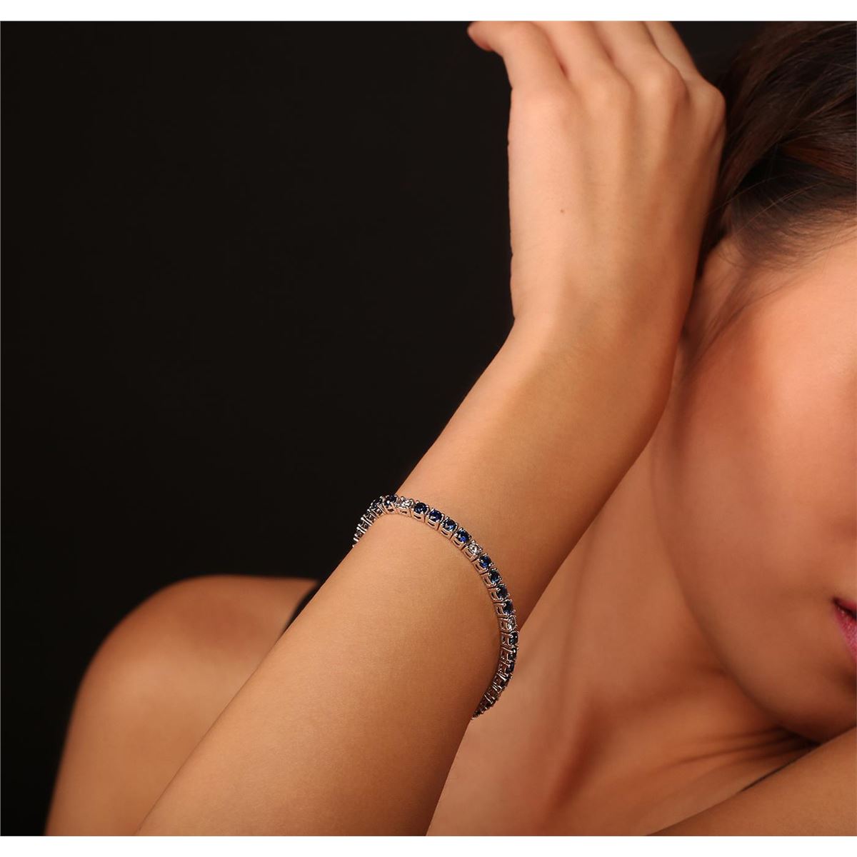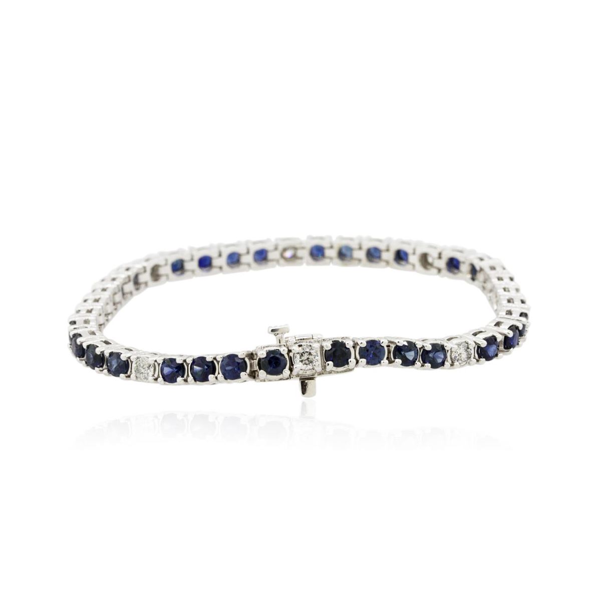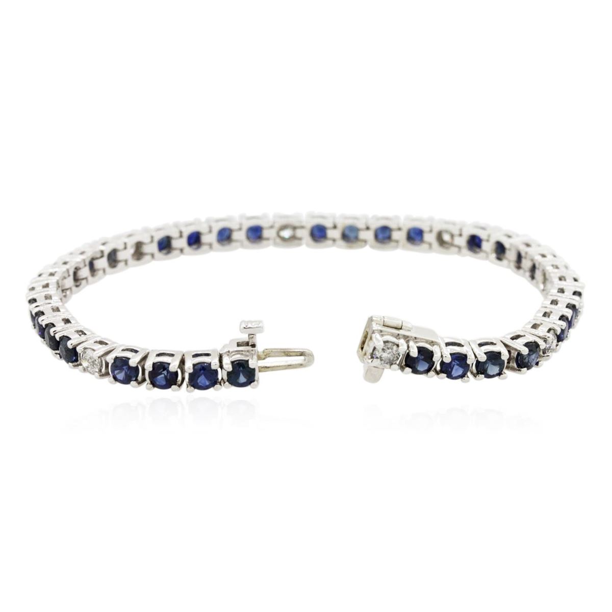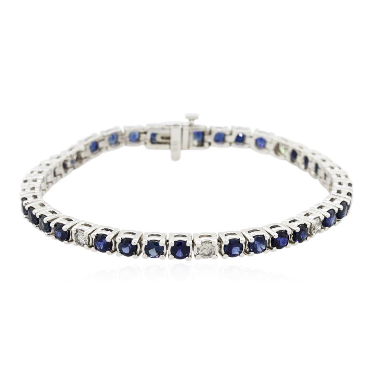 One electronically tested 14KT white gold Ladies combination cast & assembled bracelet with a hidden box clasp with a bright polish finish. Condition is new. Measurements: 7" in length. Identified with markings of "14K". Containing: Thirty-two prong set round modified brilliant cut natural blue sapphires, measuring 3.50 - 3.50 x 2.28 mm, approximate. Total Weight of 7.04ct., clarity is eye clean, type II, medium dark, moderately strong, blue color, (GIA B 6/4), cut is very good. Colored gemstones are presumed to have been subjected to commonly used color/clarity enhancement processes. Eight prong set round brilliant cut diamonds, measuring 3.40 - 3.40 x 2.04mm (depth est.) approximate. Total Weight of 8 Stones = 1.15ct. Clarity: I-2 to I-3. Color: I - J, Cut is Good. Total Weight of Colored Stones 7.04ct. Total Weight of Diamonds 1.15ct. Total Weight of Bracelet 17.80 grams. GGL Appraised at $15,930.00.