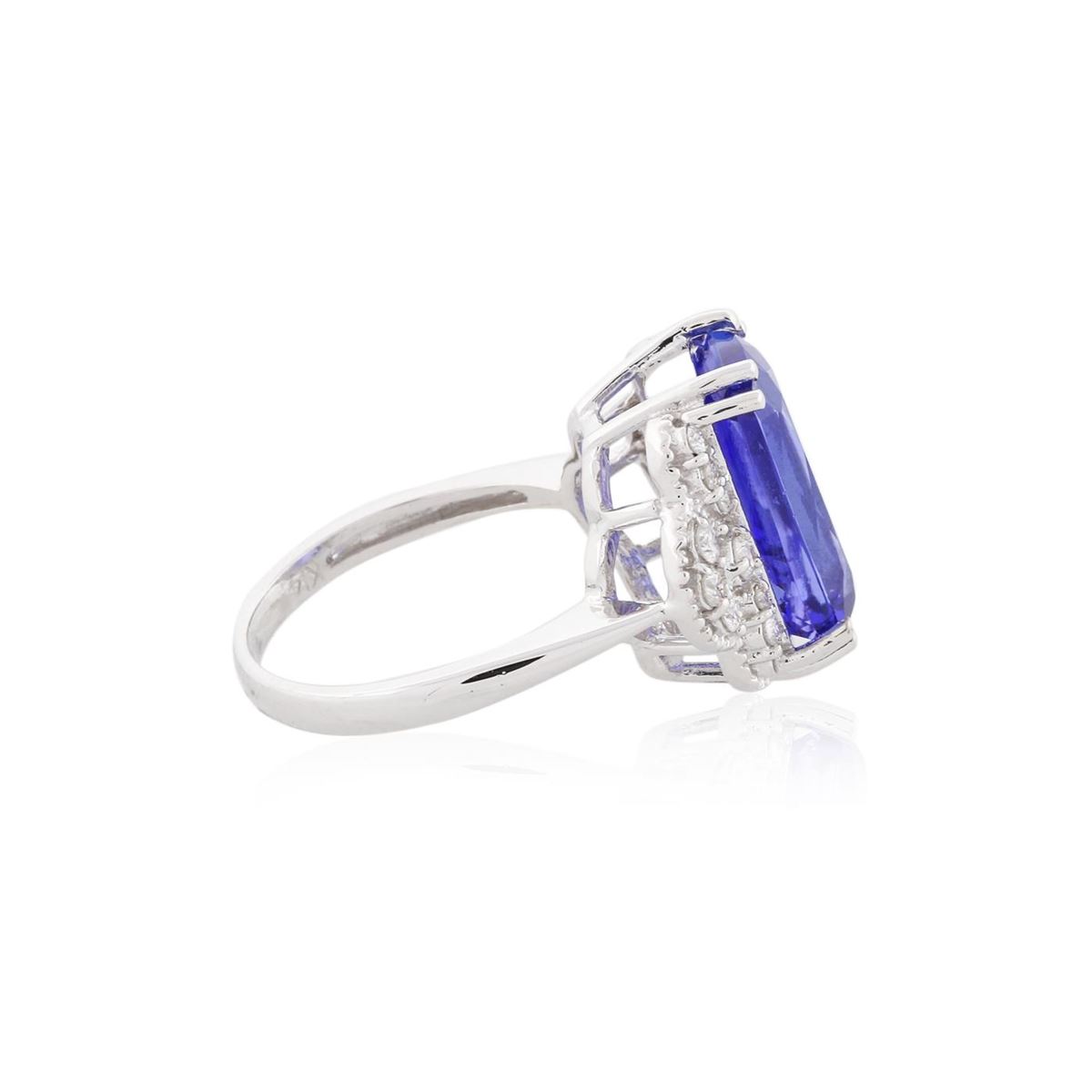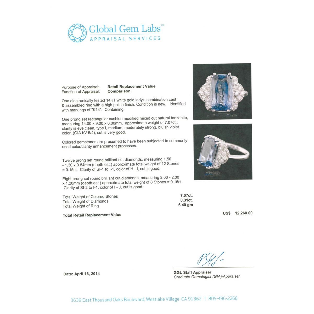One electronically tested 14KT white gold Ladies combination cast & assembled ring with a high polish finish. Condition is new. Identified with markings of "K14". Containing: One prong set rectangular cushion modified mixed cut natural tanzanite, measuring 14.00 x 9.00 x 6.00mm, approximate weight of 7.07ct., clarity is eye clean, type I, medium, moderately strong, bluish violet color, (GIA bV 5/4), cut is very good. Colored gemstones are presumed to have been subjected to commonly used color/clarity enhancement processes. Twelve prong set round brilliant cut diamonds, measuring 1.50 - 1.30 x 0.84mm (depth est.) approximate. Total Weight of 12 Stones = 0.15ct. Clarity: SI-1 to I-1. Color: H - I, Cut is Good. Eight prong set round brilliant cut diamonds, measuring 2.00 - 2.00 x 1.20mm (depth est.) approximate. Total Weight of 8 Stones = 0.16ct. Clarity: SI-2 to I-1. Color: I - J, Cut is Good. Total Weight of Colored Stones 7.07ct. Total Weight of Diamonds 0.31ct. Total Weight of Ring 6.40 grams. GGL Appraised at $12,260.00.