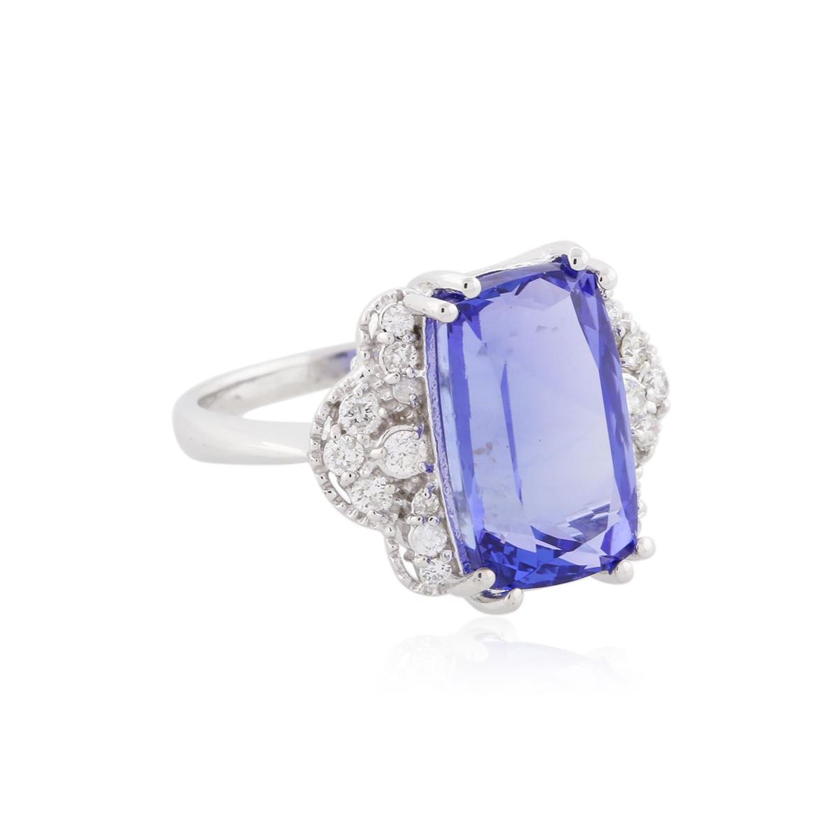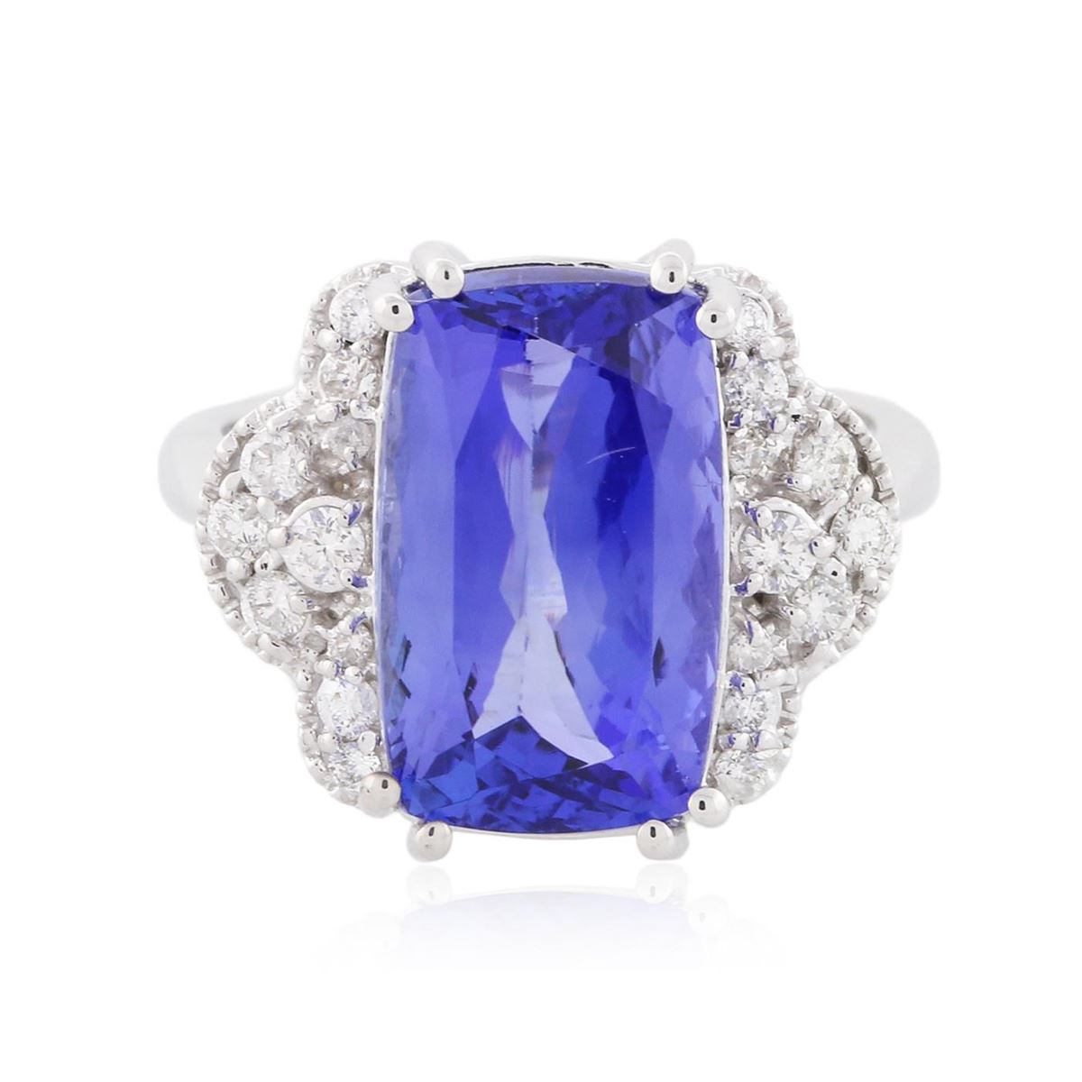 One electronically tested 14KT white gold Ladies combination cast & assembled ring with a high polish finish. Condition is new. Identified with markings of "K14". Containing: One prong set rectangular cushion modified mixed cut natural tanzanite, measuring 14.00 x 9.00 x 6.00mm, approximate weight of 7.07ct., clarity is eye clean, type I, medium, moderately strong, bluish violet color, (GIA bV 5/4), cut is very good. Colored gemstones are presumed to have been subjected to commonly used color/clarity enhancement processes. Twelve prong set round brilliant cut diamonds, measuring 1.50 - 1.30 x 0.84mm (depth est.) approximate. Total Weight of 12 Stones = 0.15ct. Clarity: SI-1 to I-1. Color: H - I, Cut is Good. Eight prong set round brilliant cut diamonds, measuring 2.00 - 2.00 x 1.20mm (depth est.) approximate. Total Weight of 8 Stones = 0.16ct. Clarity: SI-2 to I-1. Color: I - J, Cut is Good. Total Weight of Colored Stones 7.07ct. Total Weight of Diamonds 0.31ct. Total Weight of Ring 6.40 grams. GGL Appraised at $12,260.00.