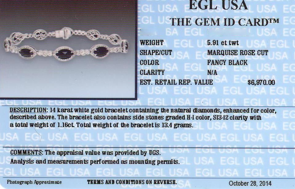 One 14KT white gold bracelet containing natural marquise rose cut fancy black diamonds, enhanced for color, with a total weight of 5.91ct. The bracelet also contains side stones graded H-I color, SI3-I2 clarity with a total weight of 1.16ct. Total weight of the bracelet is 13.40 grams. EGL Appraised at $6,970.00.