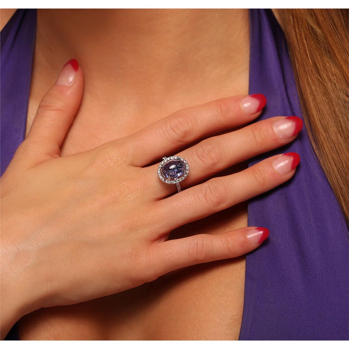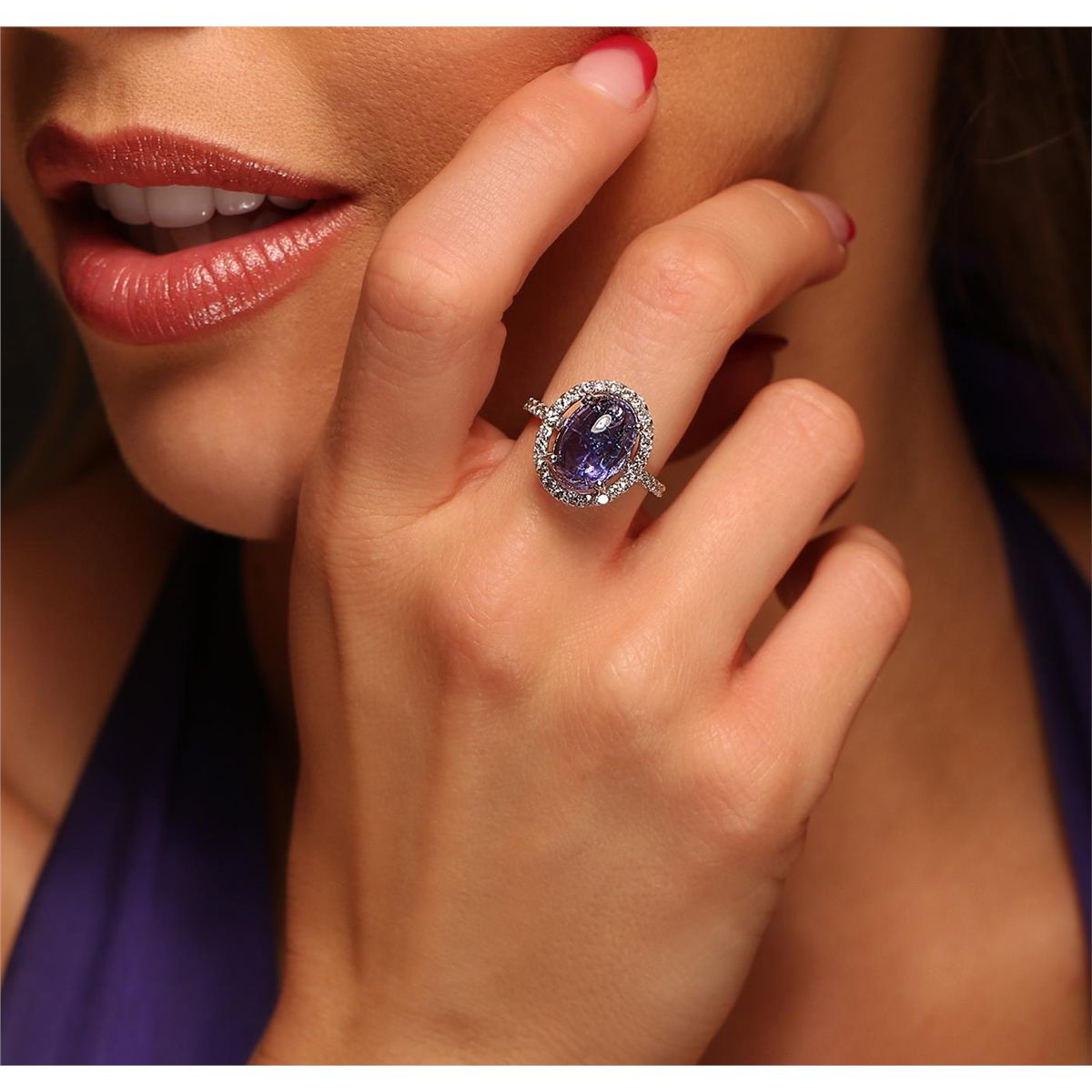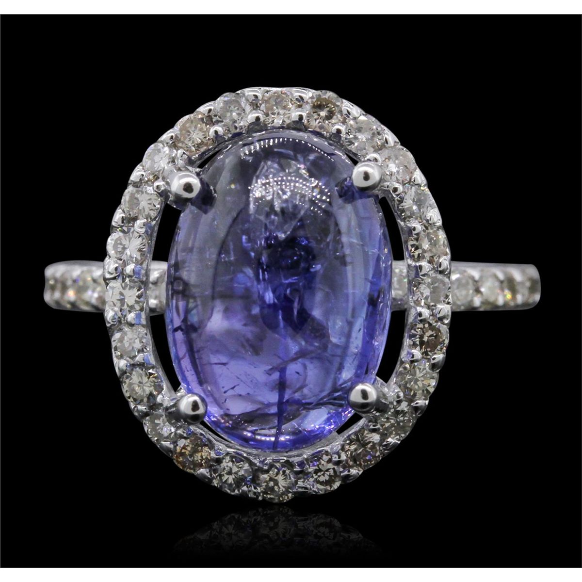 One electronically tested 14KT white gold ladies cast tanzanite and diamond ring with a bright polish finish. The featured tanzanite is set within a diamond bezel supported by diamond set shoulders, completed by a one and one-half millimeter wide band. Identified with markings of "K14". Condition is new, good workmanship. Containing: One prong set oval cabochon cut natural tanzanite, measuring 12.60 x 8.80 x 6.15mm, 10%. bulge factor, approximate weight of 7.09ct., clarity is moderately included, type I, medium dark, moderately strong, bluish violet color, (GIA bV 6/4), cut is good. Transmitting light somewhat diffusely, transparent to translucent. Naturally occurring internal & external characteristics are present. Colored Stone Grading Report attached. Graded in the setting. Tanzanite is a very rare gemstone that is only found in the country of Tanzania. Originally discovered in 1967. Tiffany & Company, named the stone Tanzanite. It is found in the Usumburu Mountains that border the Umba Valley of northern Tanzania. Tanzanite occurs in gray, brown, violet, blue, reddish-purple, & green. The gem is interesting because of its exceptional pleochroism. Rotated in different directions a tanzanite will exhibit multiple changes of color. Tanzanite has a low tolerance to ultrasonic cleaning, and should not be cleaned using this method. Forty-Eight prong set round brilliant cut diamonds, measuring 1.80 - 1.70 x 1.05mm (depth est.) approximate. Total Weight of 48 Stones = 1.04ct. Faint brown secondary color throughout. Graded in the setting. Clarity: SI-1 to I-1. Color: I - K. Total Weight of Colored Stones 7.09ct. Total Weight of Diamonds 1.04ct. AIG Appraised at $8,015.00.