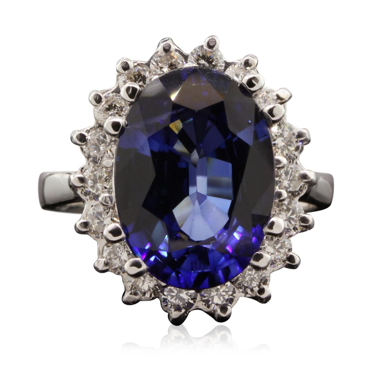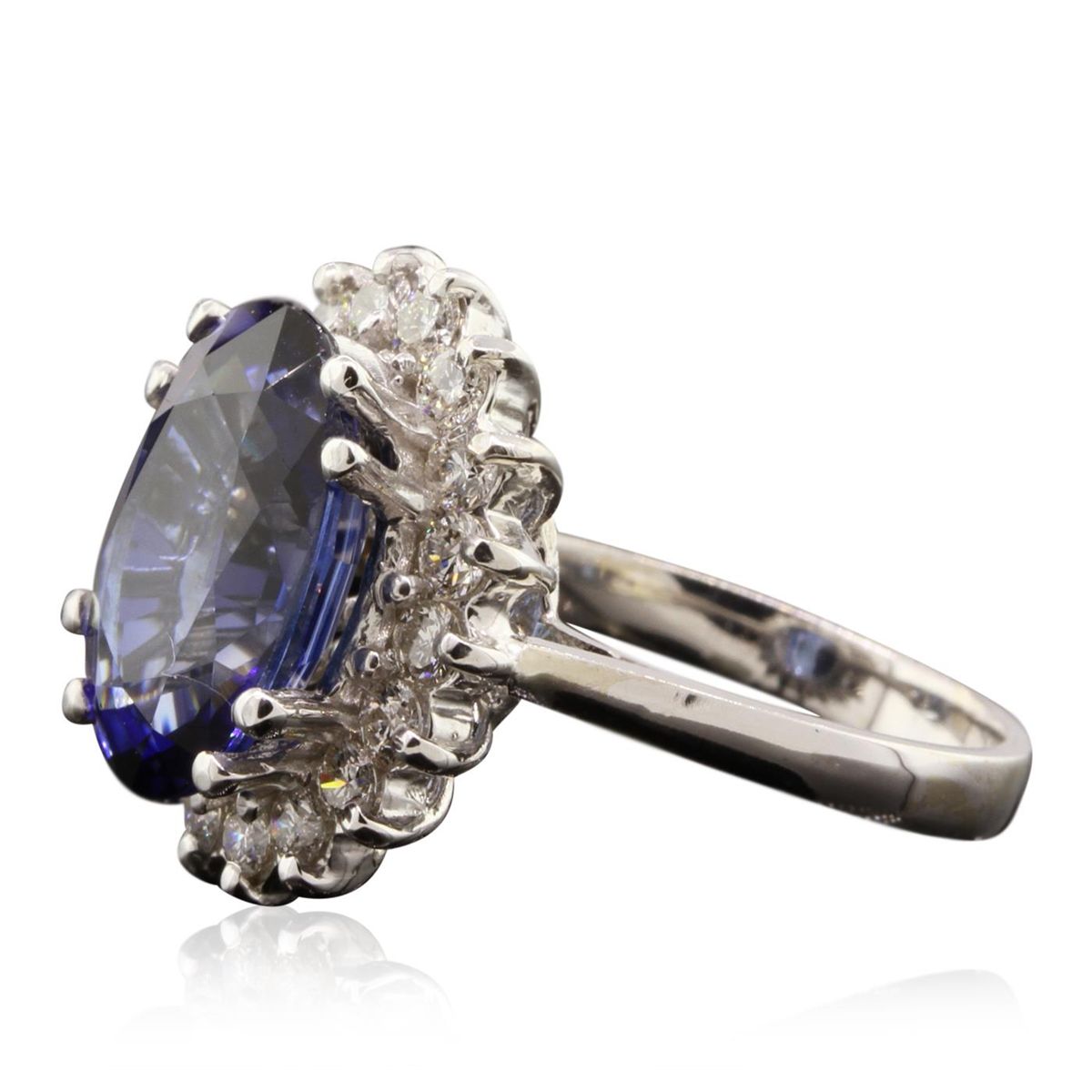 One electronically tested 14KT white gold Ladies combination cast & assembled ring with a bright polish finish. Identified with markings of "14K". Condition is excellent. Containing: One prong set oval modified brilliant cut natural blue sapphire, measuring 13.90 x 10.00 x 6.00mm, approximate weight of 7.13ct., clarity is eye clean, type II, medium dark, moderately strong, blue color, (GIA B 6/4), cut is good. Colored gemstones are presumed to have been subjected to commonly used and possible undetectable color/clarity enhancement processes. Eighteen prong set round brilliant cut diamonds, measuring 2.10 - 2.10 x 1.26mm (depth est.) approximate total weight of 18 Stones = 0.84ct. Clarity of SI-2 to I-1, Color of J - K, Cut is Good. Total Weight of Colored Stones 7.13ct. Total Weight of Diamonds 0.84ct. Total Weight of Ring 6.90gm. GGL Appraised at $17,445.00.