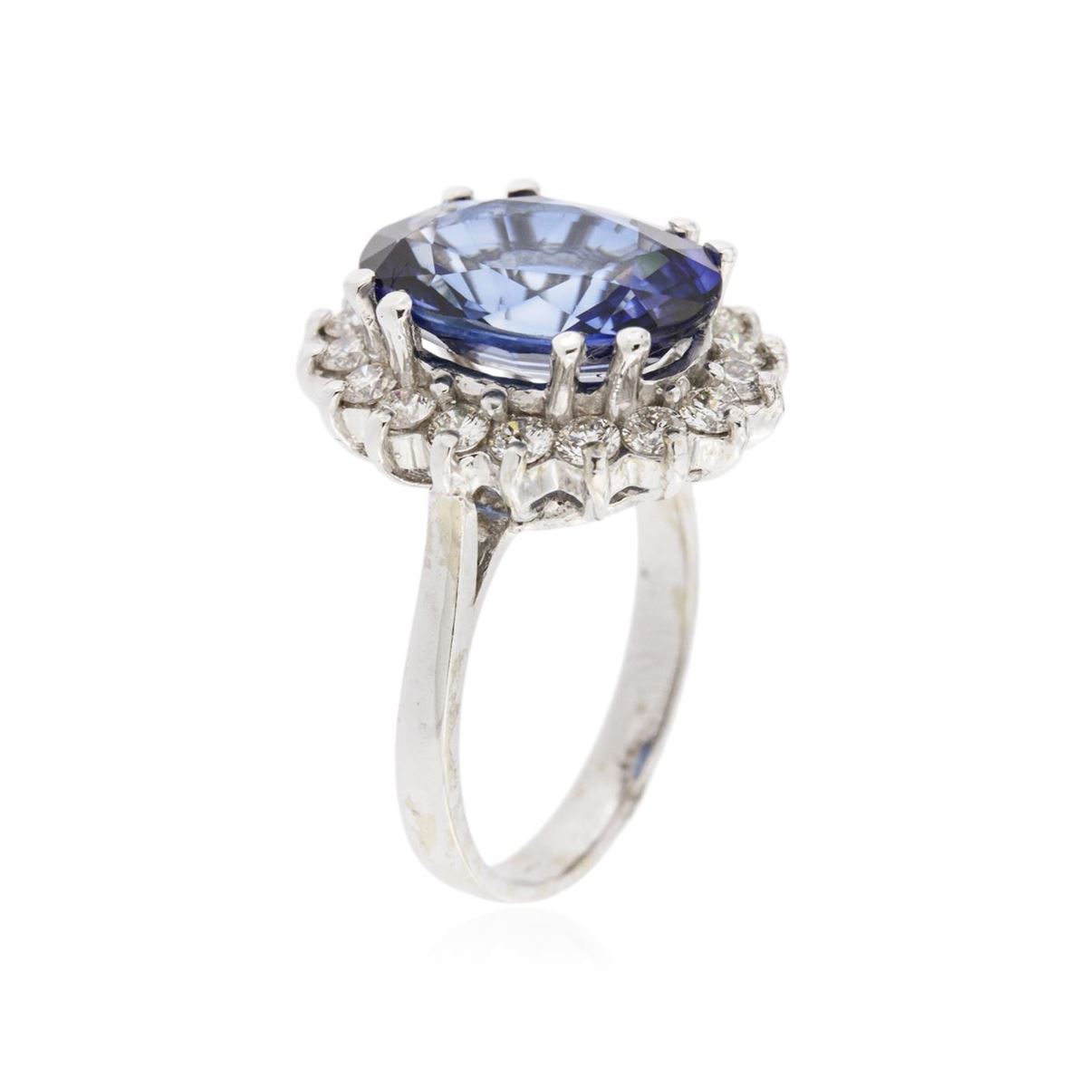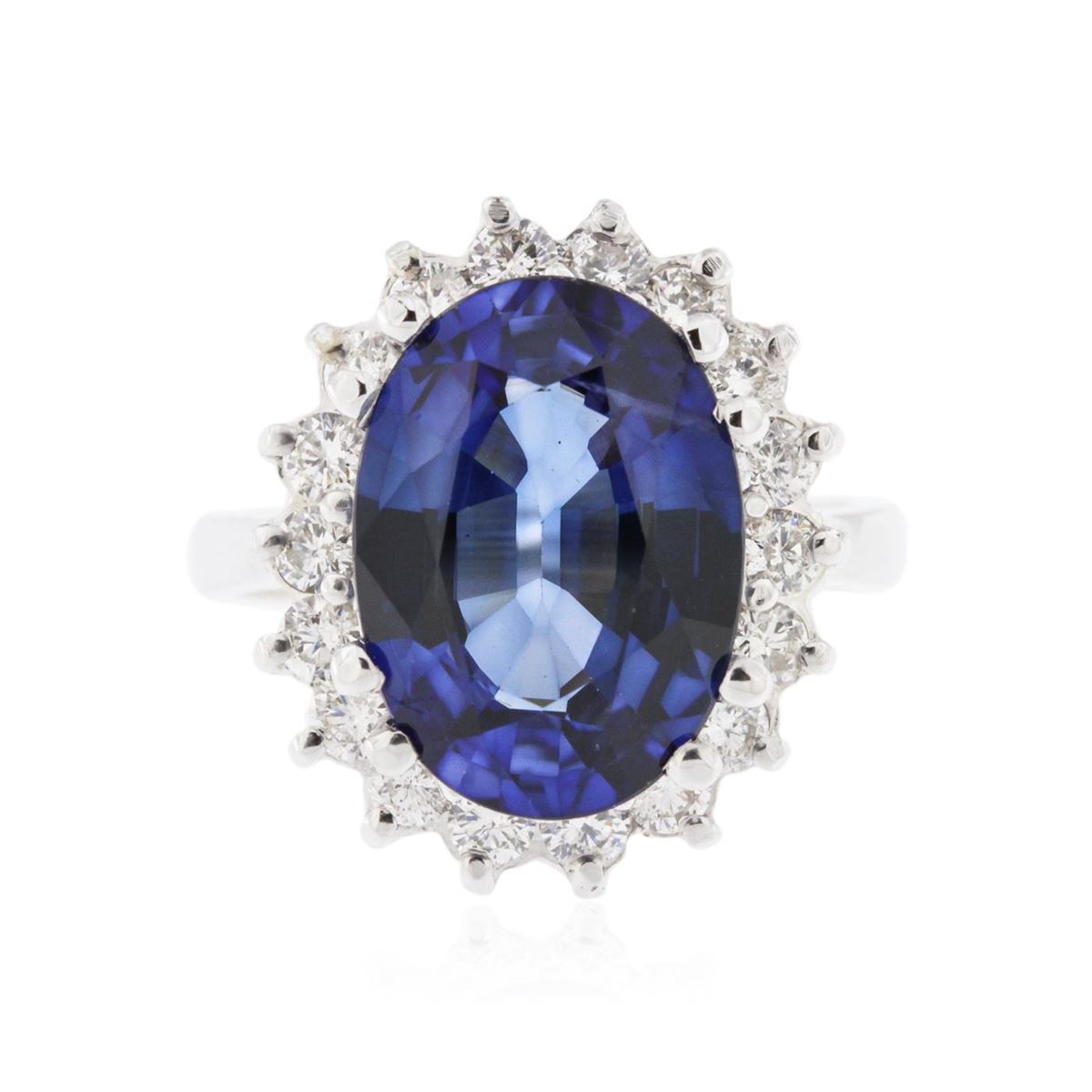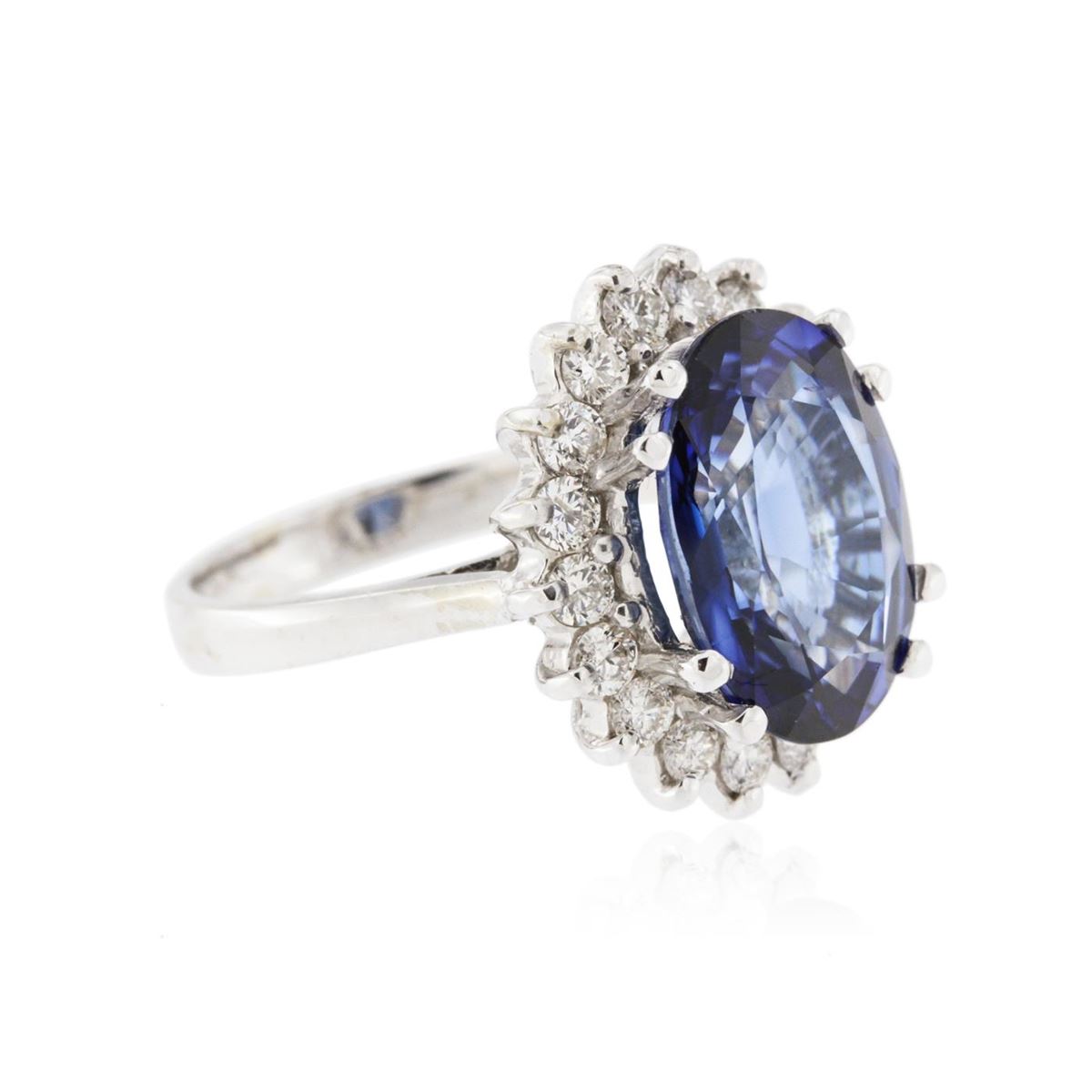 One electronically tested 14KT white gold Ladies combination cast & assembled ring with a bright polish finish. Identified with markings of "14K". Condition is excellent. Containing: One prong set oval modified brilliant cut natural blue sapphire, measuring 13.90 x 10.00 x 6.00mm, approximate weight of 7.13ct., clarity is eye clean, type II, medium dark, moderately strong, blue color, (GIA B 6/4), cut is good. Colored gemstones are presumed to have been subjected to commonly used and possible undetectable color/clarity enhancement processes. Eighteen prong set round brilliant cut diamonds, measuring 2.10 - 2.10 x 1.26mm (depth est.) approximate total weight of 18 Stones = 0.84ct. Clarity of SI-2 to I-1, Color of J - K, Cut is Good. Total Weight of Colored Stones 7.13ct. Total Weight of Diamonds 0.84ct. Total Weight of Ring 6.90gm. GGL Appraised at $17,445.00.