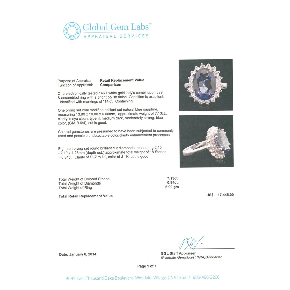 One electronically tested 14KT white gold Ladies combination cast & assembled ring with a bright polish finish. Identified with markings of "14K". Condition is excellent. Containing: One prong set oval modified brilliant cut natural blue sapphire, measuring 13.90 x 10.00 x 6.00mm, approximate weight of 7.13ct., clarity is eye clean, type II, medium dark, moderately strong, blue color, (GIA B 6/4), cut is good. Colored gemstones are presumed to have been subjected to commonly used and possible undetectable color/clarity enhancement processes. Eighteen prong set round brilliant cut diamonds, measuring 2.10 - 2.10 x 1.26mm (depth est.) approximate total weight of 18 Stones = 0.84ct. Clarity of SI-2 to I-1, Color of J - K, Cut is Good. Total Weight of Colored Stones 7.13ct. Total Weight of Diamonds 0.84ct. Total Weight of Ring 6.90gm. GGL Appraised at $17,445.00.