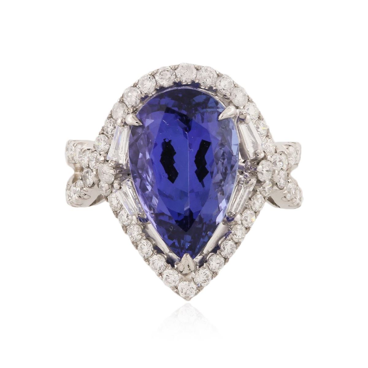 One electronically tested 14KT white gold ladies cast tanzanite and diamond ring with a bright polish finish. Condition is new, good workmanship. The featured tanzanite is set within a diamond bezel, supported by diamond set split shoulders and completed by a two and one-half millimeter wide band. Trademark is UCG. Identified with markings of "14K 585". Containing: One prong set pear mixed cut natural tanzanite, measuring 15.10 x 9.60 x 7.00mm, 8%. bulge factor, approximate weight of 7.34ct., clarity is eye clean, type I, medium, very slightly grayish, bluish violet color, (GIA bV 5/3), cut is good. Transmitting light with no distortion, transparent. Colored Stone Grading Report attached. Graded in the setting. Tanzanite is a very rare gemstone that is only found in the country of Tanzania. Originally discovered in 1967. Tiffany & Company, named the stone Tanzanite. It is found in the Usumburu Mountains that border the Umba Valley of northern Tanzania. Tanzanite occurs in gray, brown, violet, blue, reddish-purple, & green. The gem is interesting because of its exceptional pleochroism. Rotated in different directions a tanzanite will exhibit multiple changes of color. Tanzanite has a low tolerance to ultrasonic cleaning, and should not be cleaned using this method. Fifty-Four prong set round brilliant cut diamonds, measuring 1.80 - 1.70 x 1.05mm (depth est.) approximate. Total Weight of 54 Stones = 1.21ct. Graded in the setting. Clarity: SI-2 to I-2. Color: F - H Four prong set baguette cut diamonds, measuring from 3.20 x 1.20 x 0.84mm (depth est.) to 3.70 x 1.50 x 1.05mm (depth est.) approximate. Total Weight of 4 Stones = 0.20ct. Graded in the setting. Clarity: VVS-2 to VS-2. Color: F - H. Total Weight of Colored Stones 7.34ct. Total Weight of Diamonds 1.41ct. Total Weight of Ring 6.40 grams. AIG Appraised at $22,385.00.