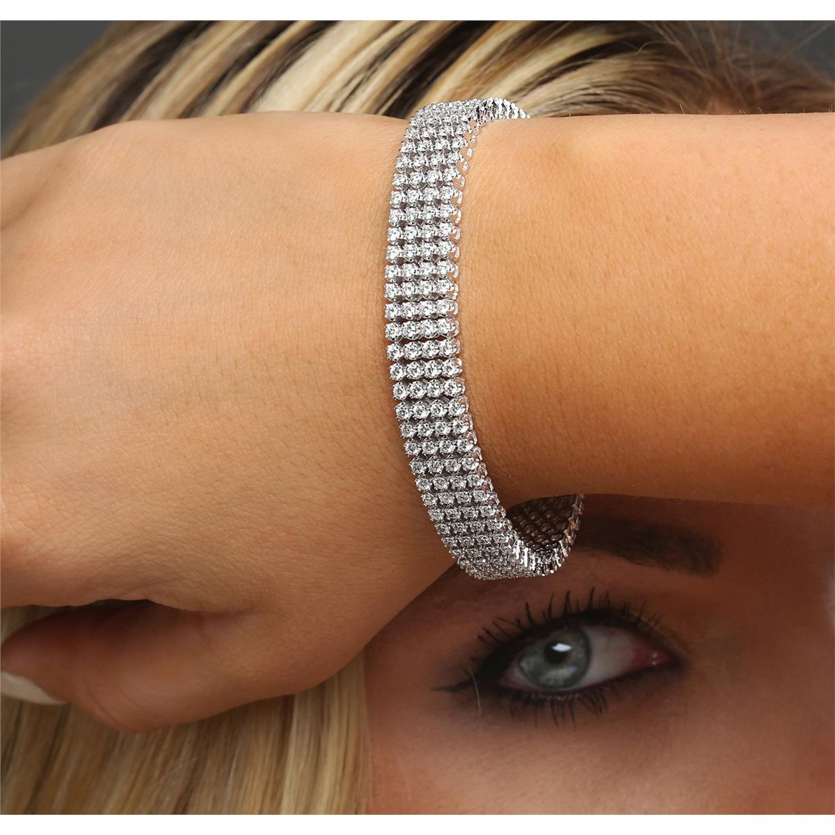 One electronically tested 14KT white gold ladies cast & assembled diamond bracelet with a bright polish finish. Seven inch length bracelet features four flexible diamond ribbons, terminating in a concealed clasp with safety. Identified with markings of 14K. Condition is new, good workmanship. Containing: Two Hundred Sixty prong set round brilliant cut diamonds, measuring 2.00 - 1.90 x 1.17mm (depth est.) approximate total weight of 260 Stones = 7.14ct. Graded in the setting. Clarity: SI-1 to I-1. Color: G - I. Total Weight of Diamonds 7.14ct. Total Weight of Bracelet 29.63 grams. AIG Appraised at $25,205.00.