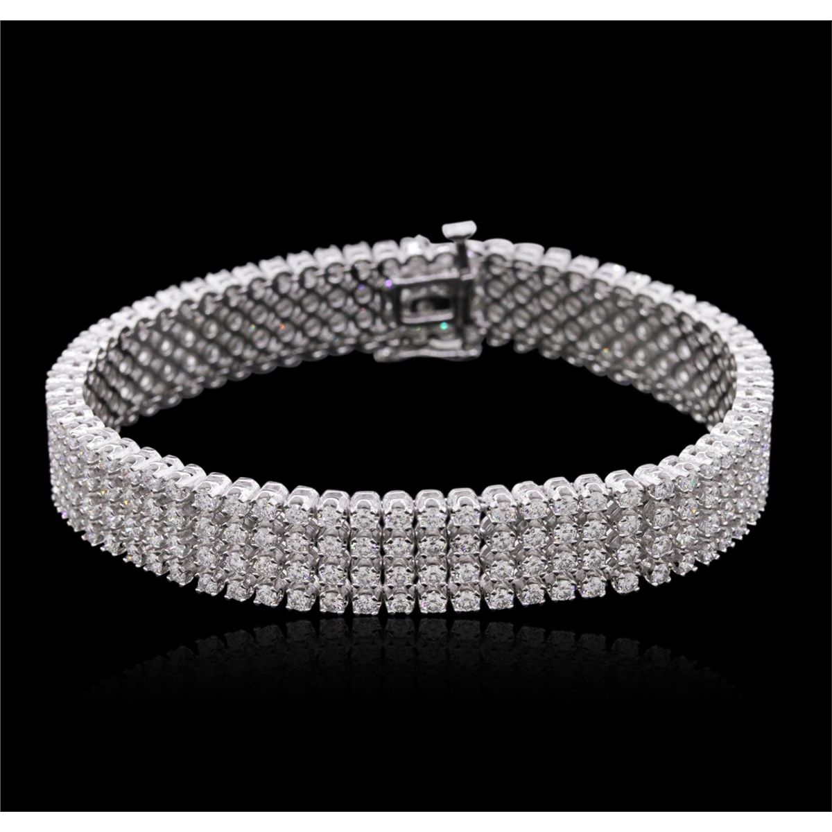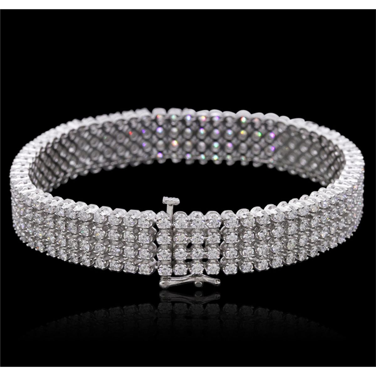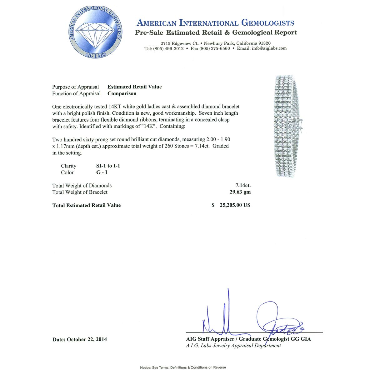 One electronically tested 14KT white gold ladies cast & assembled diamond bracelet with a bright polish finish. Seven inch length bracelet features four flexible diamond ribbons, terminating in a concealed clasp with safety. Identified with markings of 14K. Condition is new, good workmanship. Containing: Two Hundred Sixty prong set round brilliant cut diamonds, measuring 2.00 - 1.90 x 1.17mm (depth est.) approximate total weight of 260 Stones = 7.14ct. Graded in the setting. Clarity: SI-1 to I-1. Color: G - I. Total Weight of Diamonds 7.14ct. Total Weight of Bracelet 29.63 grams. AIG Appraised at $25,205.00.