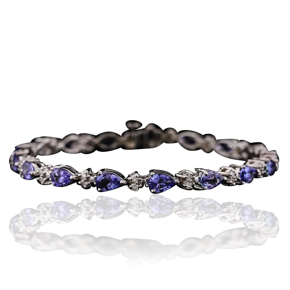 One electronically tested 14KT white gold ladies combination cast & assembled bracelet with a hidden box clasp with a bright polish finish. Measurements: 7" in length Identified with markings of "14K". Condition is new. Containing: Seventeen prong set pear modified brilliant cut natural tanzanites, measuring 6.00 x 4.00 x 2.60mm, approximate total weight of 7.14ct., clarity is eye clean, type I, medium light, moderately strong, bluish violet color, (GIA bV 4/4), cut is good. Fifty-One prong set round brilliant cut diamonds, measuring 1.50 - 1.50 x 0.90mm (depth est.) approximate total weight of 51 Stones = 0.63ct. Clarity: I-1 to I-2. Color: I - J, Cut is Good. Colored gemstones are presumed to have been subjected to commonly used enhancement processes. All diamonds and colored gemstones are graded in the mounting, unless otherwise stated. Total Weight of Colored Stones 7.14ct. Total Weight of Diamonds 0.63ct. Total Weight of Bracelet 11.60 grams. GGL Appraised at $9,320.00.