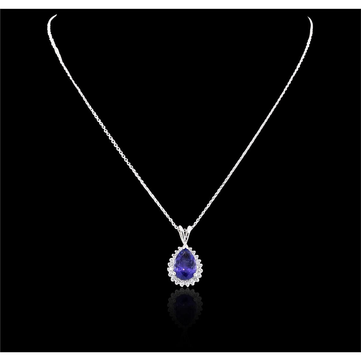 One electronically tested 14KT white gold ladies combination cast & assembled tanzanite and diamond pendant & chain 18.0" long, cable link with a lobster claw clasp with a bright polish finish. Condition is new. Containing: One prong set pear modified brilliant cut natural tanzanite, measuring 14.72 x 10.18 x 6.84mm, exact weight 7.16ct., clarity is eye clean, type I, medium light, moderately strong, violet color, (GIA V 4/4), cut is good. Twenty-One prong set round brilliant cut diamonds, measuring 1.60 - 1.60 x 0.96mm (depth est.) approximate total weight of 21 Stones = 0.31ct. Clarity: SI-2 to I-1. Color: I - J, Cut is Good. All diamonds and colored gemstones are graded in the mounting, unless otherwise stated. Colored gemstones are presumed to have been subjected to commonly used enhancement processes. Total Weight of Colored Stones 7.16ct. Total Weight of Diamonds 0.31ct. Total Weight of Pendant & Chain 8.00 grams. GGL Appraised at $9,285.00.