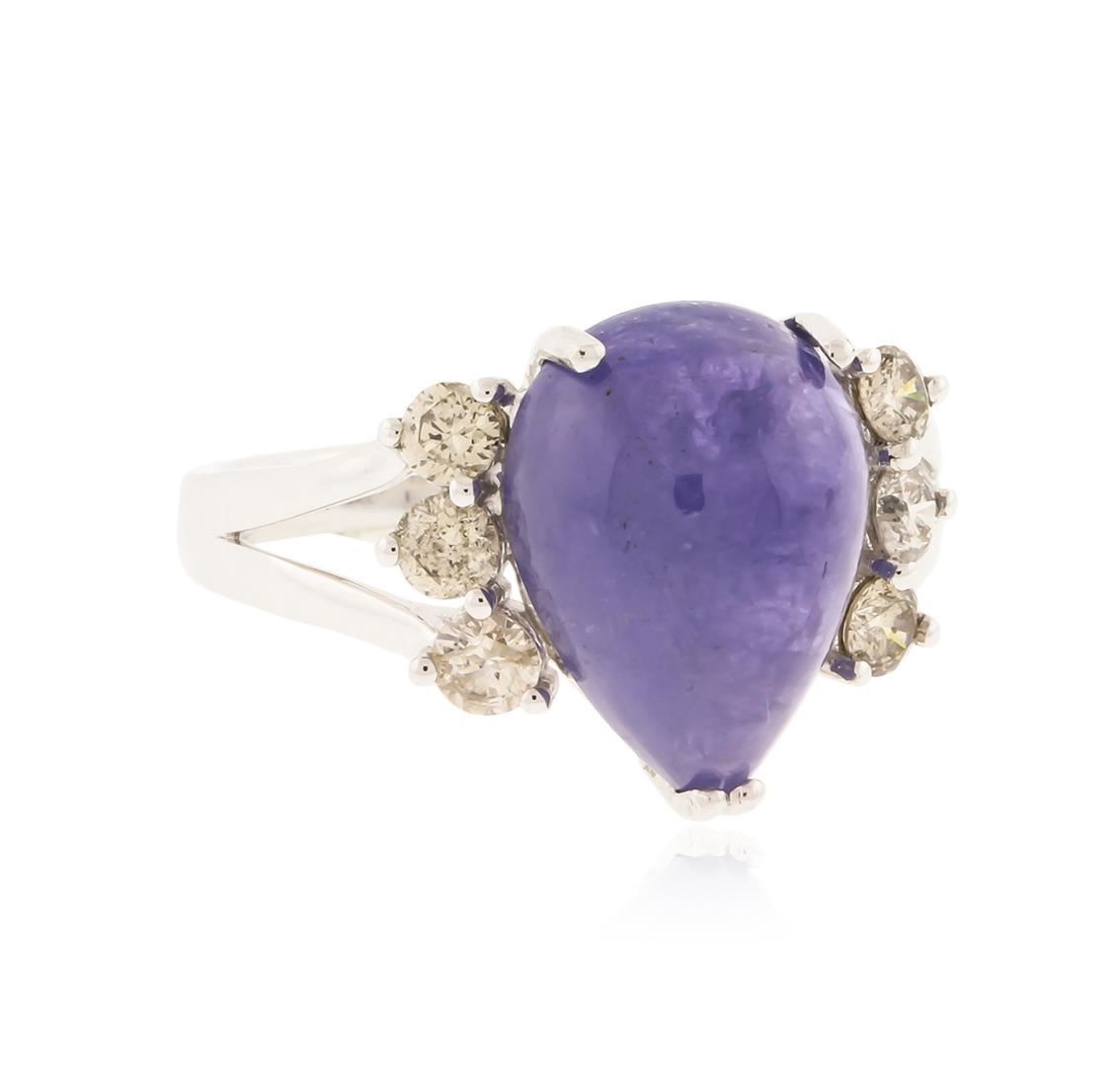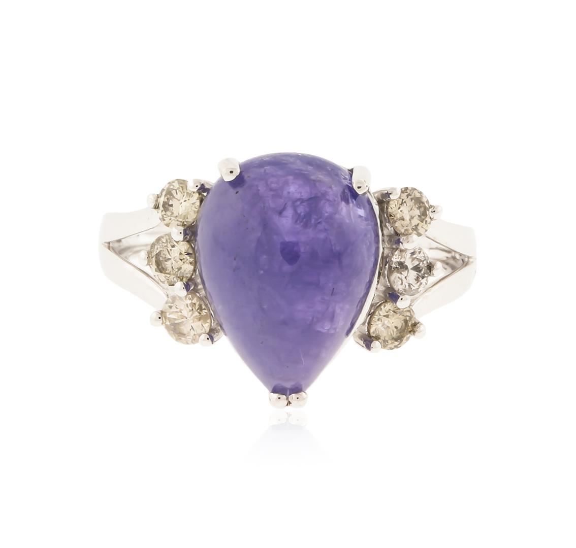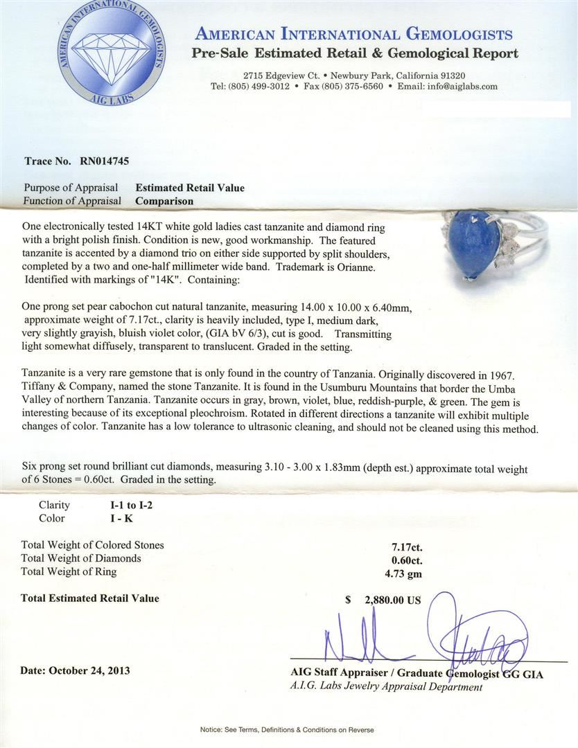 One electronically tested 14KT white gold ladies cast tanzanite and diamond ring with a bright polish finish. The featured tanzanite is accented by a diamond trio on either side supported by split shoulders, completed by a two and one-half millimeter wide band. Trademark is Orianne. Identified with markings of "14K". Condition is new, good workmanship. Containing: One prong set pear cabochon cut natural tanzanite, measuring 14.00 x 10.00 x 6.40mm, approximate weight of 7.17ct., clarity is heavily included, type I, medium dark, very slightly grayish, bluish violet color, (GIA bV 6/3), cut is good. Transmitting light somewhat diffusely, transparent to translucent. Graded in the setting. Tanzanite is a very rare gemstone that is only found in the country of Tanzania. Originally discovered in 1967. Tiffany & Company, named the stone Tanzanite. It is found in the Usumburu Mountains that border the Umba Valley of northern Tanzania. Tanzanite occurs in gray, brown, violet, blue, reddish-purple, & green. The gem is interesting because of its exceptional pleochroism. Rotated in different directions a tanzanite will exhibit multiple changes of color. Tanzanite has a low tolerance to ultrasonic cleaning, and should not be cleaned using this method. Six prong set round brilliant cut diamonds, measuring 3.10 - 3.00 x 1.83mm (depth est.) approximate total weight of 6 Stones = 0.60ct. Graded in the setting. Clarity: I-1 to I-2. Color: I - K. Total Weight of Colored Stones 7.17ct. Total Weight of Diamonds 0.60ct. Total Weight of Ring 4.73gm. AIG Appraised at $2,880.00.
