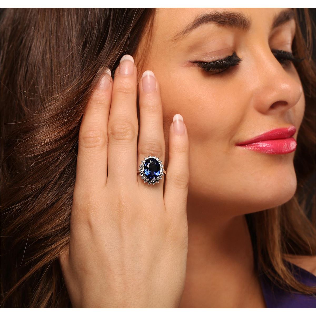 One electronically tested 14KT White Gold ladies cast sapphire and diamond ring with a bright polish finish. Condition is new, good workmanship. The featured sapphire is set within a diamond bezel supported by tapering shoulders, completed by a two and one-half millimeter wide band. Identified with markings of "K14". Containing: One prong set oval mixed cut natural blue sapphire, measuring 13.80 x 10.00 x 5.75mm, 10%. bulge factor, approximate weight of 7.17ct., clarity is eye clean, type II, dark, moderately strong, blue color, (GIA B 7/4), cut is good. Transmitting light with no distortion, transparent. Indications of laboratory high temperature diffusion treatment. Colored Stone Grading Report attached. Graded in the setting. Eighteen prong set round brilliant cut diamonds, measuring 2.40 - 2.30 x 1.41mm (depth est.) approximate. Total Weight of 18 Stones = 0.95ct. Graded in the setting. Clarity: SI-2 to I-1. Color: H - J. Total Weight of Colored Stones 7.17ct. Total Weight of Diamonds 0.95ct. Total Weight of Ring 6.8 grams. AIG Appraised at $6,025.00.