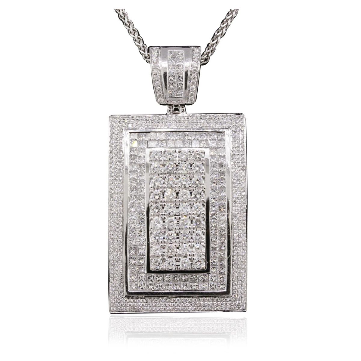 One electronically tested 14KT white gold ladies cast & assembled diamond pendant with chain. Condition is new, good workmanship. The pendant features a diamond set bar, completed by a diamond set bail. Area measurements 42.00 x 29.00 x 10.00 mm. Supported by a sixteen inch length 14KT white gold designer style chain terminating in a lobster claw clasp. Bright polish finish. Identified with markings of "14K". Containing: Thirty-Six prong set round brilliant cut diamonds, measuring 2.60 - 2.60 x 1.56mm (depth est.) approximate. Total Weight of 36 Stones = 2.41ct. Graded in the setting. Clarity: SI-2 to I-2 . Color: G - I One Hundred Sixteen invisible set princess cut diamonds, measuring 1.80 x 1.70 x 1.28mm (depth est.) approximate. Total Weight of 116 Stones = 3.82ct. Measurements are an average for the group. Graded in the setting. Clarity: VS-2 to SI-2 . Color: G - I Four Hundred Thirty-Two pav‚ set round brilliant cut diamonds, measuring 0.80 - 0.70 x 0.45mm (depth est.) approximate. Total Weight of 432 Stones = 0.74ct. Graded in the setting. Clarity: SI-2 to I-2 . Color: G - I Twenty prong set round brilliant cut diamonds, measuring 1.30 - 1.20 x 0.75mm (depth est.) approximate. Total Weight of 20 Stones = 0.21ct. Graded in the setting. Clarity: I-1 to I-2 . Color: G - I. Total Weight of Diamonds 7.18ct.. Total Weight of Pendant With Chain 34.50 grams. AIG Appraised at $27,500.00.