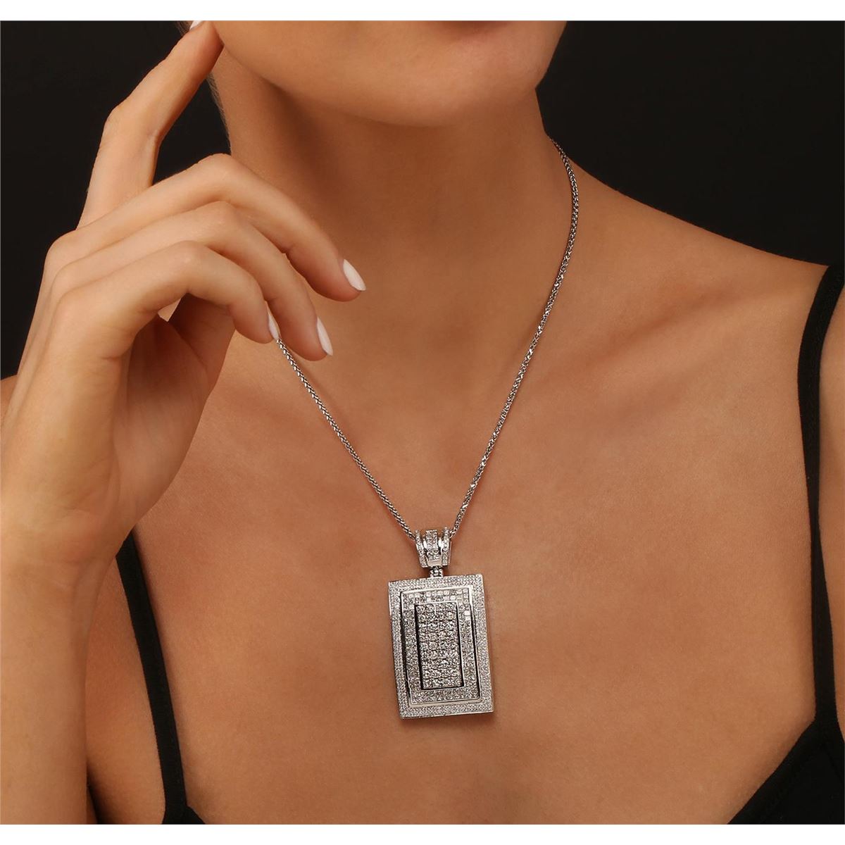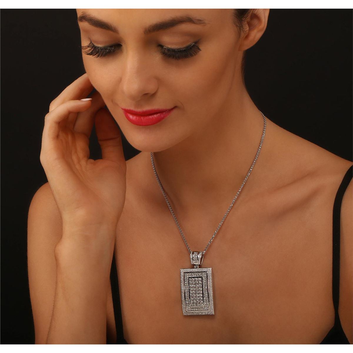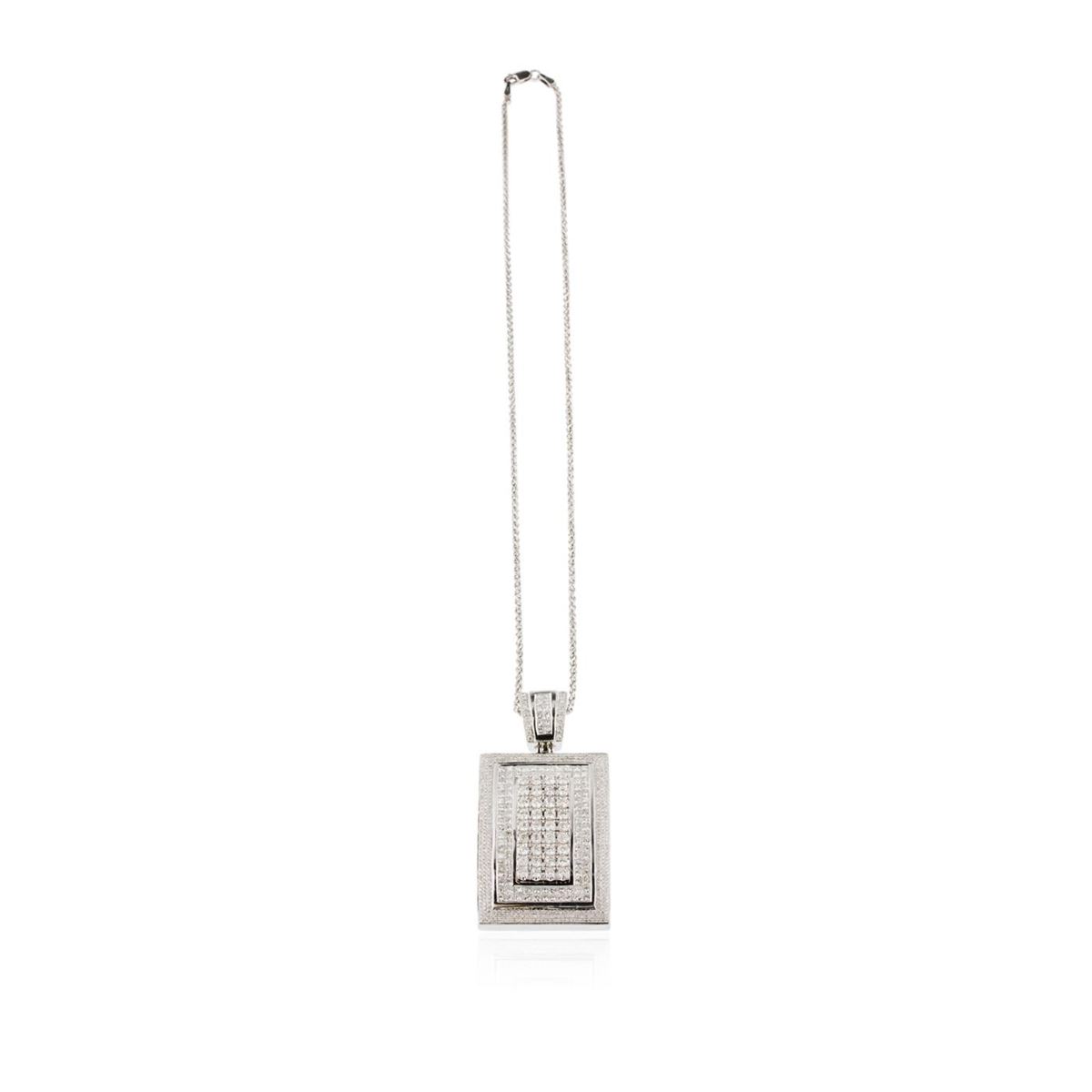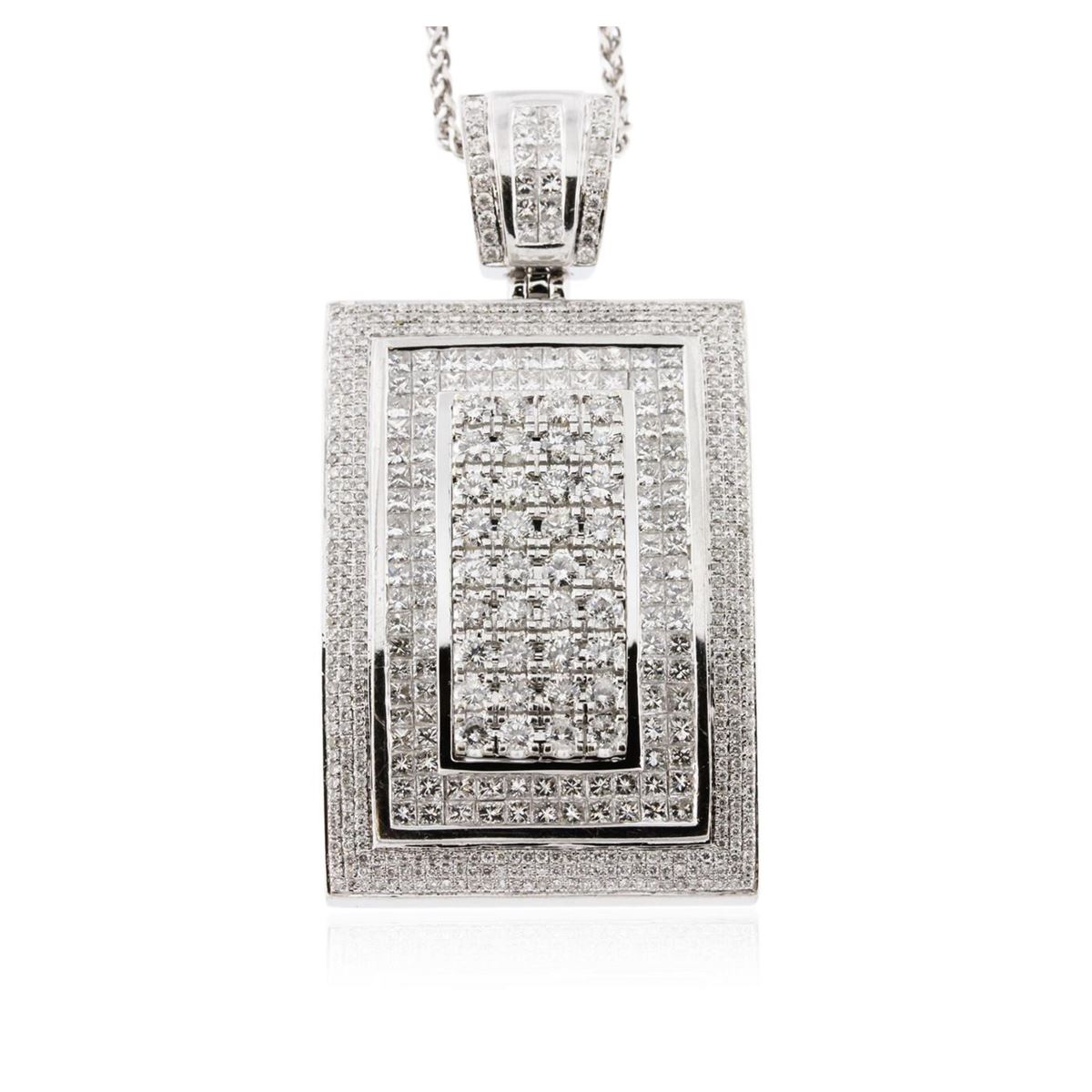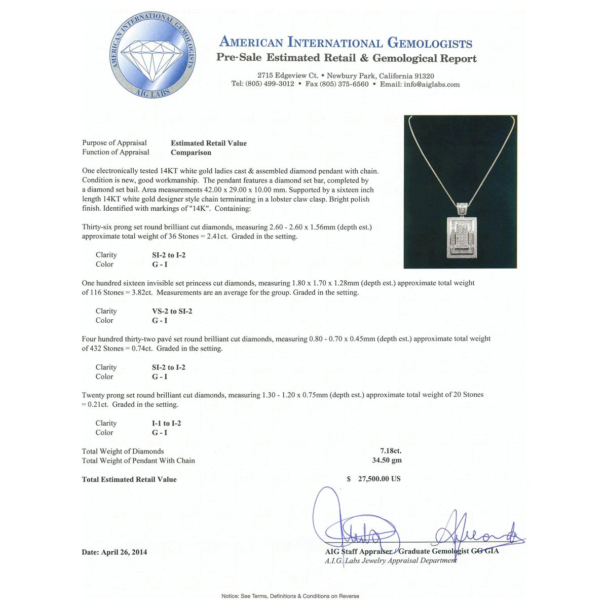 One electronically tested 14KT white gold ladies cast & assembled diamond pendant with chain. Condition is new, good workmanship. The pendant features a diamond set bar, completed by a diamond set bail. Area measurements 42.00 x 29.00 x 10.00 mm. Supported by a sixteen inch length 14KT white gold designer style chain terminating in a lobster claw clasp. Bright polish finish. Identified with markings of "14K". Containing: Thirty-Six prong set round brilliant cut diamonds, measuring 2.60 - 2.60 x 1.56mm (depth est.) approximate. Total Weight of 36 Stones = 2.41ct. Graded in the setting. Clarity: SI-2 to I-2 . Color: G - I One Hundred Sixteen invisible set princess cut diamonds, measuring 1.80 x 1.70 x 1.28mm (depth est.) approximate. Total Weight of 116 Stones = 3.82ct. Measurements are an average for the group. Graded in the setting. Clarity: VS-2 to SI-2 . Color: G - I Four Hundred Thirty-Two pav‚ set round brilliant cut diamonds, measuring 0.80 - 0.70 x 0.45mm (depth est.) approximate. Total Weight of 432 Stones = 0.74ct. Graded in the setting. Clarity: SI-2 to I-2 . Color: G - I Twenty prong set round brilliant cut diamonds, measuring 1.30 - 1.20 x 0.75mm (depth est.) approximate. Total Weight of 20 Stones = 0.21ct. Graded in the setting. Clarity: I-1 to I-2 . Color: G - I. Total Weight of Diamonds 7.18ct.. Total Weight of Pendant With Chain 34.50 grams. AIG Appraised at $27,500.00.