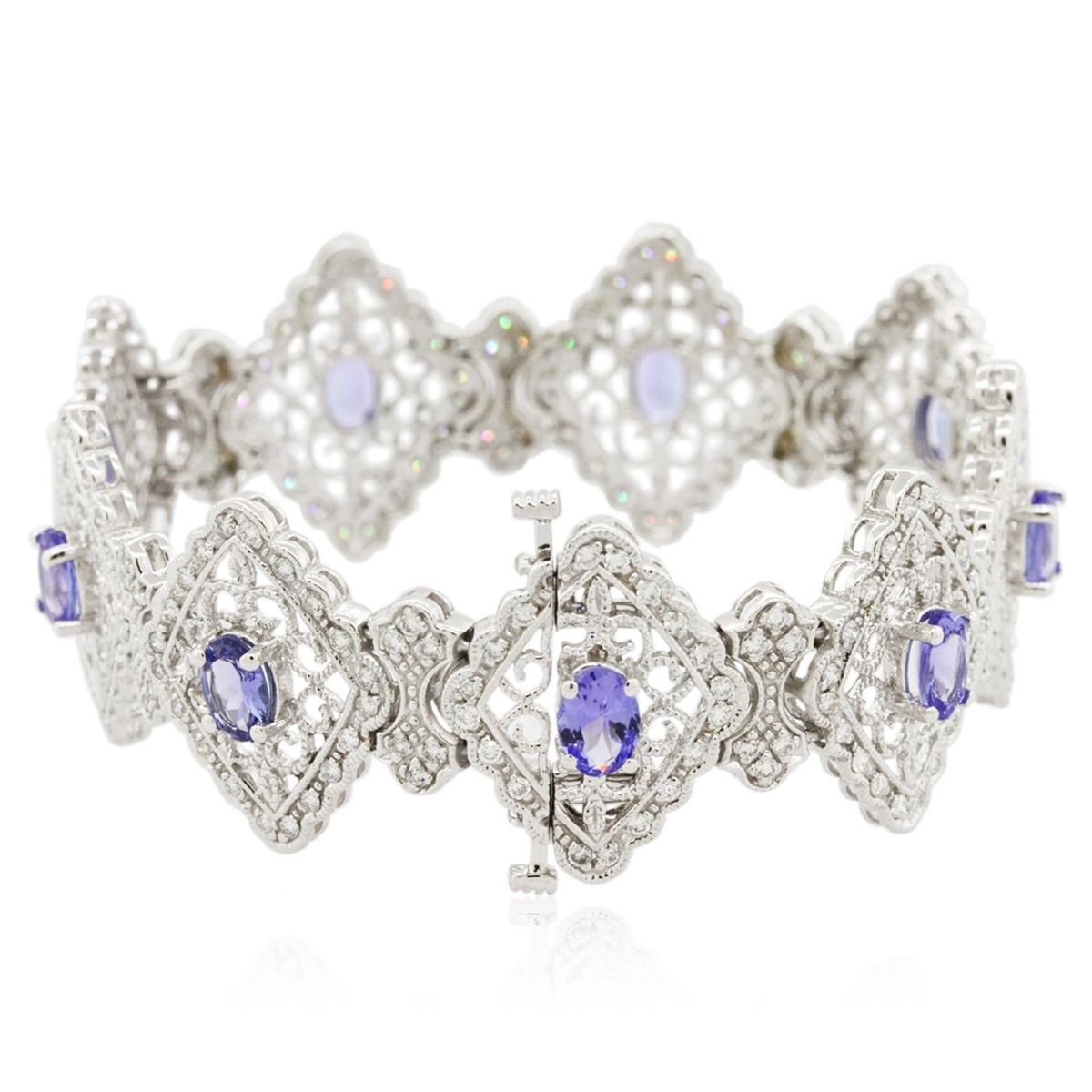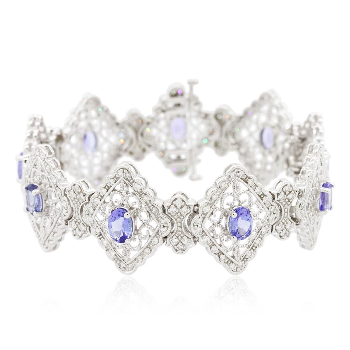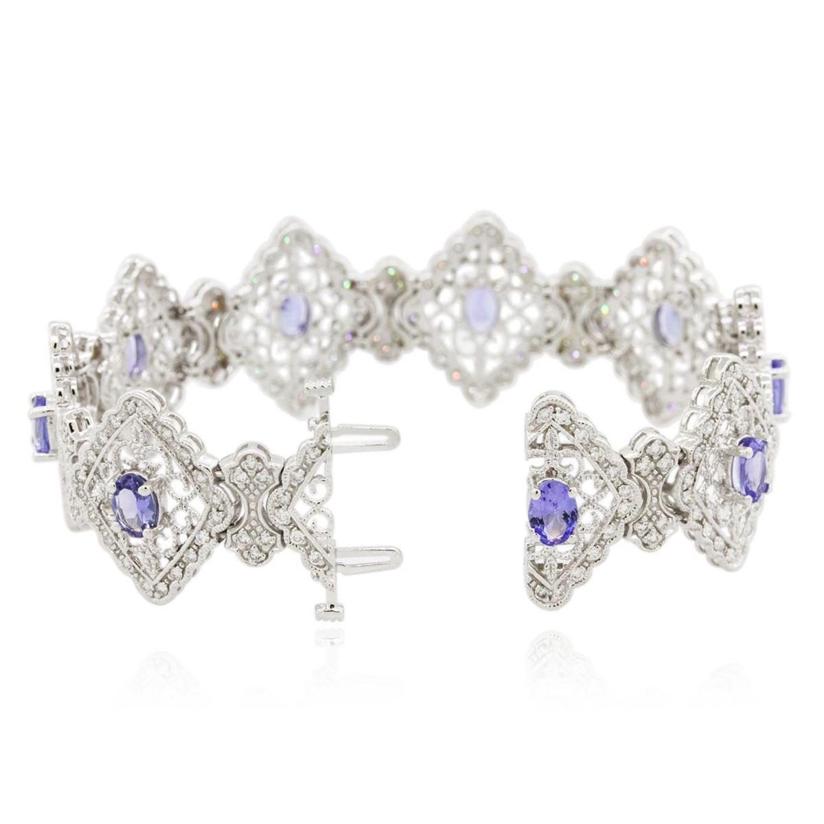 One electronically tested 14KT white gold ladies cast tanzanite and diamond bracelet with a hidden box clasp with a bright polish finish. Measurements: 7.5" in length Condition is new. Containing: Nine prong set oval modified brilliant cut natural tanzanites, measuring 7.00 x 5.00 x 3.25mm, approximate total weight of 7.20ct., clarity is eye clean, type I, medium light, very slightly grayish, violet color, (GIA V 4/3), cut is good. Four Hundred Four prong set round brilliant cut diamonds, measuring 1.30 - 1.30 x 0.78mm (depth est.) approximate total weight of 404 Stones = 3.23ct. Clarity: SI-1 to SI-2. Color: I - J, Cut is Good. Colored gemstones are presumed to have been subjected to commonly used enhancement processes. All diamonds and colored gemstones are graded in the mounting, unless otherwise stated. Total Weight of Colored Stones 7.20ct. Total Weight of Diamonds 3.23ct. Total Weight of Bracelet 35.10 grams. GGL Appraised at $15,840.00.