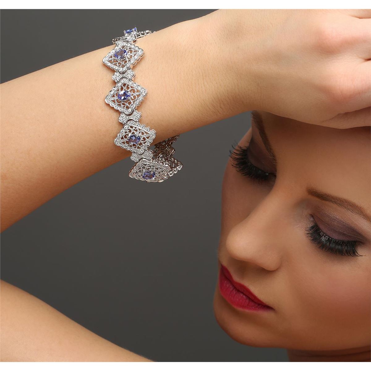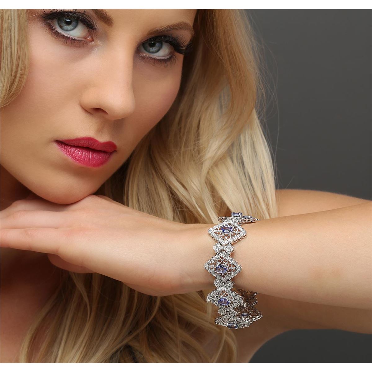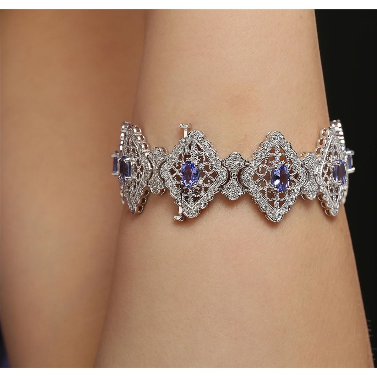 One electronically tested 14KT white gold ladies cast tanzanite and diamond bracelet with a hidden box clasp with a bright polish finish. Measurements: 7.5" in length Condition is new. Containing: Nine prong set oval modified brilliant cut natural tanzanites, measuring 7.00 x 5.00 x 3.25mm, approximate total weight of 7.20ct., clarity is eye clean, type I, medium light, very slightly grayish, violet color, (GIA V 4/3), cut is good. Four Hundred Four prong set round brilliant cut diamonds, measuring 1.30 - 1.30 x 0.78mm (depth est.) approximate total weight of 404 Stones = 3.23ct. Clarity: SI-1 to SI-2. Color: I - J, Cut is Good. Colored gemstones are presumed to have been subjected to commonly used enhancement processes. All diamonds and colored gemstones are graded in the mounting, unless otherwise stated. Total Weight of Colored Stones 7.20ct. Total Weight of Diamonds 3.23ct. Total Weight of Bracelet 35.10 grams. GGL Appraised at $15,840.00.