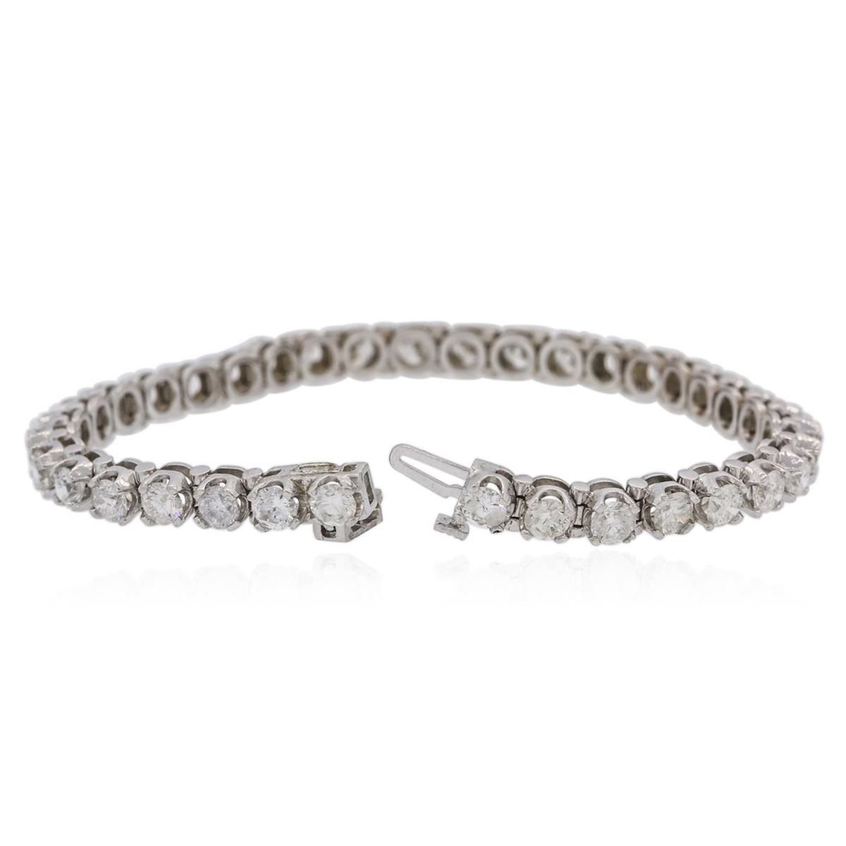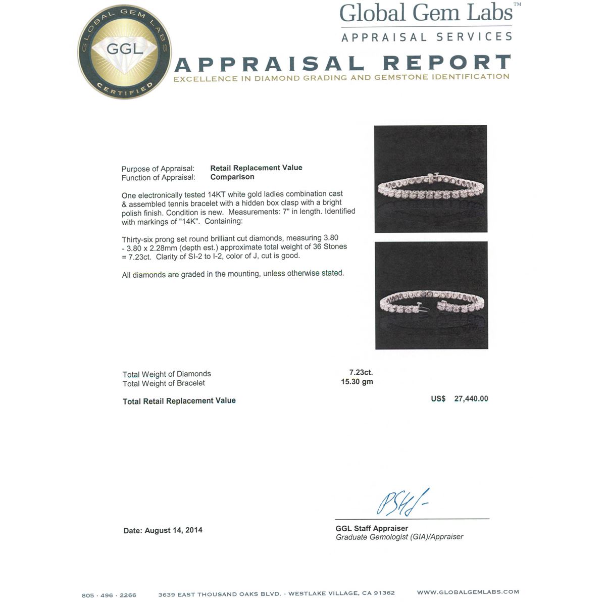One electronically tested 14KT white gold ladies combination cast & assembled tennis bracelet with a hidden box clasp with a bright polish finish. Condition is new. Measurements: 7" in length. Identified with markings of "14K". Containing: Thirty-Six prong set round brilliant cut diamonds, measuring 3.80 - 3.80 x 2.28mm (depth est.) approximate total weight of 36 Stones = 7.23ct. Clarity: SI-2 to I-2. Color: J, Cut is Good. All diamonds are graded in the mounting, unless otherwise stated. Total Weight of Diamonds 7.23ct. Total Weight of Bracelet 15.30 grams. GGL Appraised at $27,440.00.