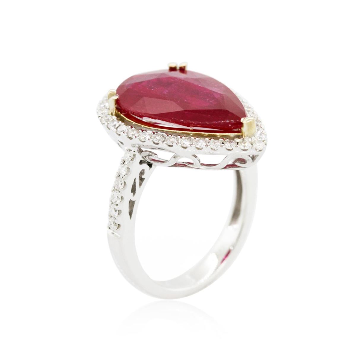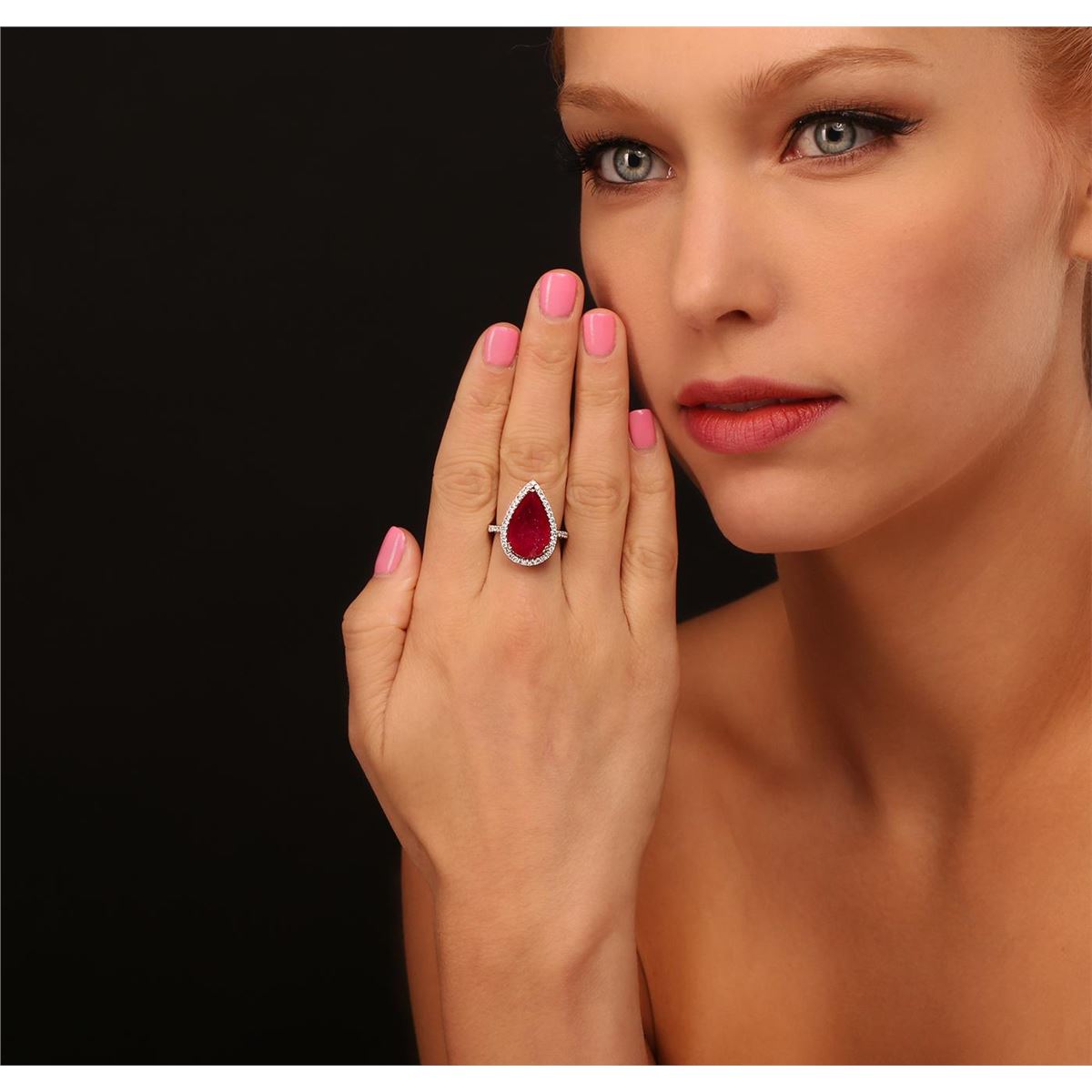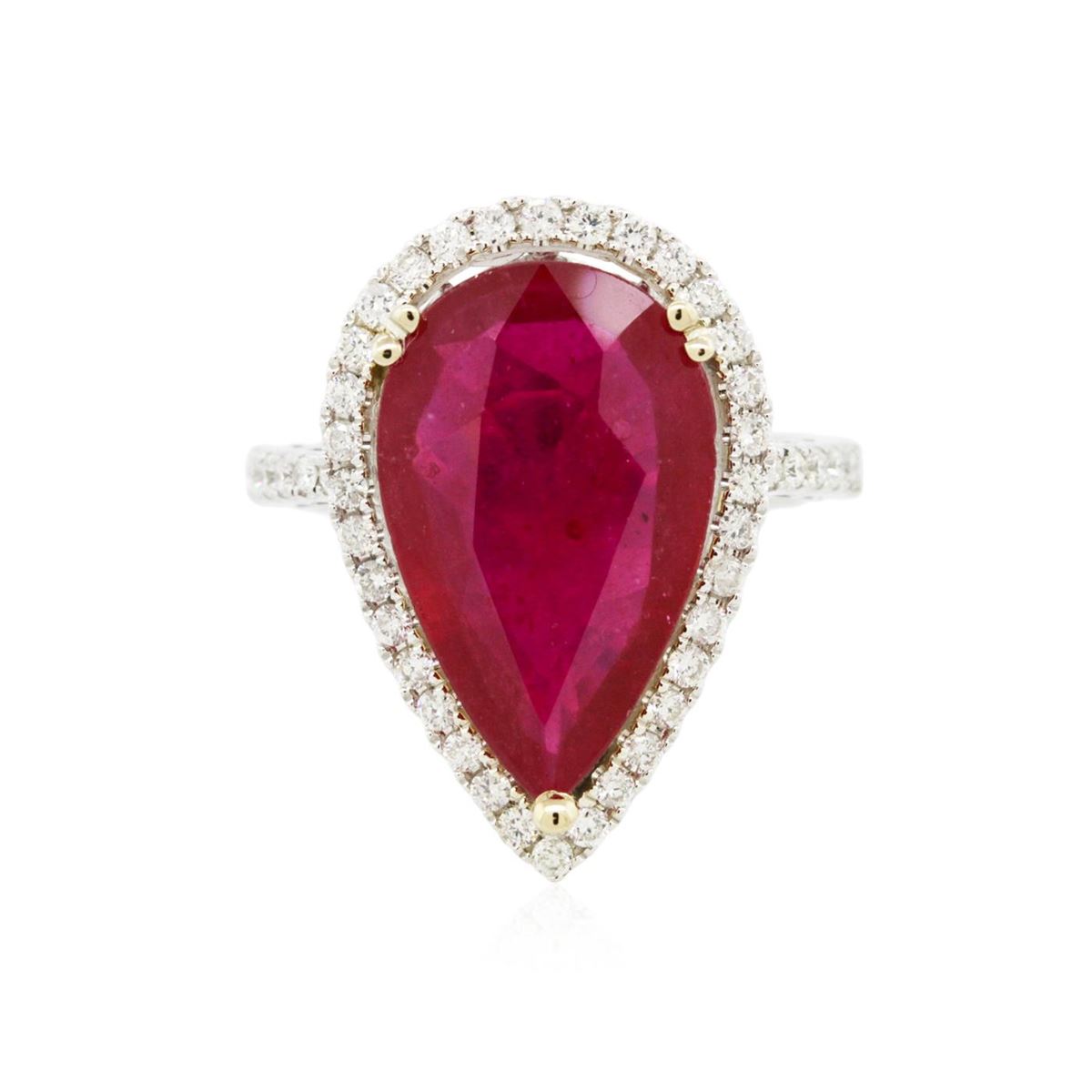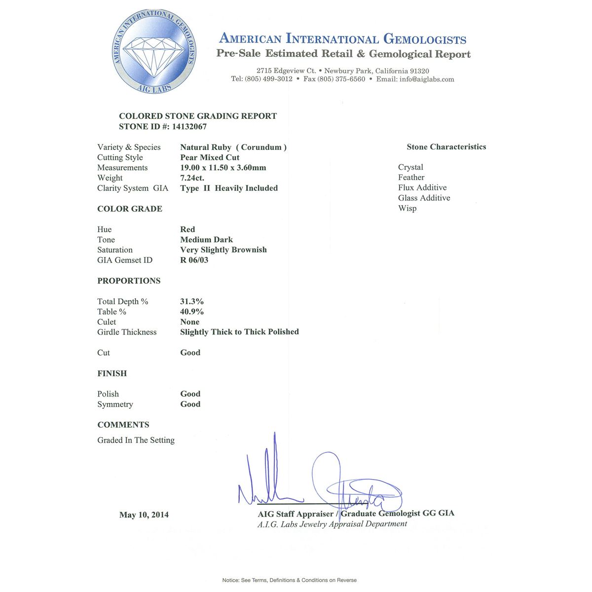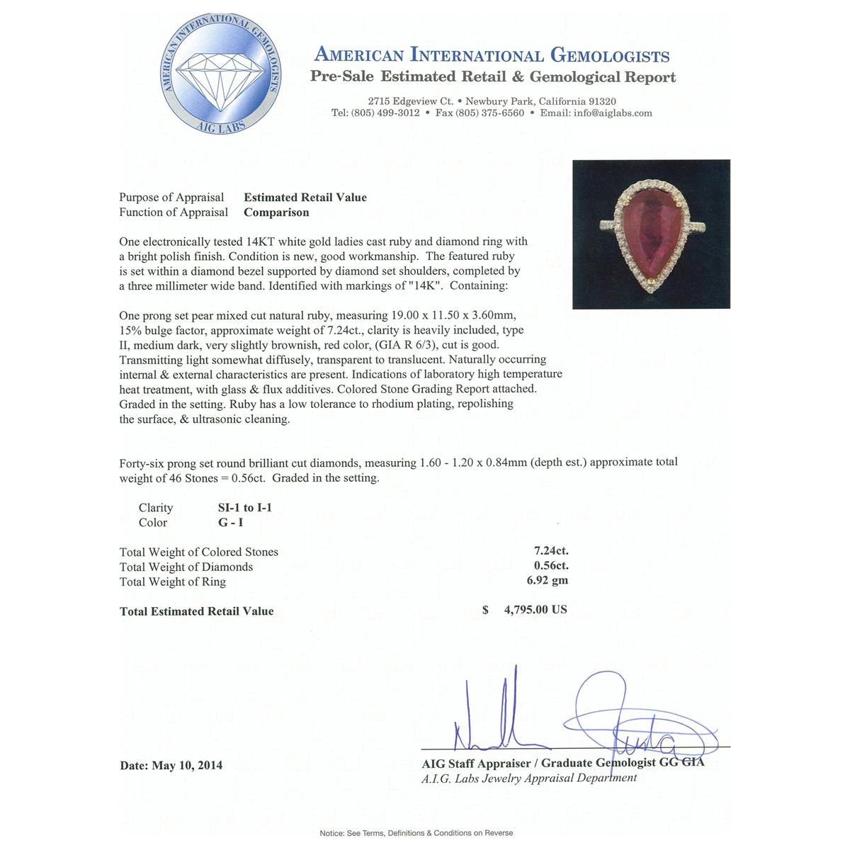 One electronically tested 14KT white gold ladies cast ruby and diamond ring with a bright polish finish. Condition is new, good workmanship. The featured ruby is set within a diamond bezel supported by diamond set shoulders, completed by a three millimeter wide band. Identified with markings of "14K". Containing: One prong set pear mixed cut natural ruby, measuring 19.00 x 11.50 x 3.60mm, 15%. bulge factor, approximate weight of 7.24ct., clarity is heavily included, type II, medium dark, very slightly brownish, red color, (GIA R 6/3), cut is good. Transmitting light somewhat diffusely, transparent to translucent. Naturally occurring internal & external characteristics are present. Indications of laboratory high temperature heat treatment, with glass & flux additives. Colored Stone Grading Report attached. Graded in the setting. Ruby has a low tolerance to rhodium plating, repolishing the surface, & ultrasonic cleaning. Forty-Six prong set round brilliant cut diamonds, measuring 1.60 - 1.20 x 0.84mm (depth est.) approximate. Total Weight of 46 Stones = 0.56ct. Graded in the setting. Clarity: SI-1 to I-1. Color: G - I. Total Weight of Colored Stones 7.24ct. Total Weight of Diamonds 0.56ct. Total Weight of Ring 6.92grams. AIG Appraised at $4,795.00.