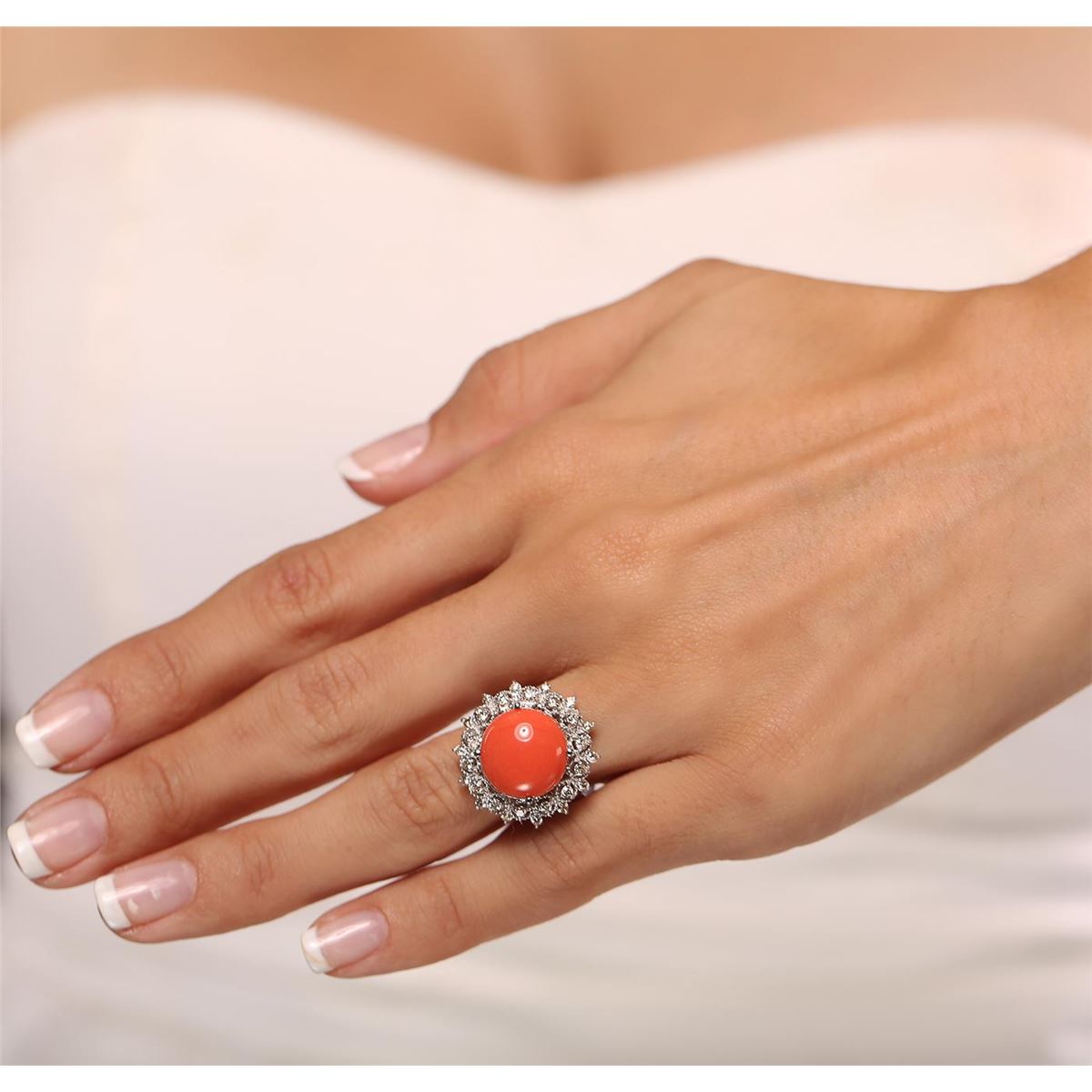 One electronically tested 14KT white gold ladies cast red coral & diamond ring. Condition is new, good workmanship. The featured coral is set within tiered diamond bezels, supported by curved white gold ribbons and a lattice under gallery, completed by a three millimeter wide band. Bright polish finish with milgrain detailing. Identified with markings of "K14". Containing: One prong set round cabochon cut natural red coral, measuring 13.00 x 13.00 x 5.96mm, approximate weight of 7.25ct., clarity is slightly included, medium, slightly brownish, orangy red color, (GIA oR 5/2), cut is good. Graded in the setting. Red Coral (Corallium Japonicum) is formed undersea by microscopic animals called coral polyps. These tiny, creatures form minute, hard shells. As a colony grows, it takes on complex branching, tree-like forms which allows the maximum number of polyps to be fed by the nutrients in the water. It grows about one quarter inch per year. This color of coral is commonly treated to improve or change the color and stability. Evidence that may confirm this is typically lacking. Twenty-eight prong set round brilliant cut diamonds, measuring 1.70 - 1.50 x 0.96mm (depth est.) approximate total weight of 28 Stones = 0.44ct. Graded in the setting. Clarity SI-1 to I- 1. Color J - L. Total Weight of Colored Stones 7.25ct. Total Weight of Diamonds 0.44ct. Total Weight of Ring 7.00gm. AIG Appraised at $4,850.00.