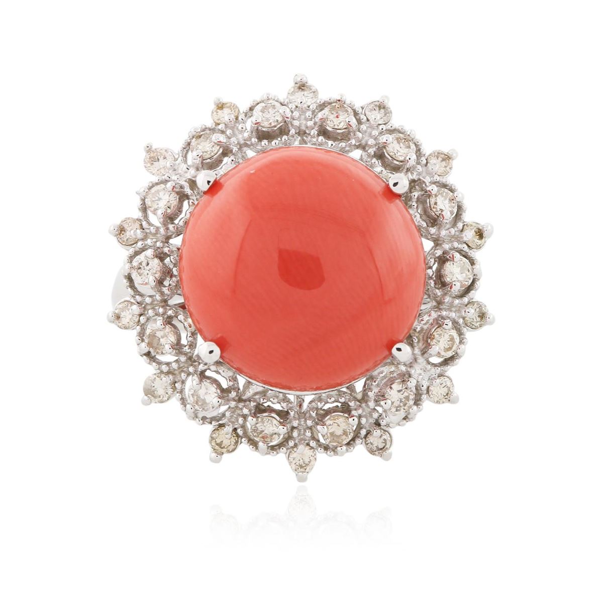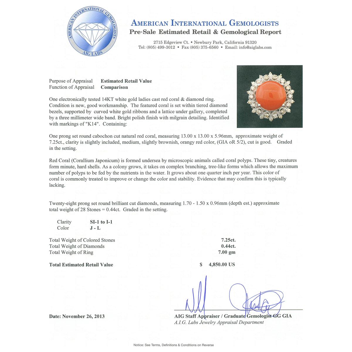 One electronically tested 14KT white gold ladies cast red coral & diamond ring. Condition is new, good workmanship. The featured coral is set within tiered diamond bezels, supported by curved white gold ribbons and a lattice under gallery, completed by a three millimeter wide band. Bright polish finish with milgrain detailing. Identified with markings of "K14". Containing: One prong set round cabochon cut natural red coral, measuring 13.00 x 13.00 x 5.96mm, approximate weight of 7.25ct., clarity is slightly included, medium, slightly brownish, orangy red color, (GIA oR 5/2), cut is good. Graded in the setting. Red Coral (Corallium Japonicum) is formed undersea by microscopic animals called coral polyps. These tiny, creatures form minute, hard shells. As a colony grows, it takes on complex branching, tree-like forms which allows the maximum number of polyps to be fed by the nutrients in the water. It grows about one quarter inch per year. This color of coral is commonly treated to improve or change the color and stability. Evidence that may confirm this is typically lacking. Twenty-eight prong set round brilliant cut diamonds, measuring 1.70 - 1.50 x 0.96mm (depth est.) approximate total weight of 28 Stones = 0.44ct. Graded in the setting. Clarity SI-1 to I- 1. Color J - L. Total Weight of Colored Stones 7.25ct. Total Weight of Diamonds 0.44ct. Total Weight of Ring 7.00gm. AIG Appraised at $4,850.00.