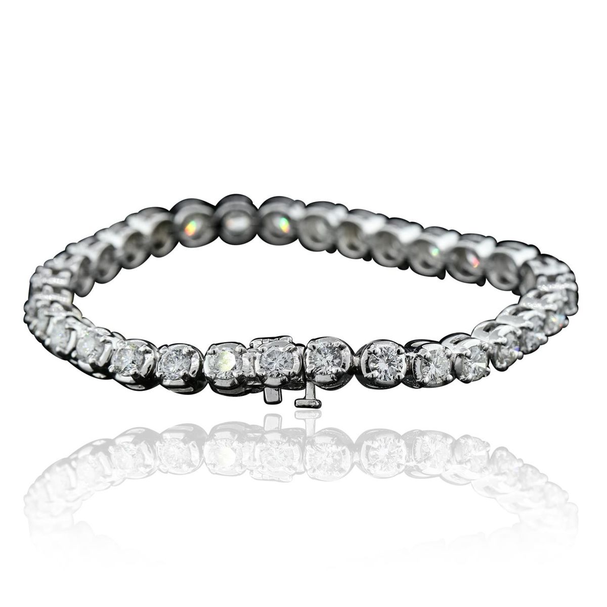 One electronically tested 14KT white gold ladies combination cast & assembled tennis bracelet with a hidden box clasp with a bright polish finish. Condition is new. Measurements: 7" in length. Identified with markings of "14K". Containing: Thirty-One prong set round brilliant cut diamonds, measuring 4.00 - 4.00 x 2.40mm (depth est.) approximate total weight of 31 Stones = 7.26ct. Clarity: SI-1 to I-1. Color: G - J, Cut is Good. All diamonds are graded in the mounting, unless otherwise stated. Total Weight of Diamonds 7.26ct. Total Weight of Bracelet 18.80 grams. GGL Appraised at $34,470.00.